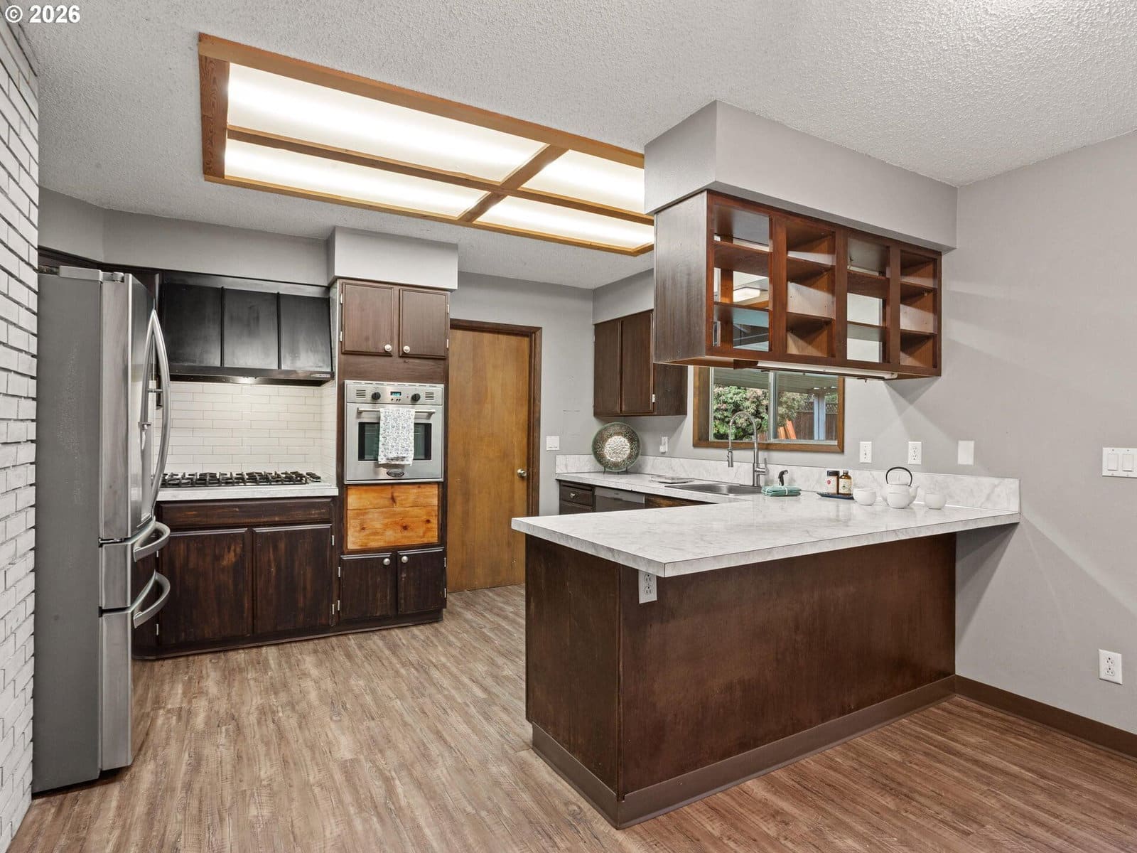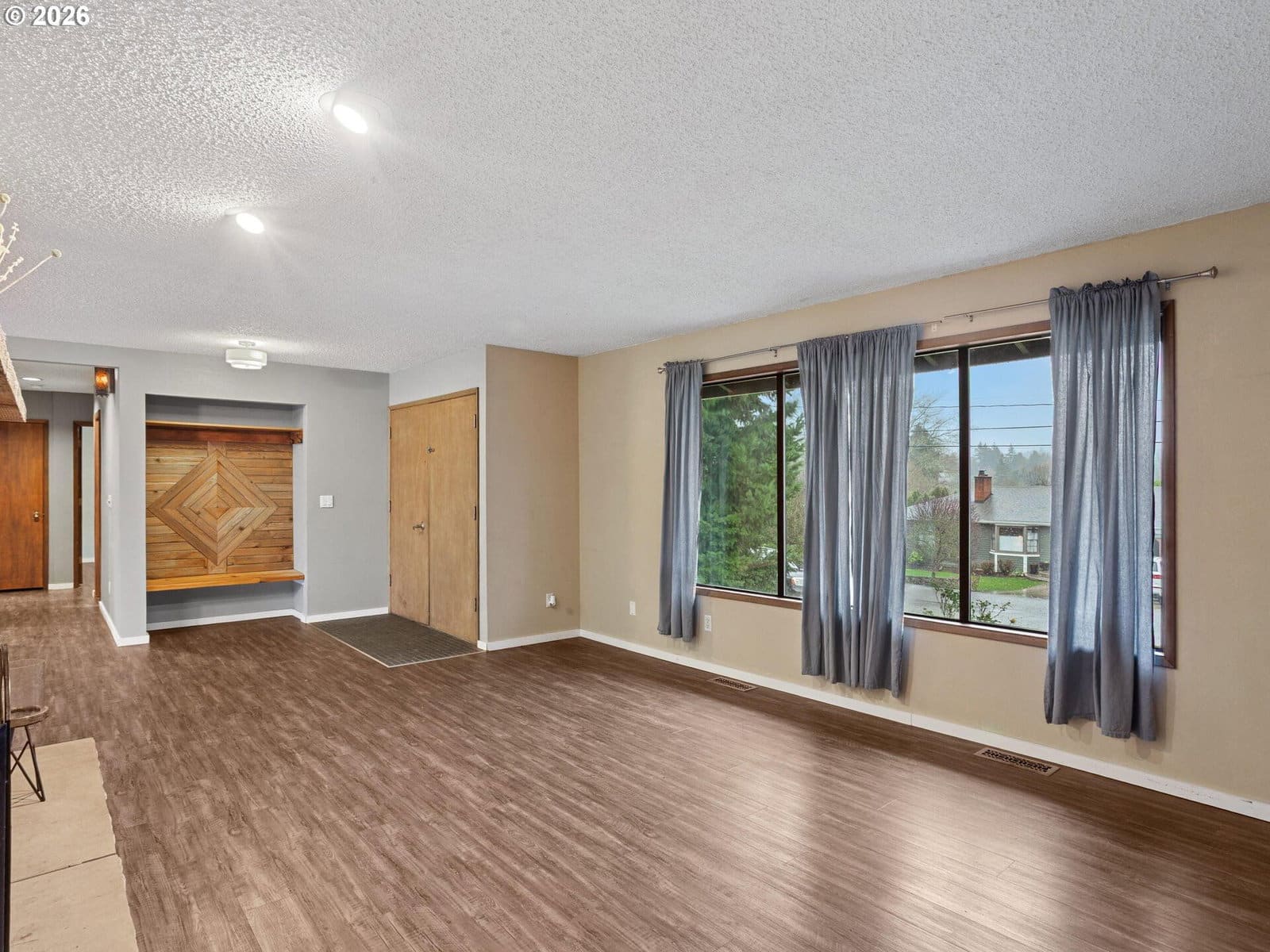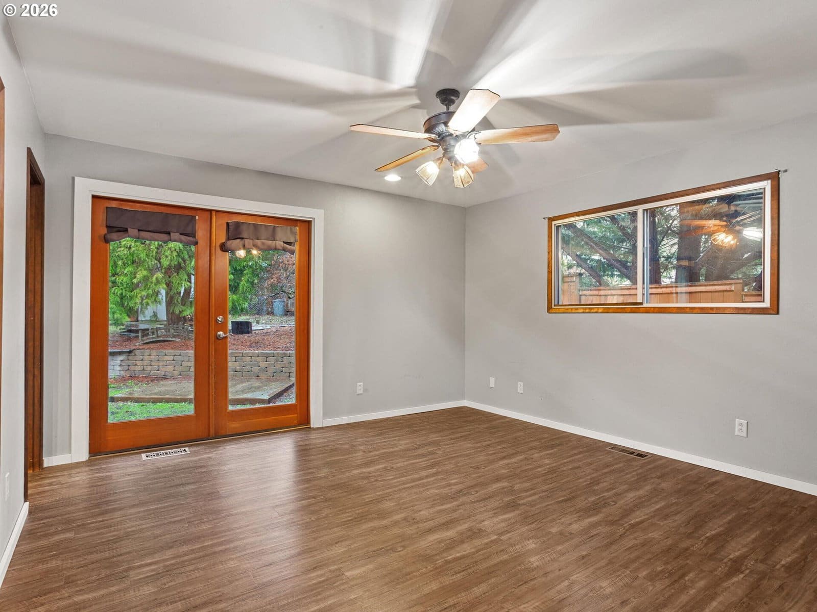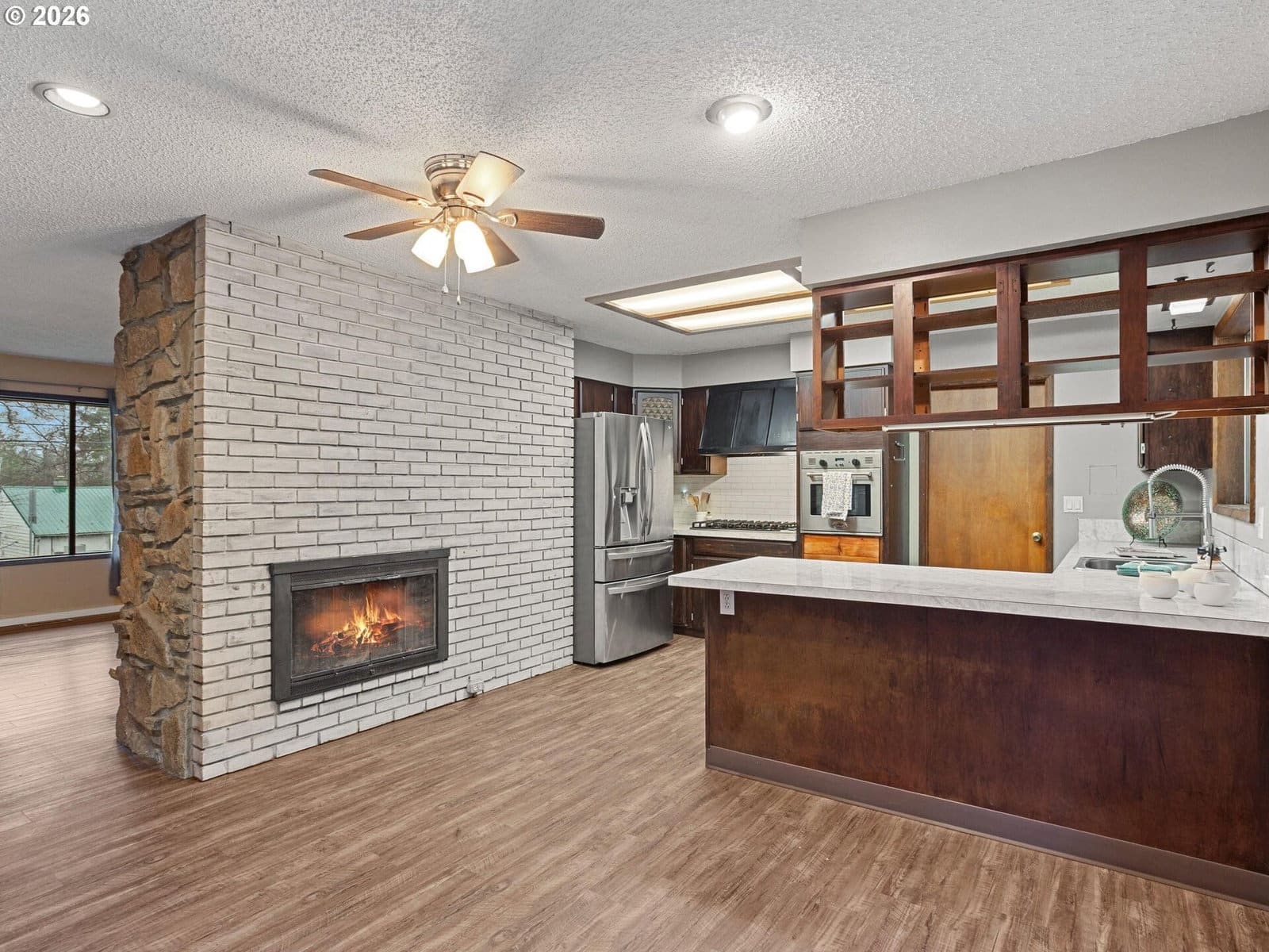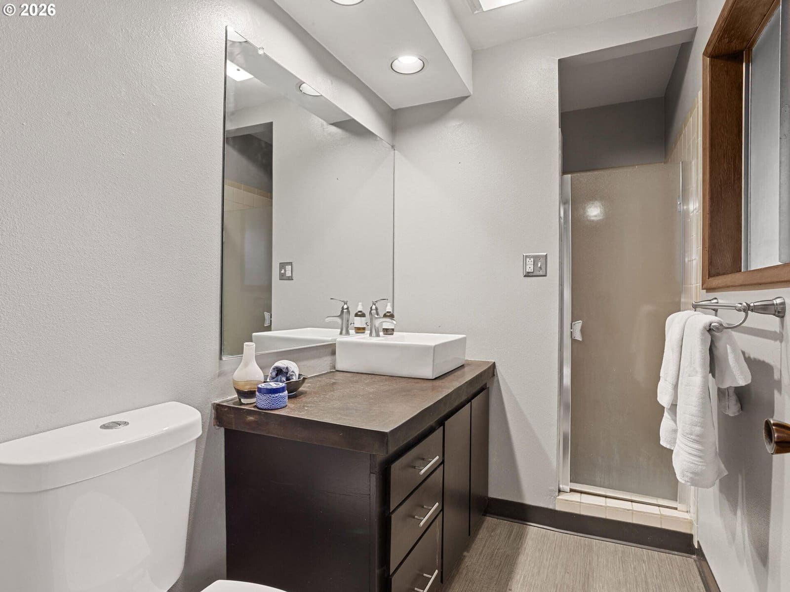 Mid-Century Modern Ranch Dream in Excellent Vermont Hills Location! Enter the hand scraped wood entry through oversized double doors, into this tastefully updated home, with thoughtful consideration to character and charm of mid-century living. Hand crafted wood paneled entry cove bench with area for shoe and coat storage, vinyl plank wood like floors throughout. Open living room with stately double sided brick fireplace, complete with large picture windows, overlooks the tree lined view of SW Portland. Spacious kitchen with plenty of storage and stainless steel appliances. Dining area with double doors leading to terraced backyard, garden beds, flat seating or possible firepit area, and hot tub pad with hookup. 3 full bedrooms, complete with primary suite and full updated bath with poured concrete countertops, custom overmount sink, and designer mirror and lighting. Patio door in primary leading to spacious and private backyard setting, with concrete pad, perfect for patio seating or a hot tub. Built-in shelving and desk in second bedroom. Oversized two car garage with additional workspace for hobbies and toys. Garage stairs lead down to finished storage area, perfect for hobbies, play, storage, or bring your imagination. Pool table included. New 25-year composition roof to be installed and included prior to closing. Open house Sunday, 01/11, from 11am - 1pm. [Home Energy Score = 5. HES Report at https://rpt.greenbuildingregistry.com/hes/OR10243343]