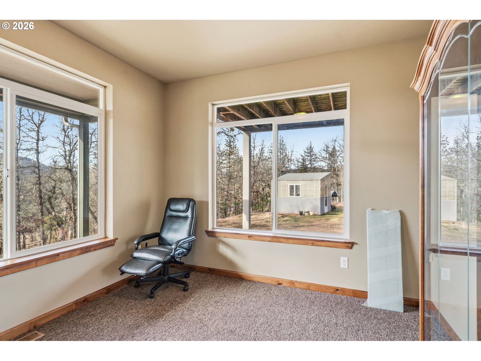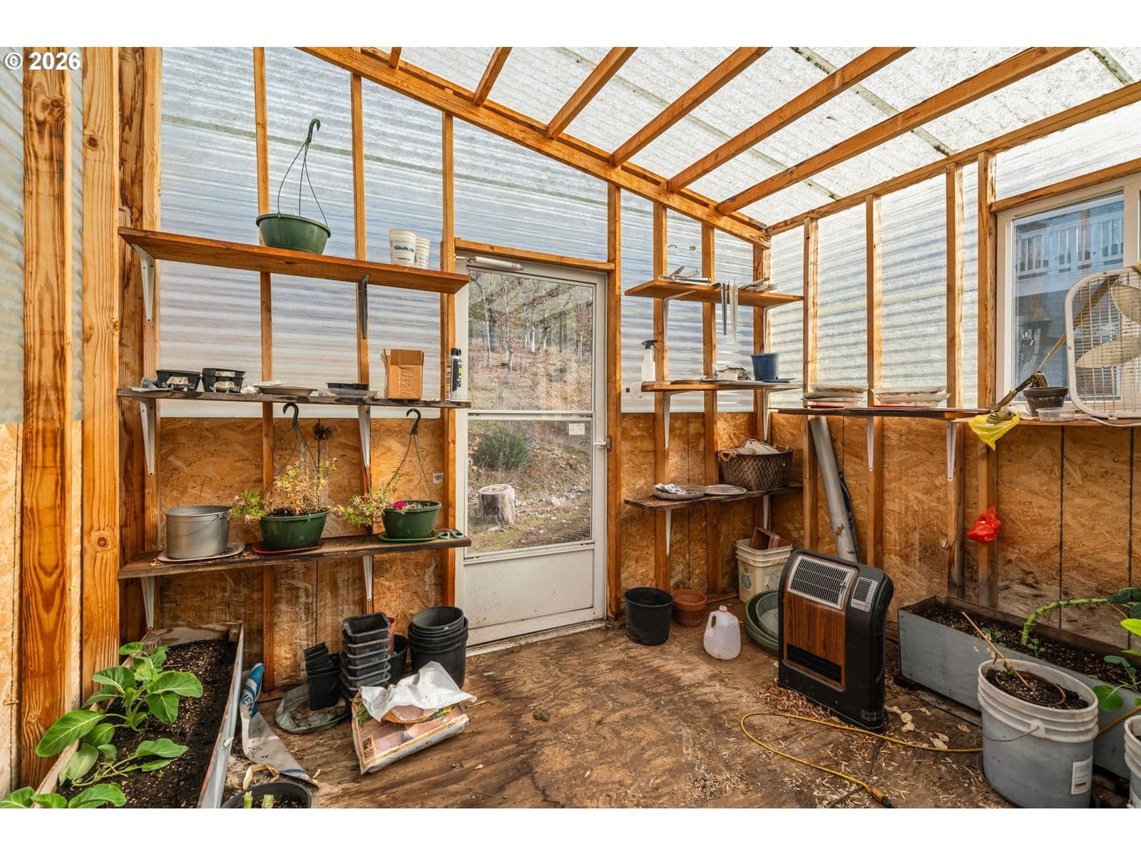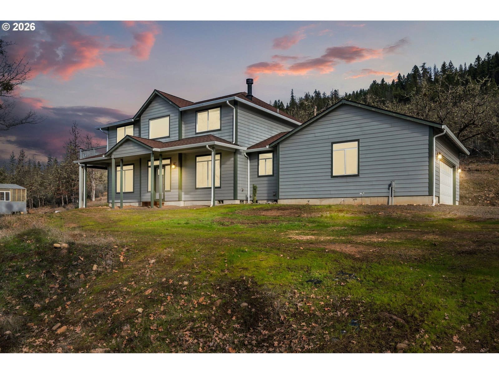 Gorgeous 2,512 sq ft home with 156.04-acres of hunting and recreational property offering privacy, wildlife, and sweeping 360-degree mountain views. Located near Rogue River trophy fishing waters and just minutes from Lost Creek Lake, this property provides exceptional access to fishing, boating, hunting, and outdoor recreation while offering a well-designed home base for year-round living. The home is thoughtfully laid out for true multi-generational living. The main floor includes a private bedroom suite with a full bath, walk-in closet, and French doors opening to the backyard—ideal for extended family or guests. The open-concept living space is filled with natural light and features a kitchen with eat-bar seating, stainless steel appliances, and tile backsplash, flowing into a bright dining area with exterior access. High ceilings and a wood-burning fireplace anchor the living room, creating a warm gathering space after a day outdoors. A dedicated main-floor office adds flexibility for remote work or property management, while a convenient guest half bath completes the level.Upstairs, a spacious loft-style living area with a closet and French doors opens to a deck with expansive mountain and territorial views, offering flexible use as a second living space or bunk area. The primary suite serves as a private retreat with a large bathroom featuring a walk-in shower, soaking tub, double vanity, and walk-in closet.The land is the true highlight, with open and wooded terrain supporting abundant wildlife and year-round hunting opportunities. A greenhouse near the home allows for extended growing seasons, a woodshed stocked with split firewood is ready for use, and cleared, fenced paddocks are ideal for livestock or animals. An expansive cleared area for a gun range, target practice, skeet, or clay pigeon use, along with fully owned solar panels, round out this property—making it perfect for the outdoors enthusiast. This is multi-generational living at its best.