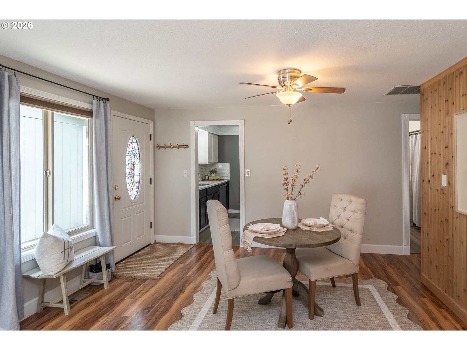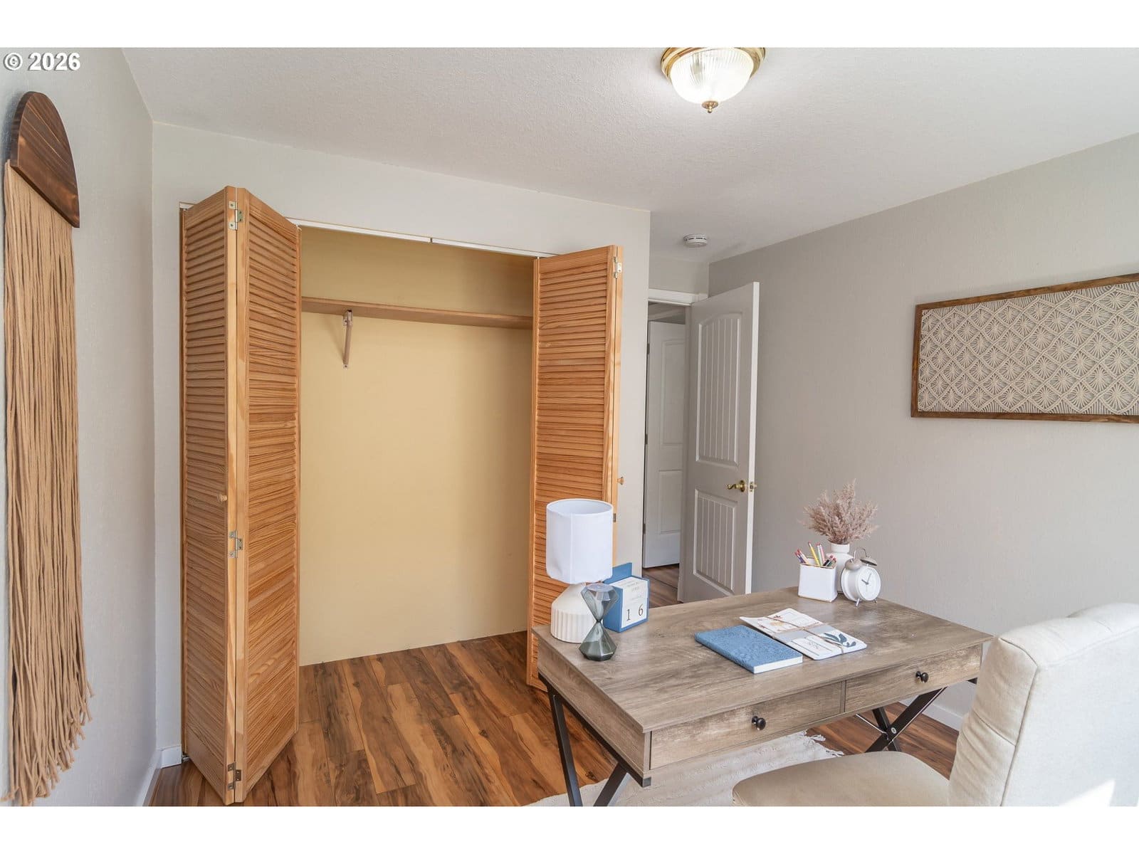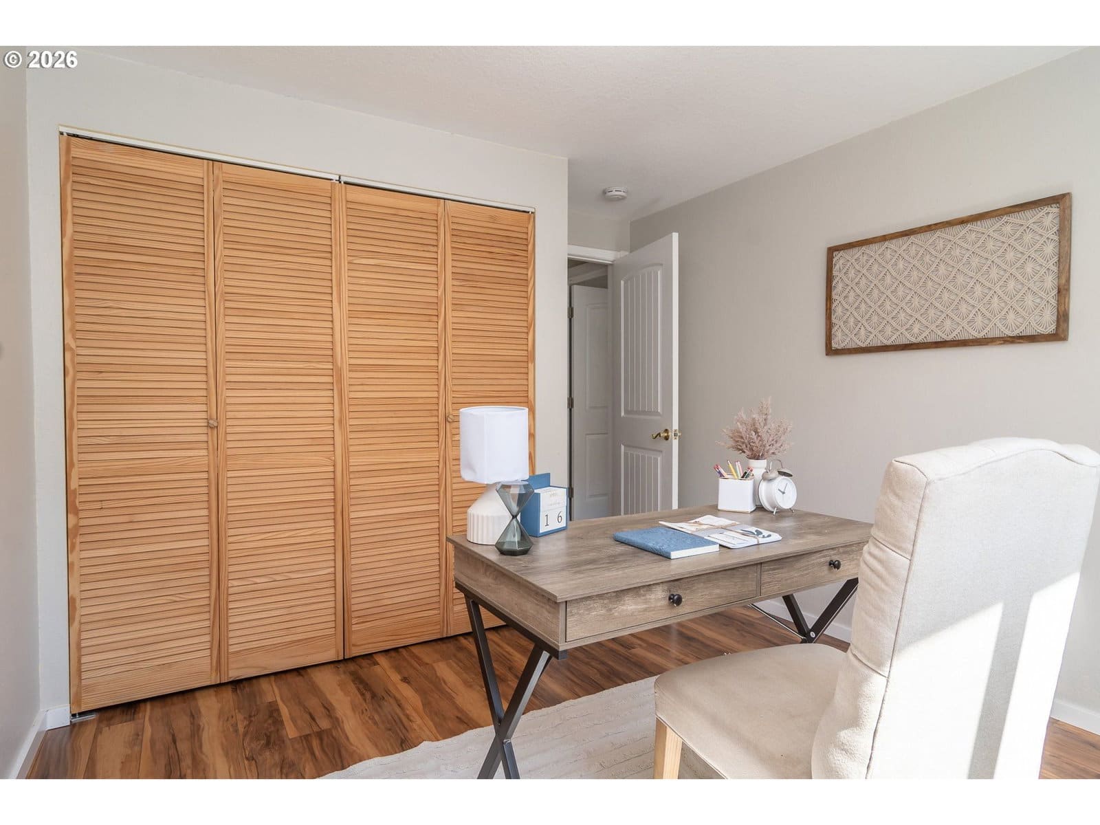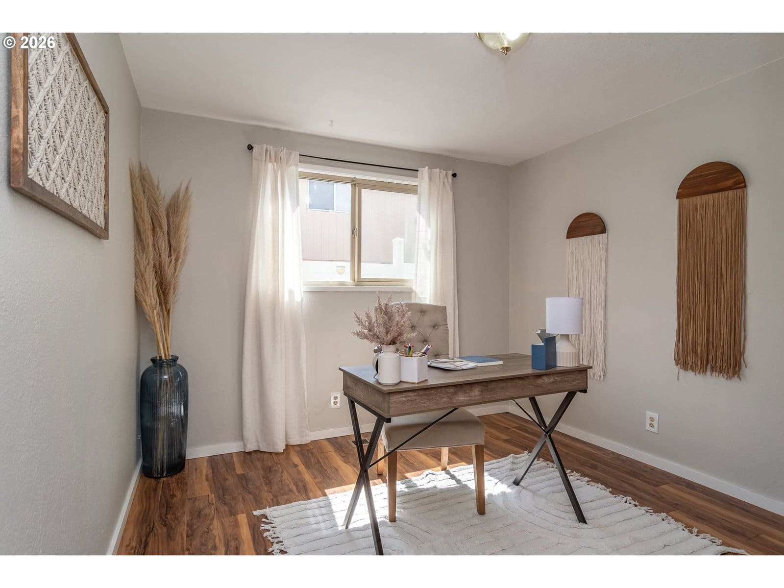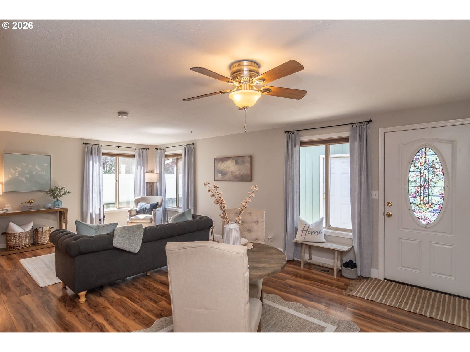 Charming move-in ready 3-bedroom condo tucked into a quiet neighborhood. HOA is $325/month and includes water, sewer, garbage; exterior yard maintenance, pest control as well as exterior maintenance/repair/replacement on roof, gutters, and garage doors. Easy-care laminate flooring runs throughout the home. The kitchen features stainless steel appliances. The primary bedroom offers a walk-in closet and french doors that open to a private covered deck and vinyl-fenced backyard—perfect for relaxing or entertaining. Detached extra-deep garage with workbench and storage. The driveway offers tandem parking, providing additional convenience.