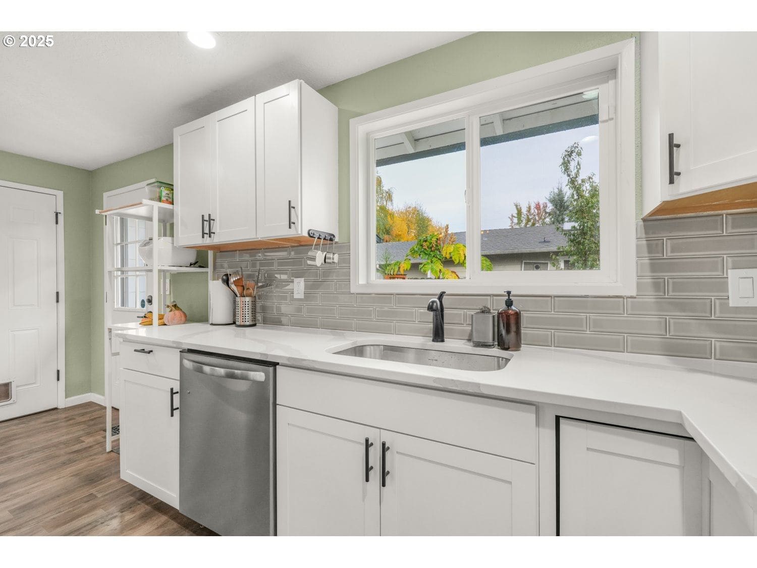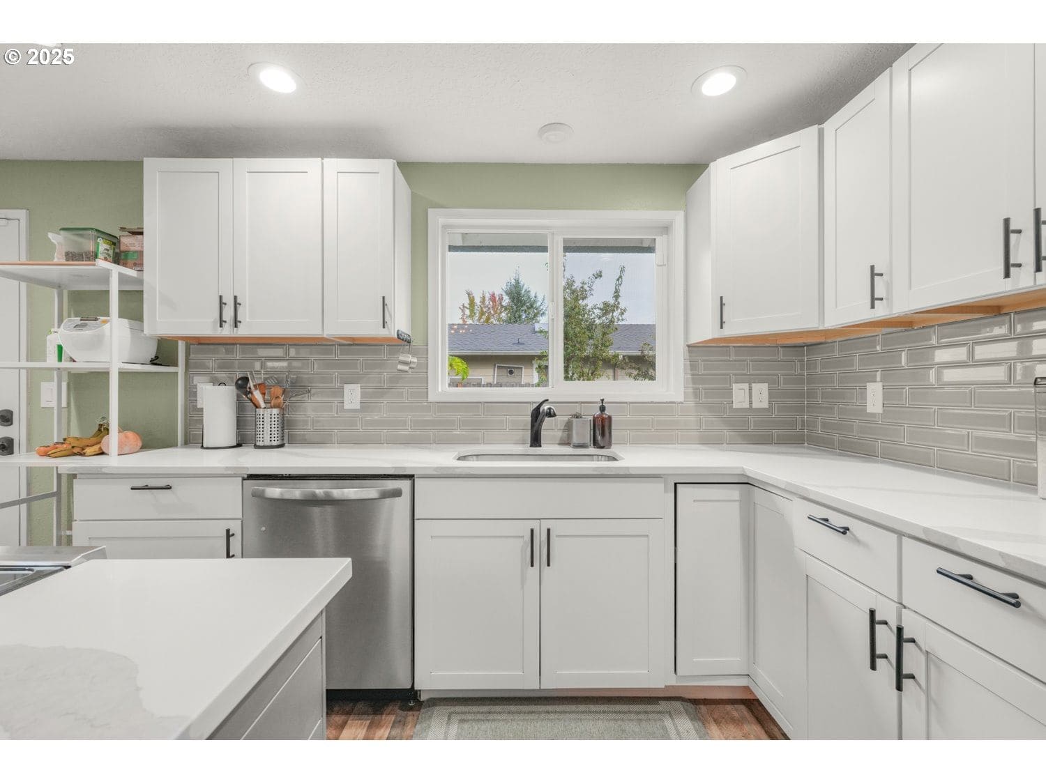 Updated Contemporary Ranch in Prime North Portland Location! Beautifully updated and remodeled, this contemporary ranch offers 3 bedrooms and 1 bath with stylish modern touches throughout. Gorgeous engineered hardwood floors, custom shiplap paneling, and elegant Paloma porcelain tile create a warm, cohesive design. Enjoy open-concept living with a spacious living room featuring a cozy wood-burning fireplace, flowing seamlessly into a light, bright kitchen. The kitchen shines with quartz countertops, a cook island with eating bar, stainless steel appliances, and sleek porcelain tile finishes. Set on a large, fully fenced lot in a quiet neighborhood, the private backyard is perfect for entertaining or relaxing, with a patio, fruit trees and raised garden beds. Located just blocks from University Park and Columbia Pool, with a fantastic Bike Score of 88 for the active lifestyle. Minutes to Heron Lakes, Columbia Edgewater, Riverside, and Broadmoor Golf Clubs, and a quick commute to PDX airport. This move-in ready home blends comfort, design, and convenience.