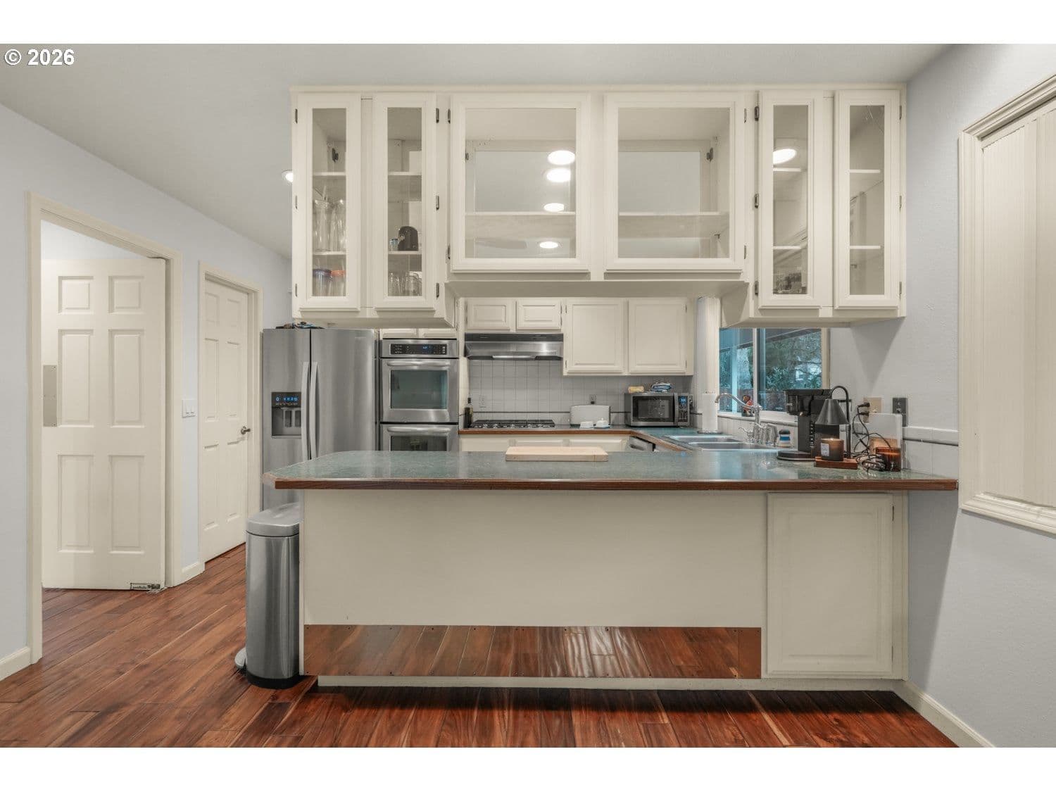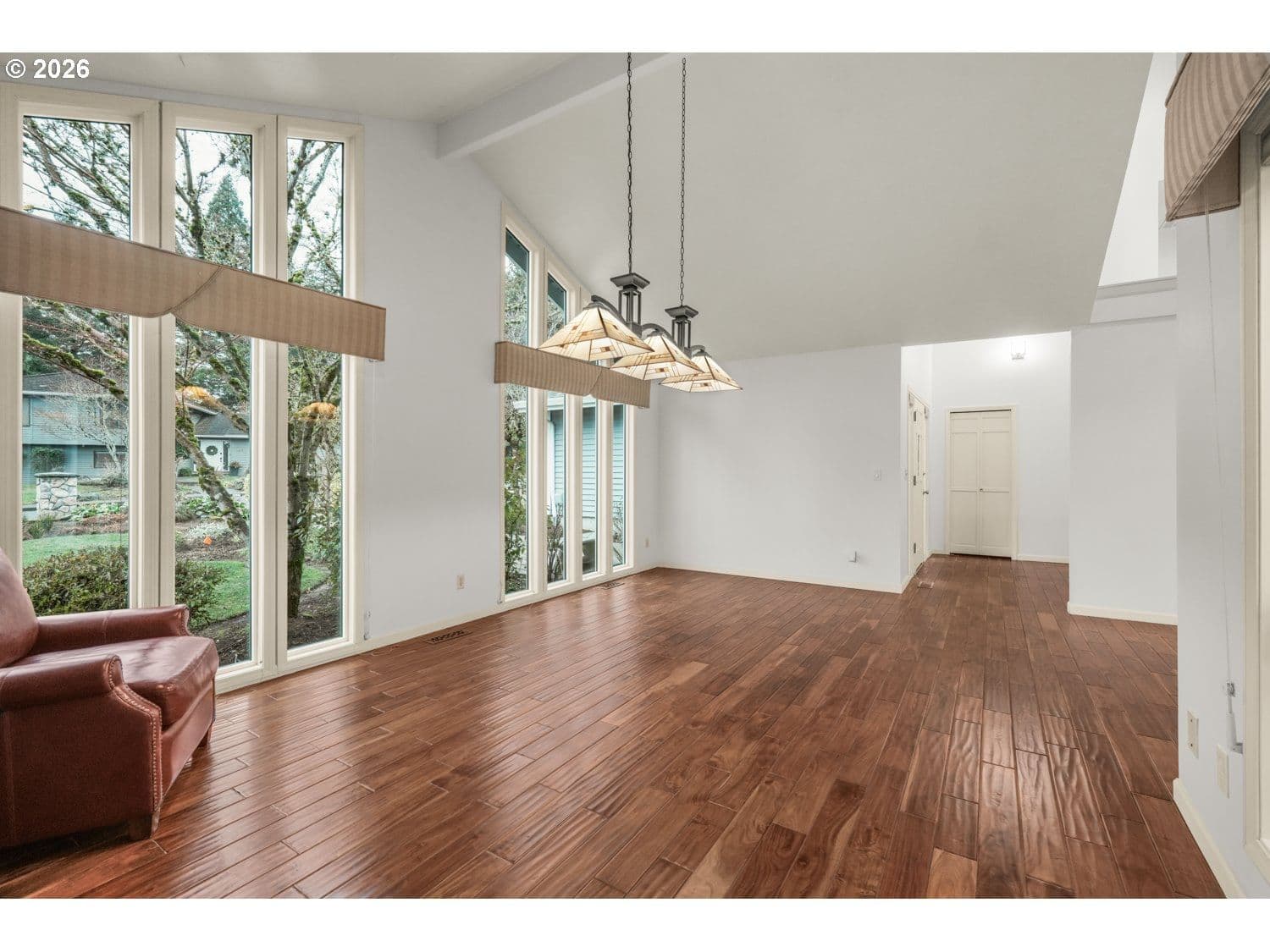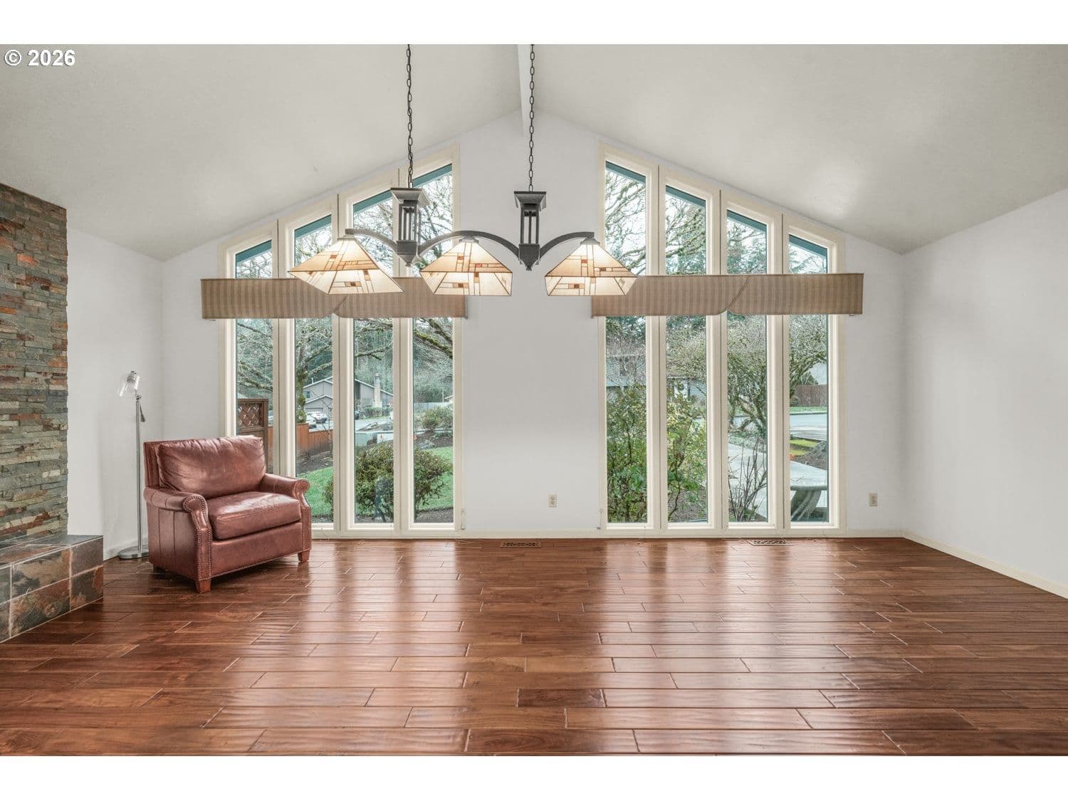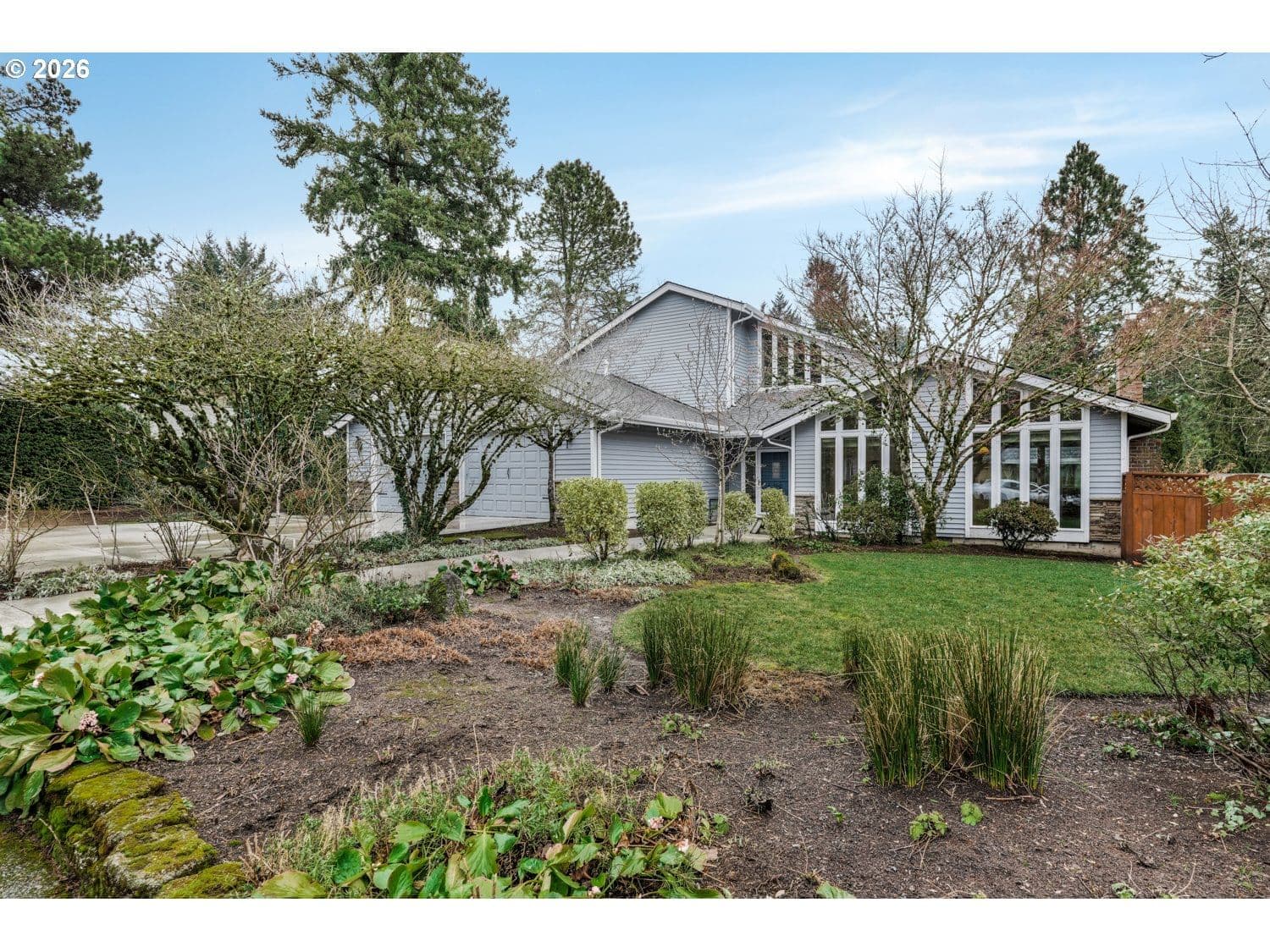 Stunning upscale contemporary home set on a private .24-acre lot surrounded by mature trees and territorial views. Bright and airy with vaulted ceilings, floor-to-ceiling windows, and gorgeous hardwood floors throughout. This home is designed for effortless living and entertaining. The inviting living room features soaring ceilings and a dramatic stacked-stone wood-burning fireplace. Chef’s kitchen offers stainless steel appliances, eat-bar seating, pantry, and seamless flow to gathering spaces. Spacious family room showcases another fireplace, vaulted ceiling, custom built-ins, and a wet bar that's perfect for hosting. Indoor-outdoor living shines with two sets of sliders from the family room to a private patio and a large 41x13 covered deck overlooking the in-ground pool and hot tub. Fully fenced backyard provides exceptional privacy with raised garden beds and room to relax or play. Main-level primary suite includes double closets, private bath with dual vanity, and direct access to the covered deck and pool. Second bedroom on main level is ideal for a private office or guest space. Upstairs features two generous bedrooms, a full guest bath, and a versatile bonus room with skylight that's perfect for a media room, guest retreat, or creative space. Ideally located close to dining, shopping, schools, neighborhood parks, and nature trails. A rare blend of privacy, style, and lifestyle, this home truly has it all.