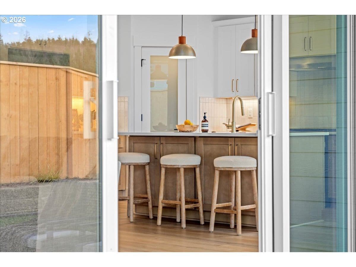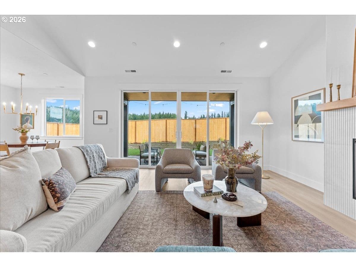 New single-story Modern Northwest home with warm natural finishes and a backdrop of open space. Clean exterior lines with natural wood and metal accents, landscaped grounds, and a fenced backyard. Interior offers warm wood shaker lower cabinets with brass hardware, quartz slab countertops, brass hammered pendant lighting, a butler pantry, and a flexible range setup for gas or electric (gas range included). The living room features a fluted stone style fireplace, vaulted ceilings, and large sliding doors opening to a covered patio with built-in ambiance lighting. The spa-inspired primary suite showcases a floor-to-ceiling glass waterfall shower with a vertical wood-tone fluted wall, soaking tub, and dual sinks. Short walk to the community park. Bonus parking, home fire sprinkler system, and a 1-year builder’s warranty included.
