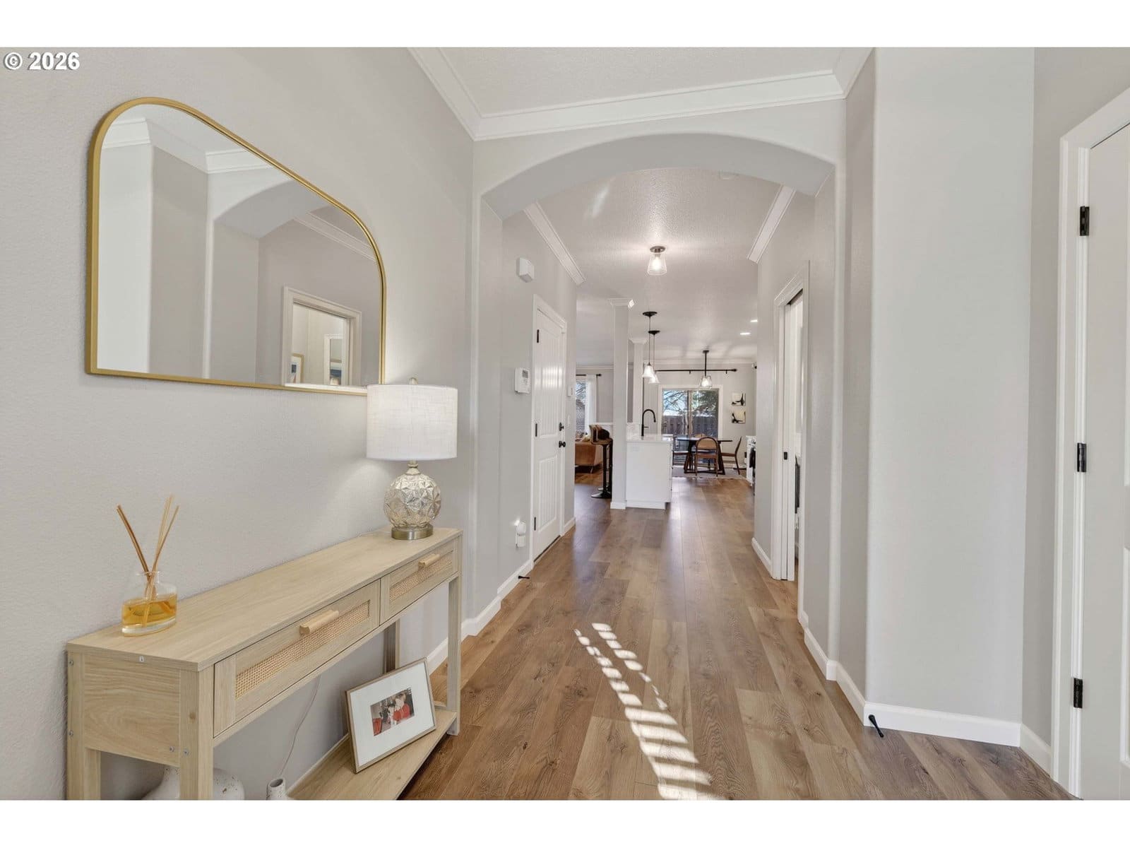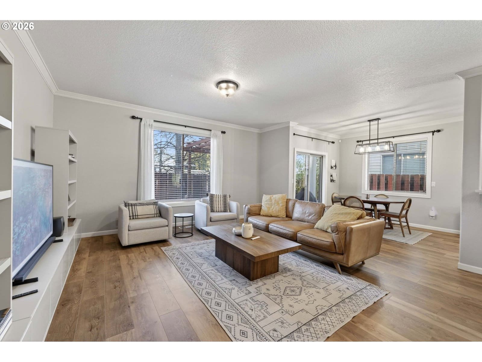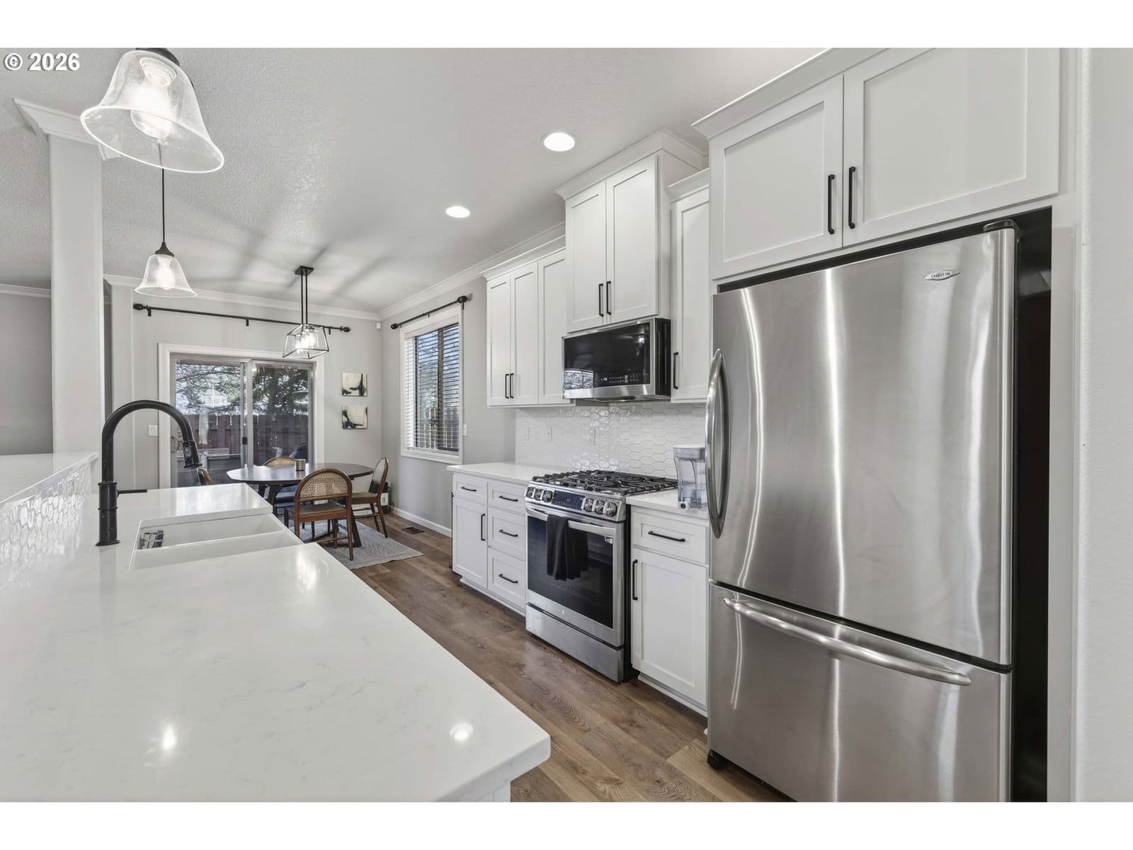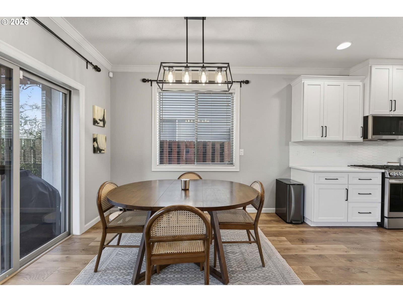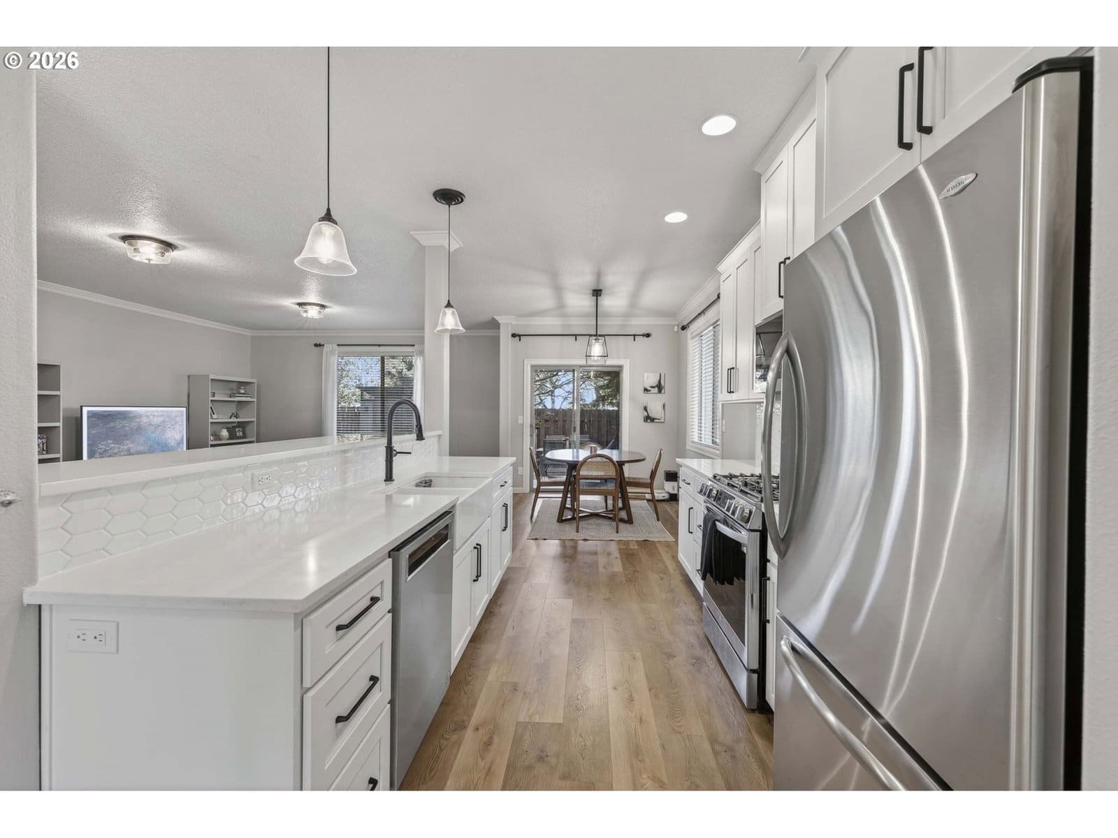 Welcome to this beautifully remodeled 4-bedroom, 2.5-bath home featuring an open concept floor plan and numerous premium upgrades. The entire downstairs boasts new laminate hardwood floors, crown molding, and upgraded paint, creating a bright and elegant living space. The gourmet kitchen includes soft-close cabinets, quartz countertops, and brand new stainless steel appliances: dishwasher, oven, and microwave. Light fixtures, faucets, and cabinet hardware throughout the home have all been recently upgraded. Enjoy a private backyard that backs to a city-owned green space, offering a tranquil retreat. Don't miss out on this stunning, move-in ready home! Seller is a licensed Oregon real estate agent/the listing agent.