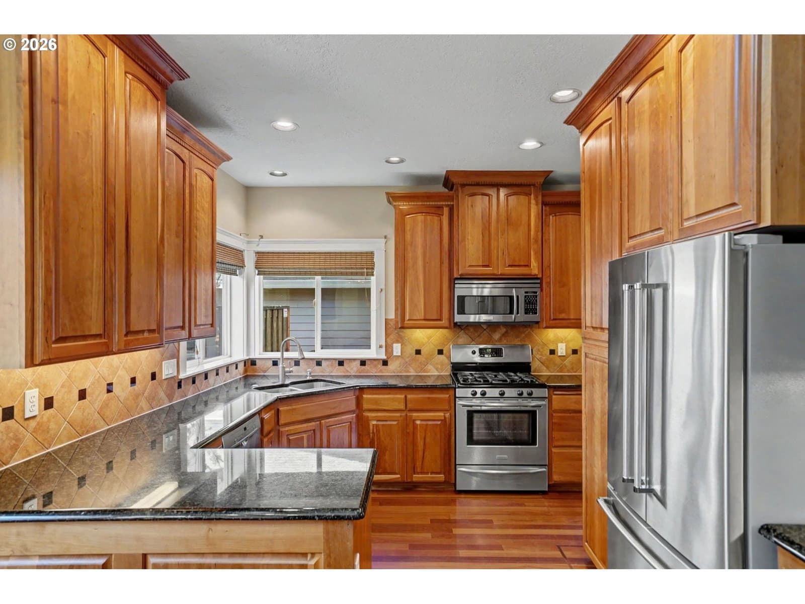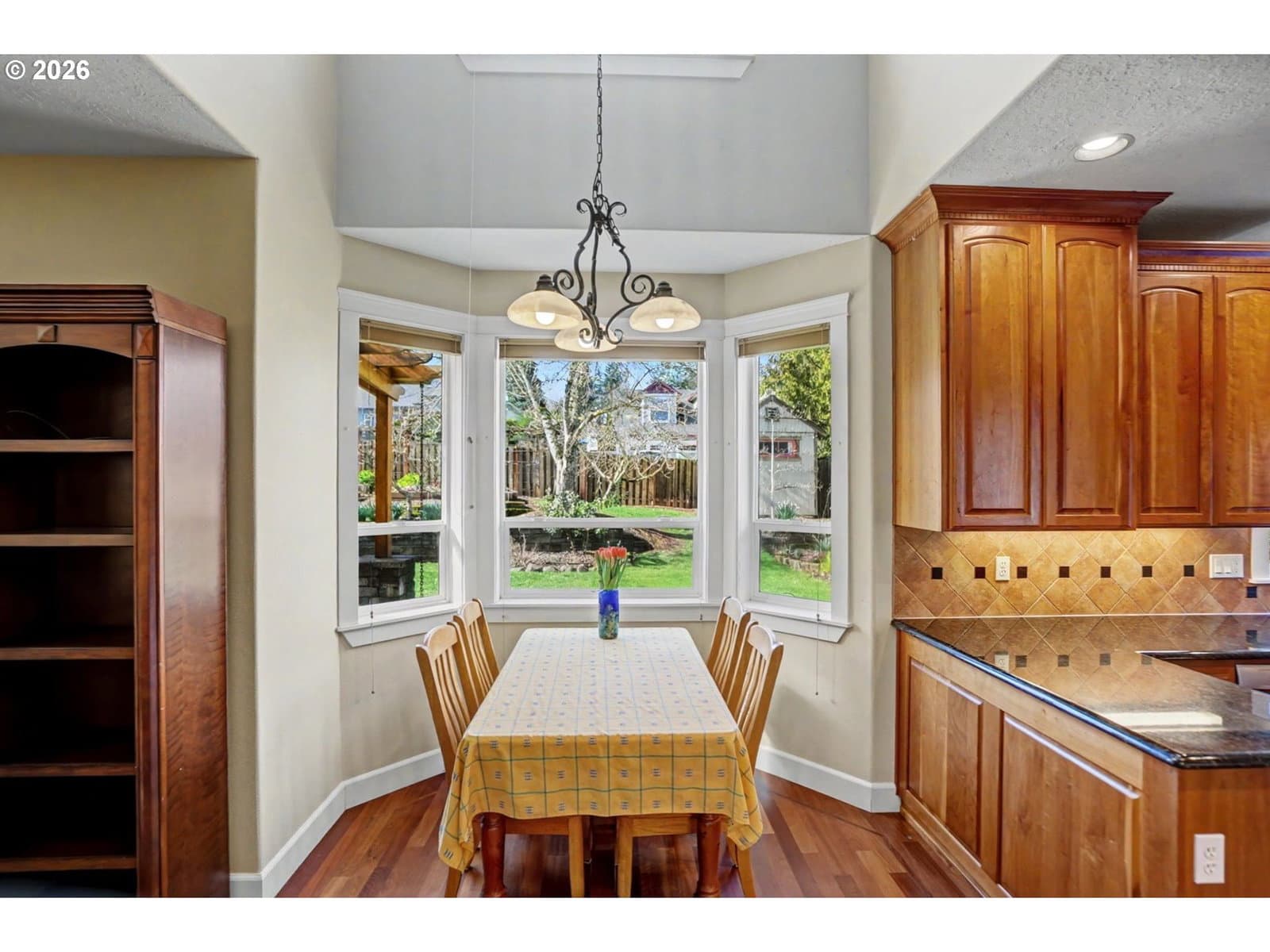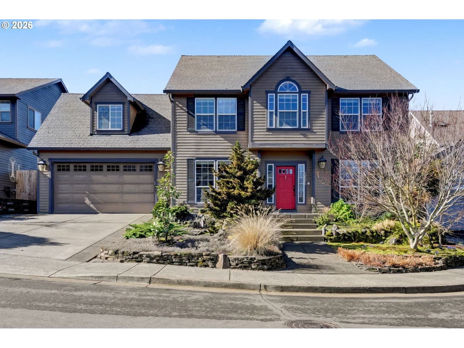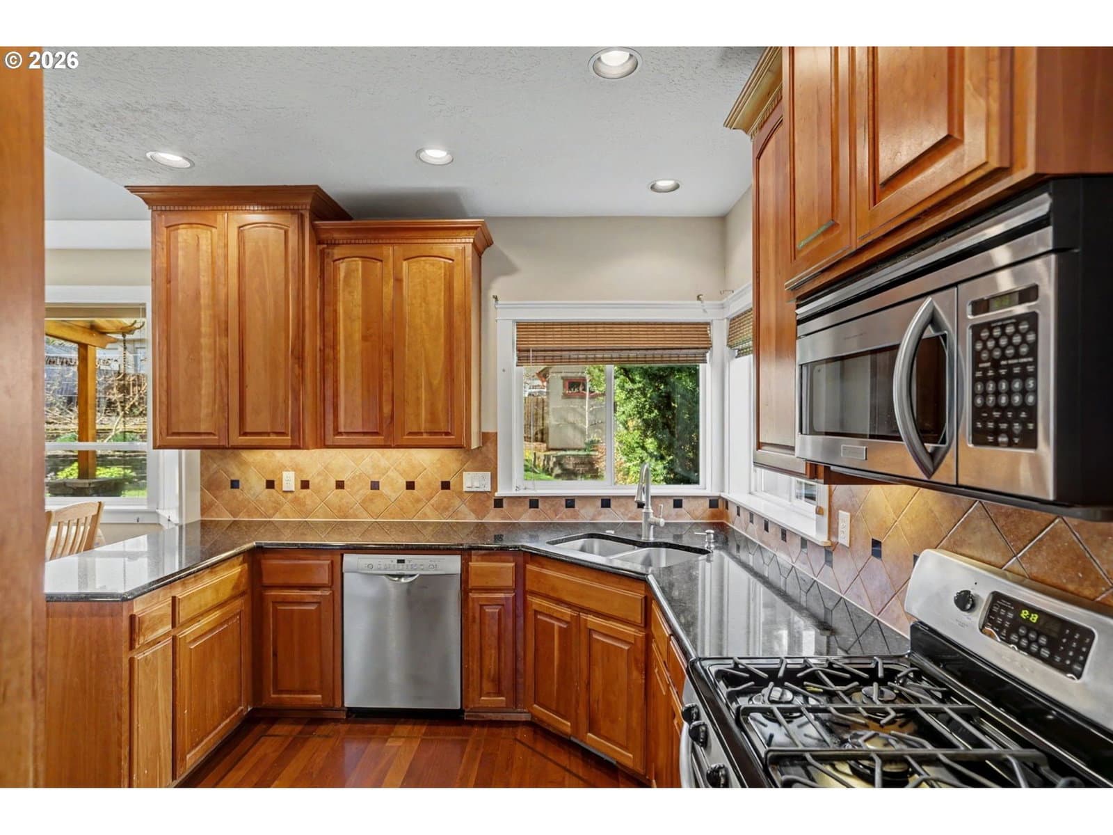 Well-maintained and very energy efficient 4 bed, 2.5 bath home offering 2,627 SF on a quiet cul-de-sac. Flexible layout includes a main floor bedroom, formal living & dining rooms, and both living and family rooms, each with gas fireplaces. Light-filled nook off the gourmet kitchen featuring granite countertops, cherry cabinetry, stainless Frigidaire appliances, and a walk-in pantry. Cherry cabinets continue throughout the bathrooms and laundry room for a cohesive, high-quality finish. Hardwood flooring on the main level. Spacious bonus room provides ideal space for media, office, or playroom. Primary suite features a walk-in closet, jetted tub, walk-in shower, and vaulted sitting/retreat area. Dual heating and cooling systems provide efficient comfort year-round. Central vacuum and central speakers included. The backyard is a true highlight with seven raised garden beds, fruit trees, grapevines, and abundant flowering plants, all within a fully fenced and beautifully landscaped setting. Covered patio, sprinklers, garden shed, and plenty of space to relax or entertain.