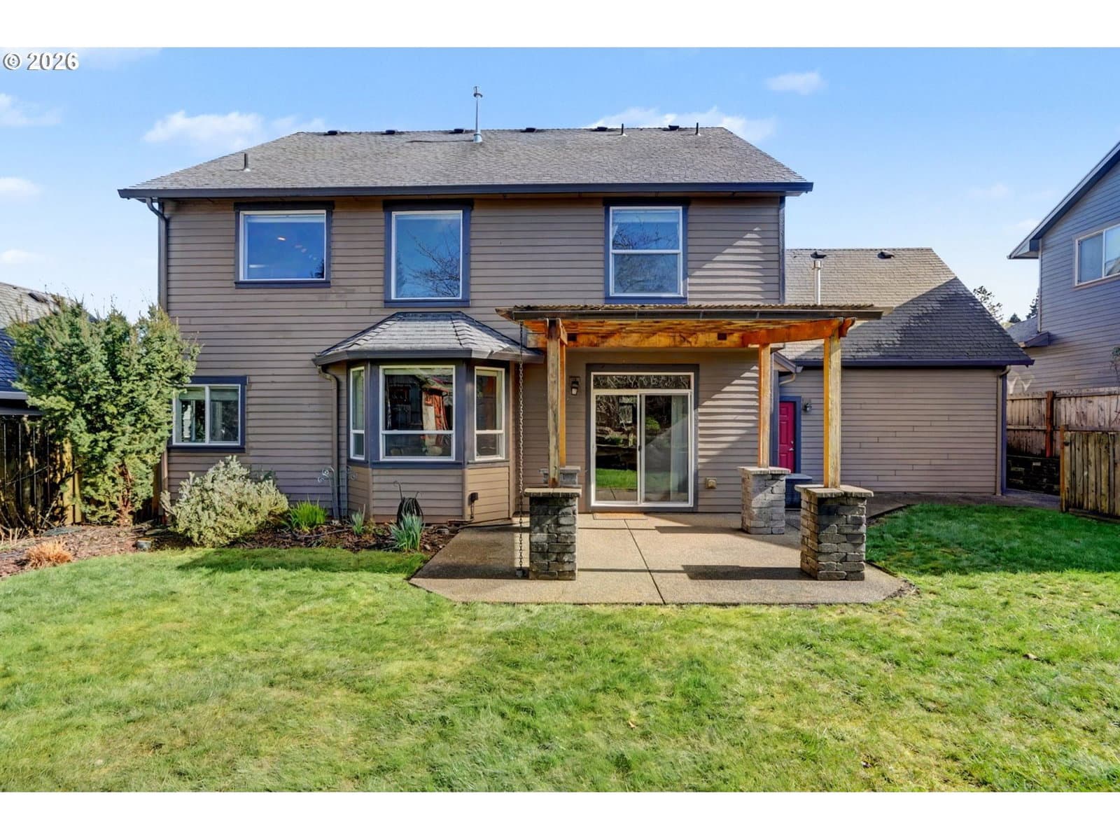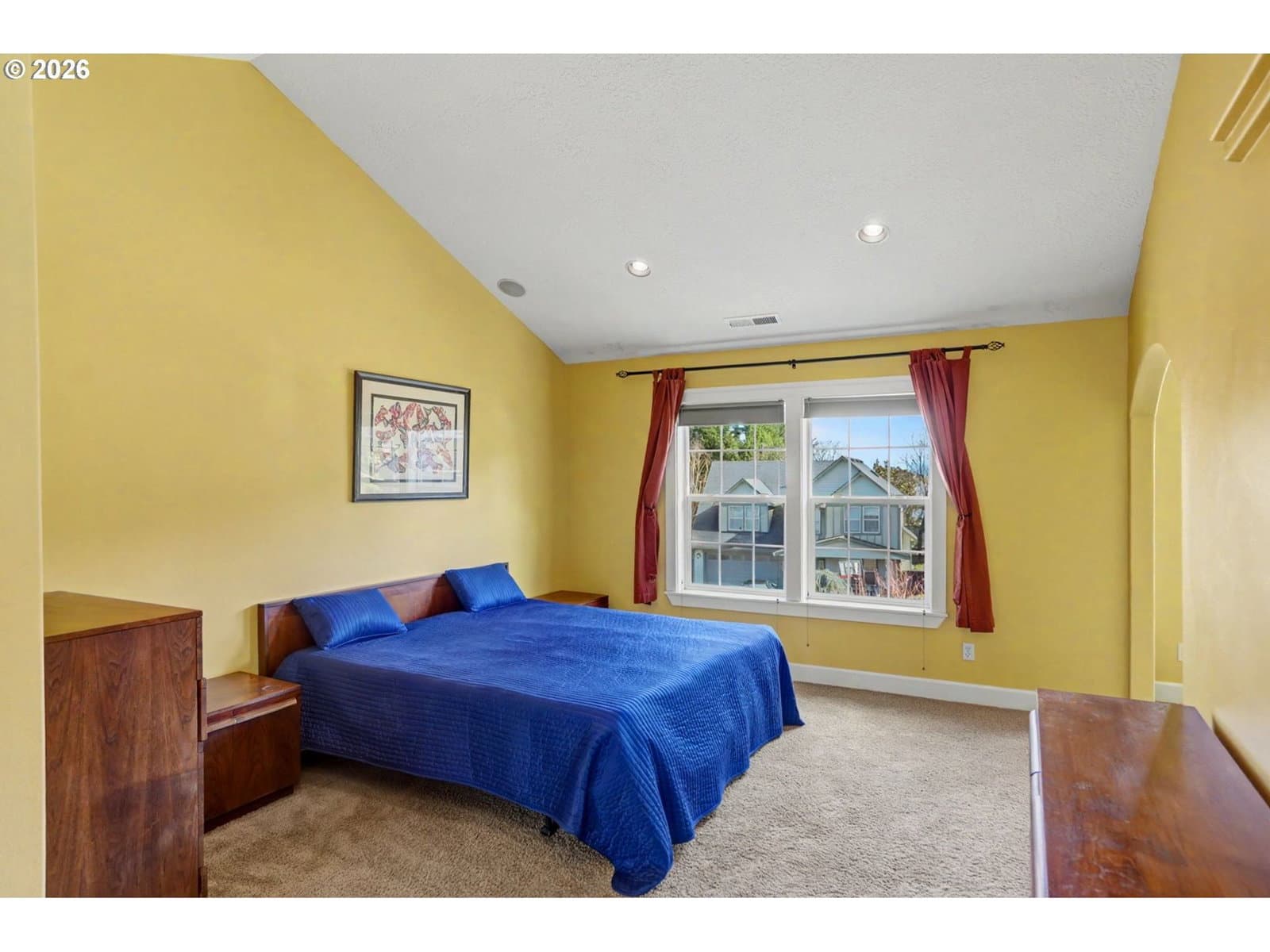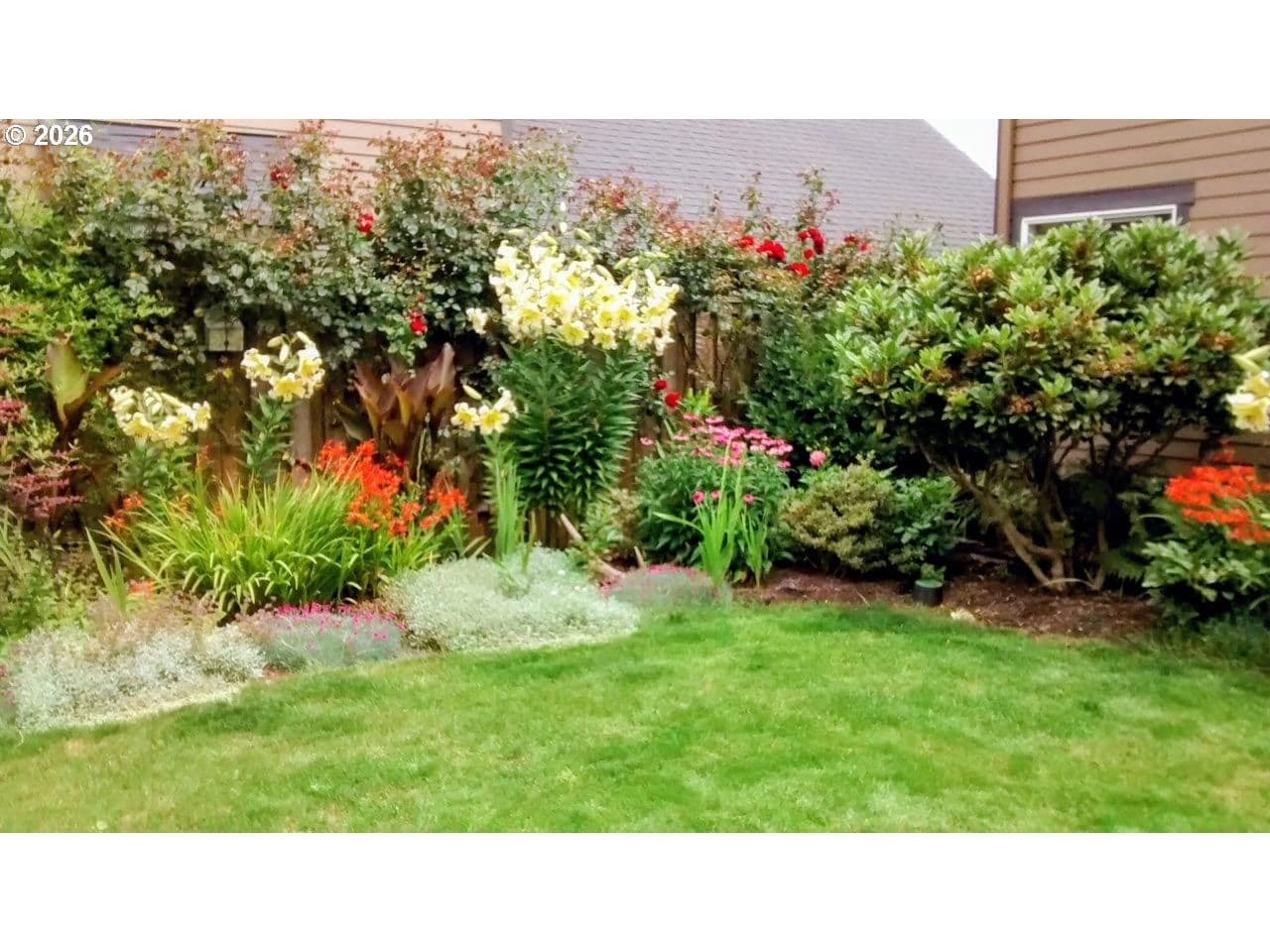 Well-maintained and very energy efficient 4 bed, 2.5 bath home offering 2,627 SF on a quiet cul-de-sac. Flexible layout includes a main floor bedroom, formal living & dining rooms, and both living and family rooms, each with gas fireplaces. Light-filled nook off the gourmet kitchen featuring granite countertops, cherry cabinetry, stainless Frigidaire appliances, and a walk-in pantry. Cherry cabinets continue throughout the bathrooms and laundry room for a cohesive, high-quality finish. Hardwood flooring on the main level. Spacious bonus room provides ideal space for media, office, or playroom. Primary suite features a walk-in closet, jetted tub, walk-in shower, and vaulted sitting/retreat area. Dual heating and cooling systems provide efficient comfort year-round. Central vacuum and central speakers included. The backyard is a true highlight with seven raised garden beds, fruit trees, grapevines, and abundant flowering plants, all within a fully fenced and beautifully landscaped setting. Covered patio, sprinklers, garden shed, and plenty of space to relax or entertain.