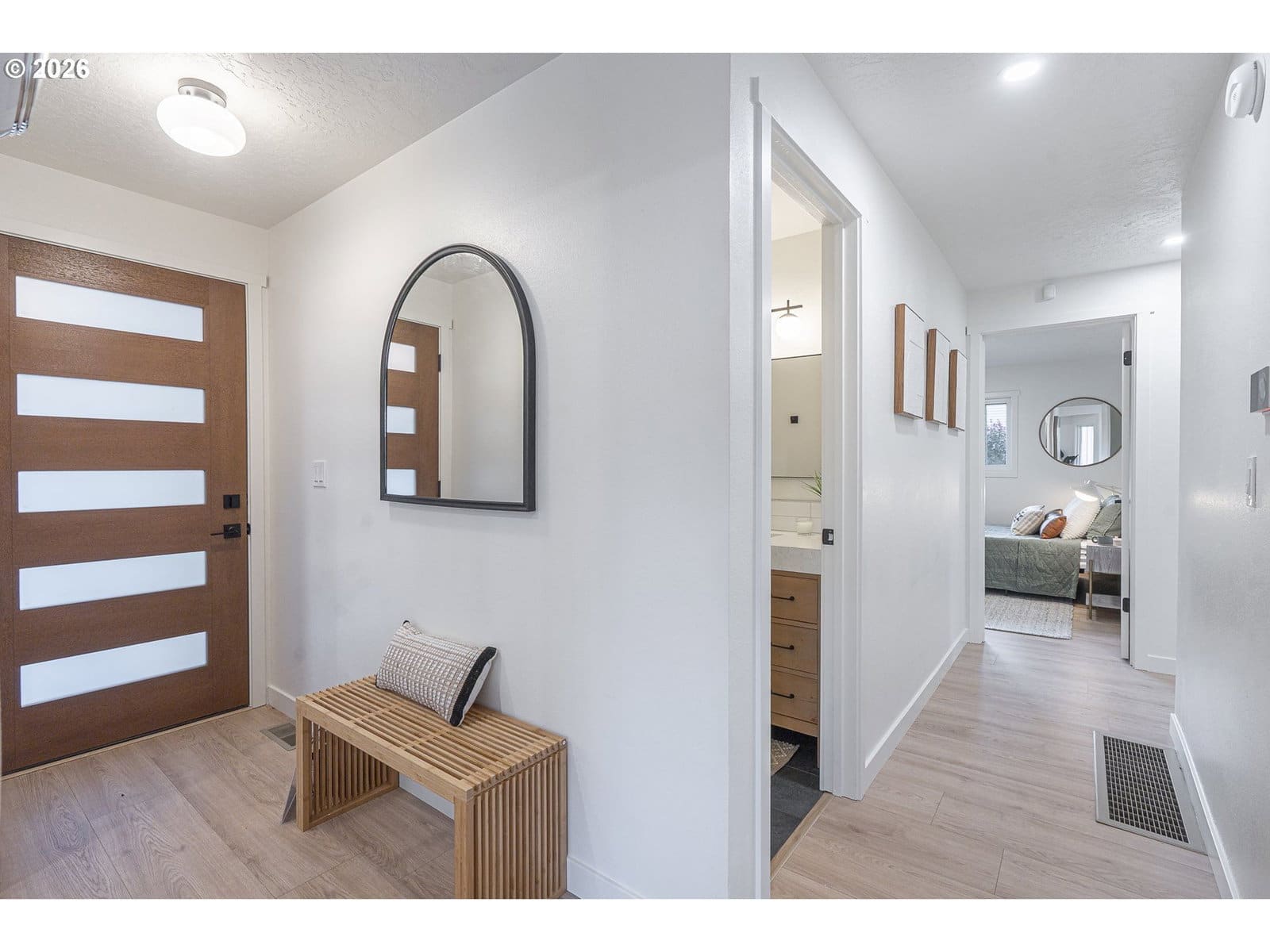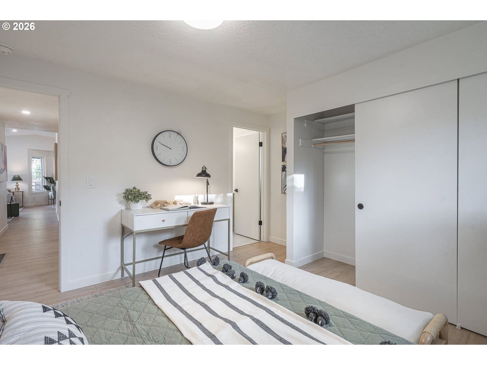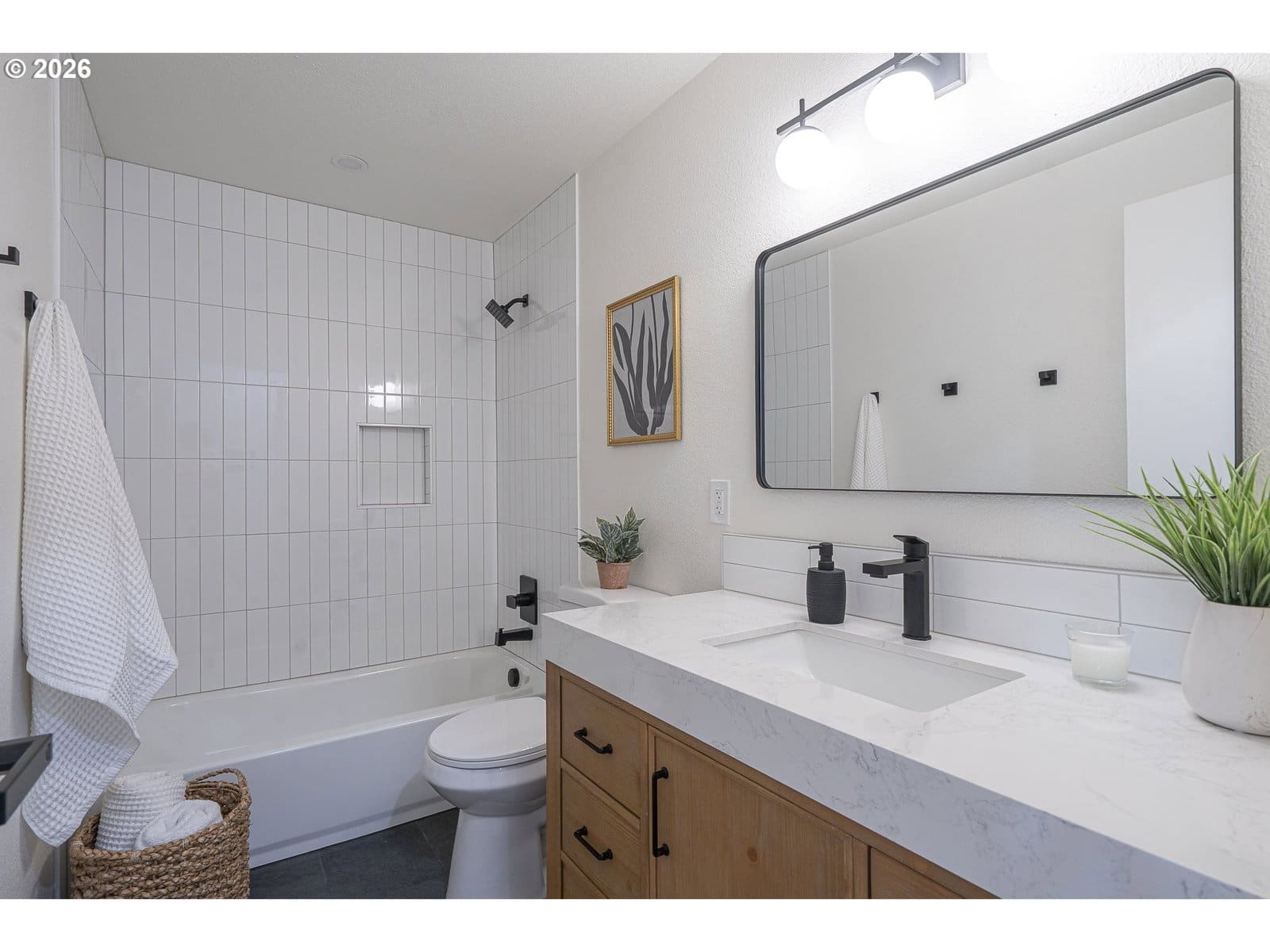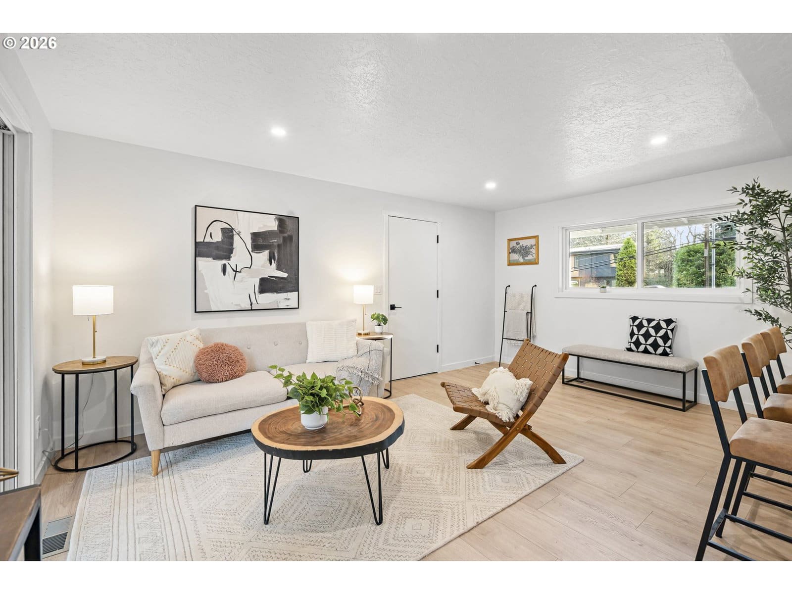 Thoughtfully renovated single-level modern ranch on a spacious corner lot in the desirable Markham neighborhood. This warm and inviting home features fresh interior paint, updated trim, stylish new lighting, and wide-plank light-oak-tone flooring. Vaulted living room is filled with natural light and showcases a striking new electric fireplace with designer tile surround, a sliding door provides easy access to the side deck. The functional kitchen offers modern finishes, including slim shaker cabinetry, quartz countertops, stainless steel appliances, pantry storage and a sunny nook. The kitchen flows effortlessly into the spacious family room with a quartz eat-bar, providing ample space for gathering, entertaining and everyday living, a second slider opens to a generous deck ideal for relaxing or hosting guests . This home features three comfortable bedrooms and two fully updated bathrooms featuring new vanities, tile surrounds, tile flooring and contemporary fixtures. An extra large two-car garage, offers abundant flexibility and storage, with a separate shop area located behind the garage-perfect for hobbies, projects, or additional workspace. The inviting exterior showcases fresh paint, a new overhead garage door, and a new front entry door. The fenced yard and spacious deck provide a private and peaceful setting, perfect for relaxing, entertaining, or bringing your outdoor ideas to life. Washer, dryer & freezer included. Ideally located near parks, scenic hiking trails, schools, and convenient freeway access. A wonderful place to call home!