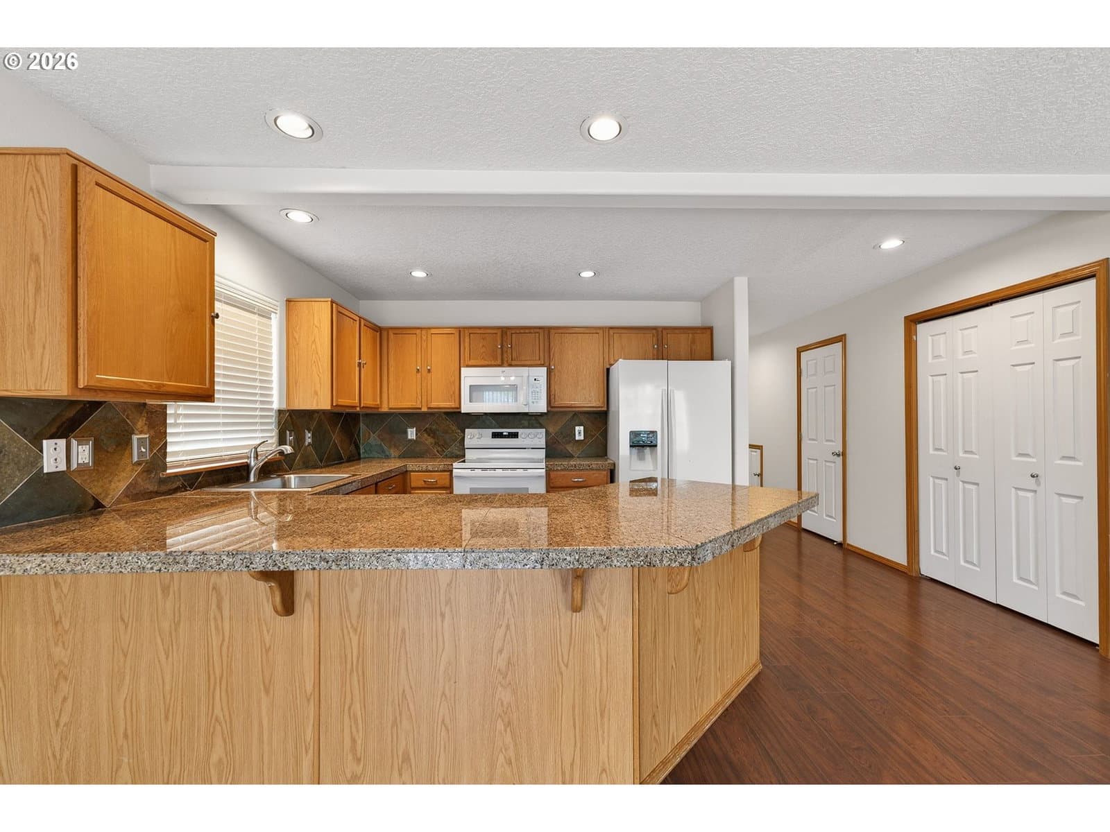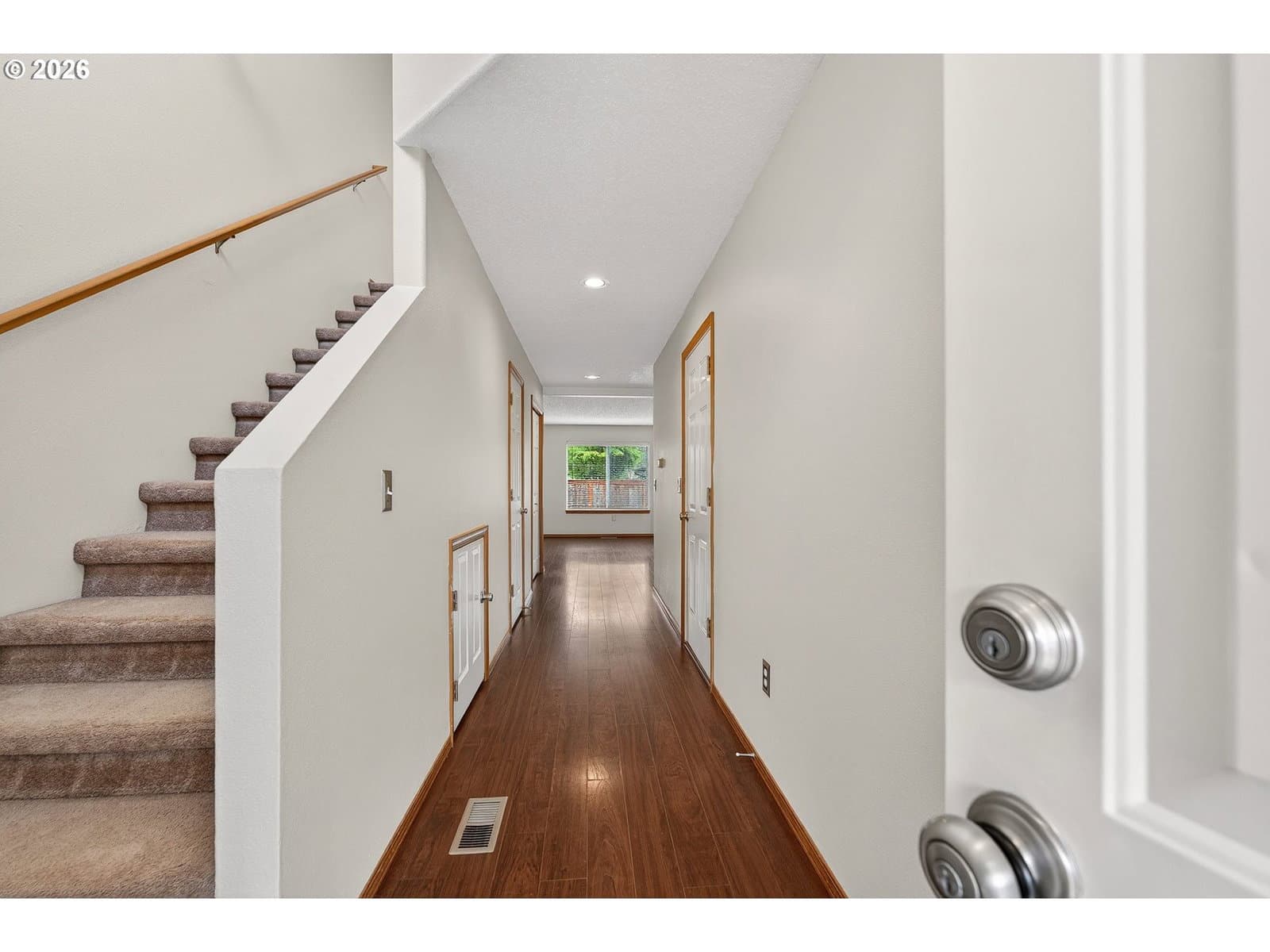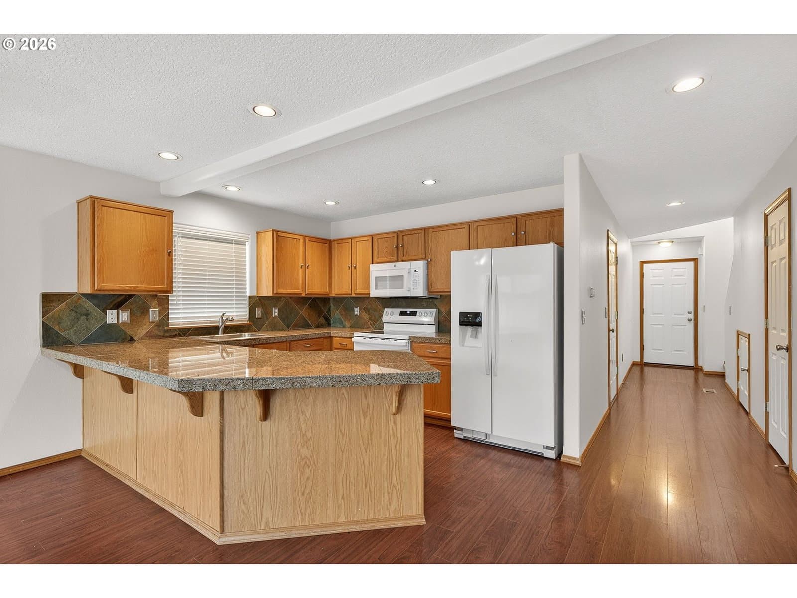 Updated attached home @ Creekside. Great Newberg location near parks, schools, & shopping. Open great room style kitchen living and dining area, wood floors throughout main level, kitchen with eat bar, granite tile countertop- new oven/stove, new sink. Vaulted primary suite with walk in closet & In-suite bathroom. Upper level laundry closet. Fenced back yard with decking. NO HOA fee.