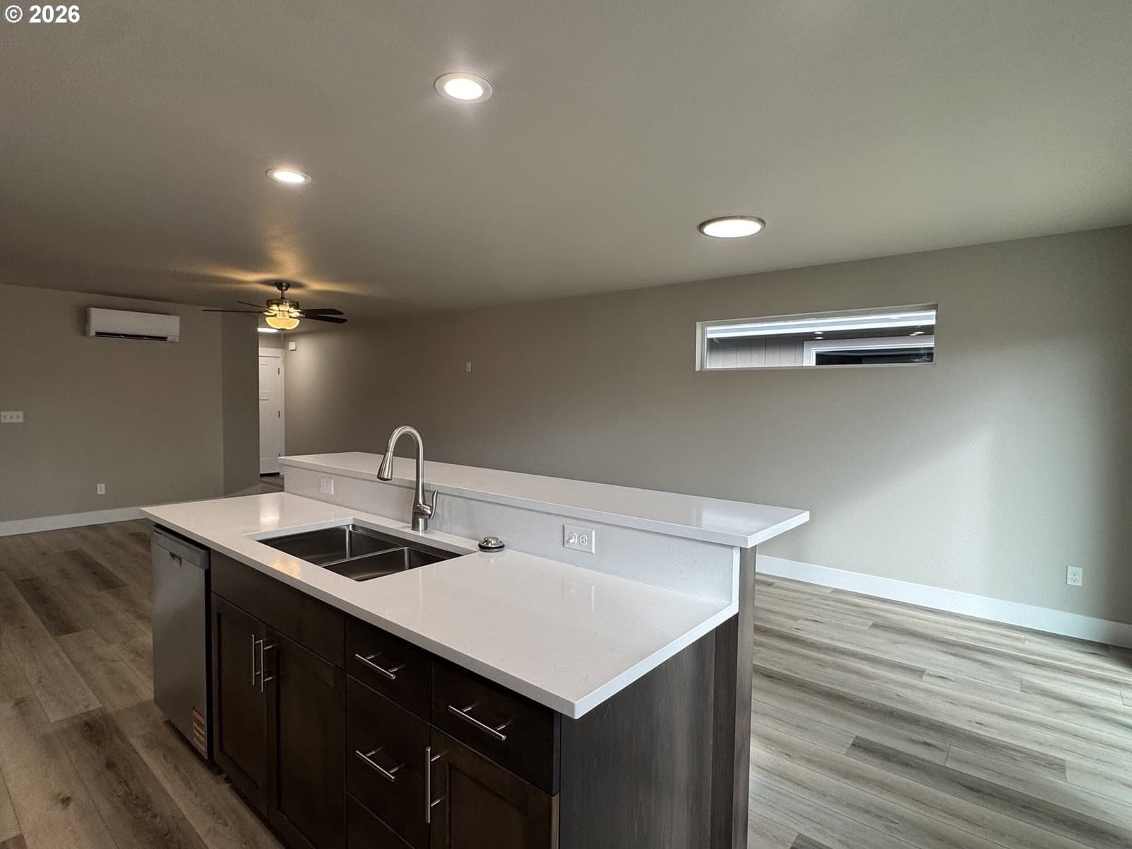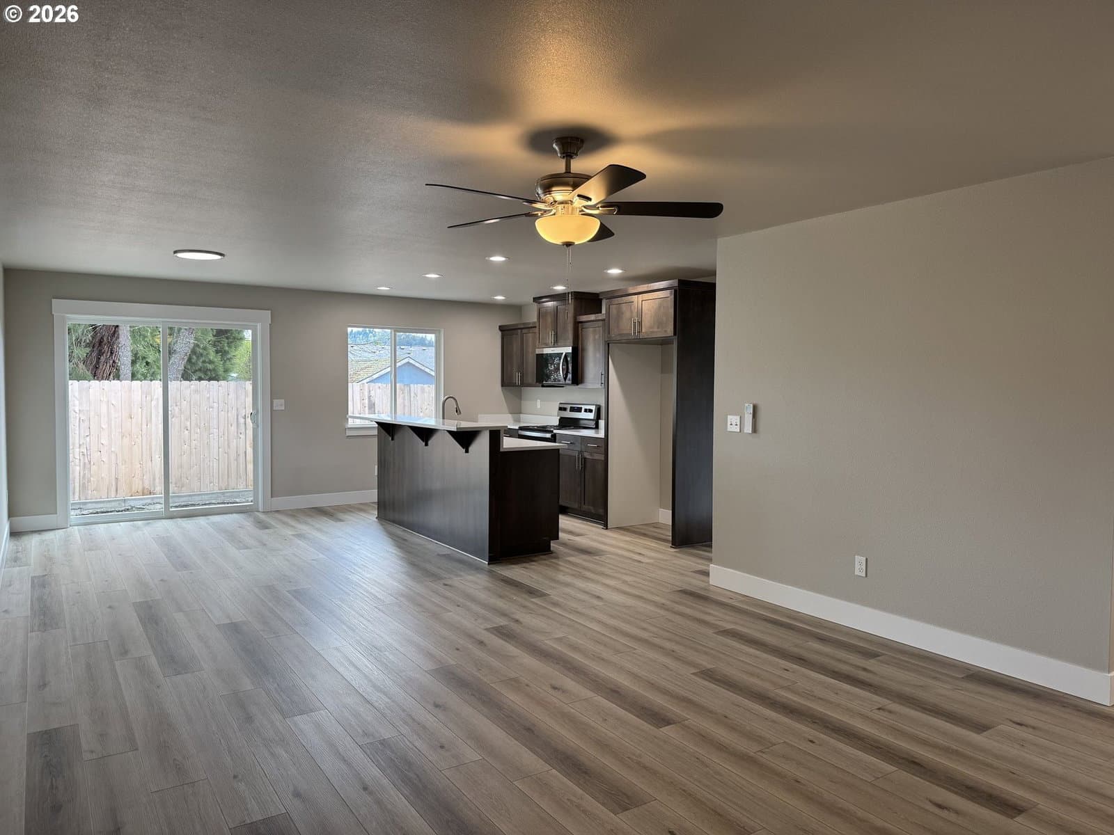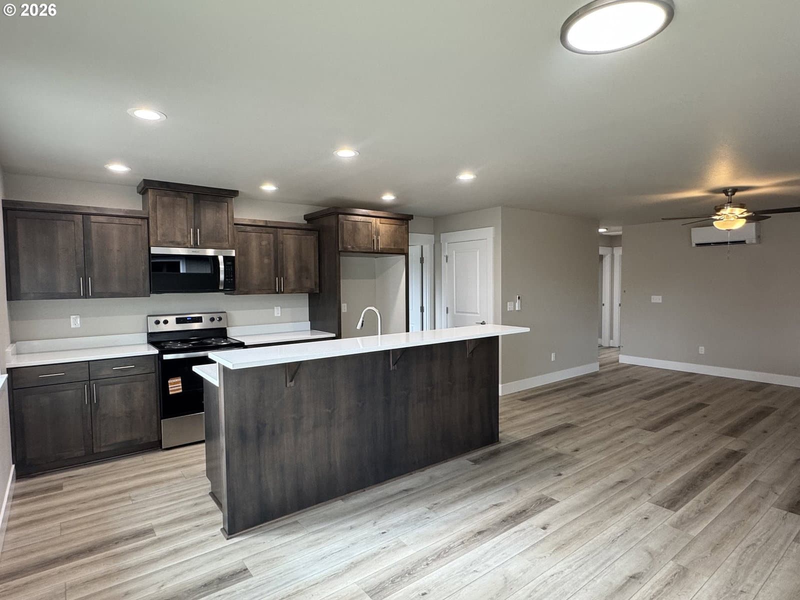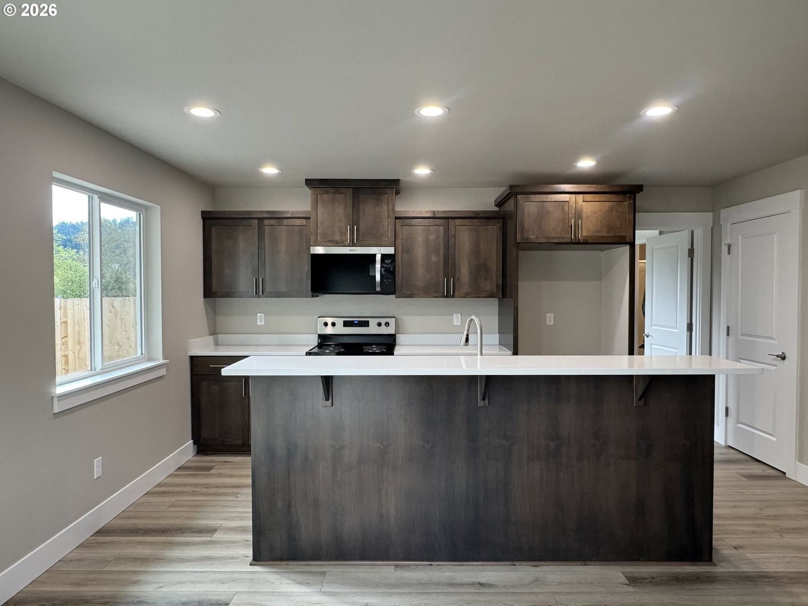 New home by Tabor Building. The “Horizon” open concept floor plan is designed to give a comfortable feel to the main area of a modest-sized house. Robust primary bedroom and closet space. Custom cabinets with raised eating bar, Quartz countertops, and LVP flooring.