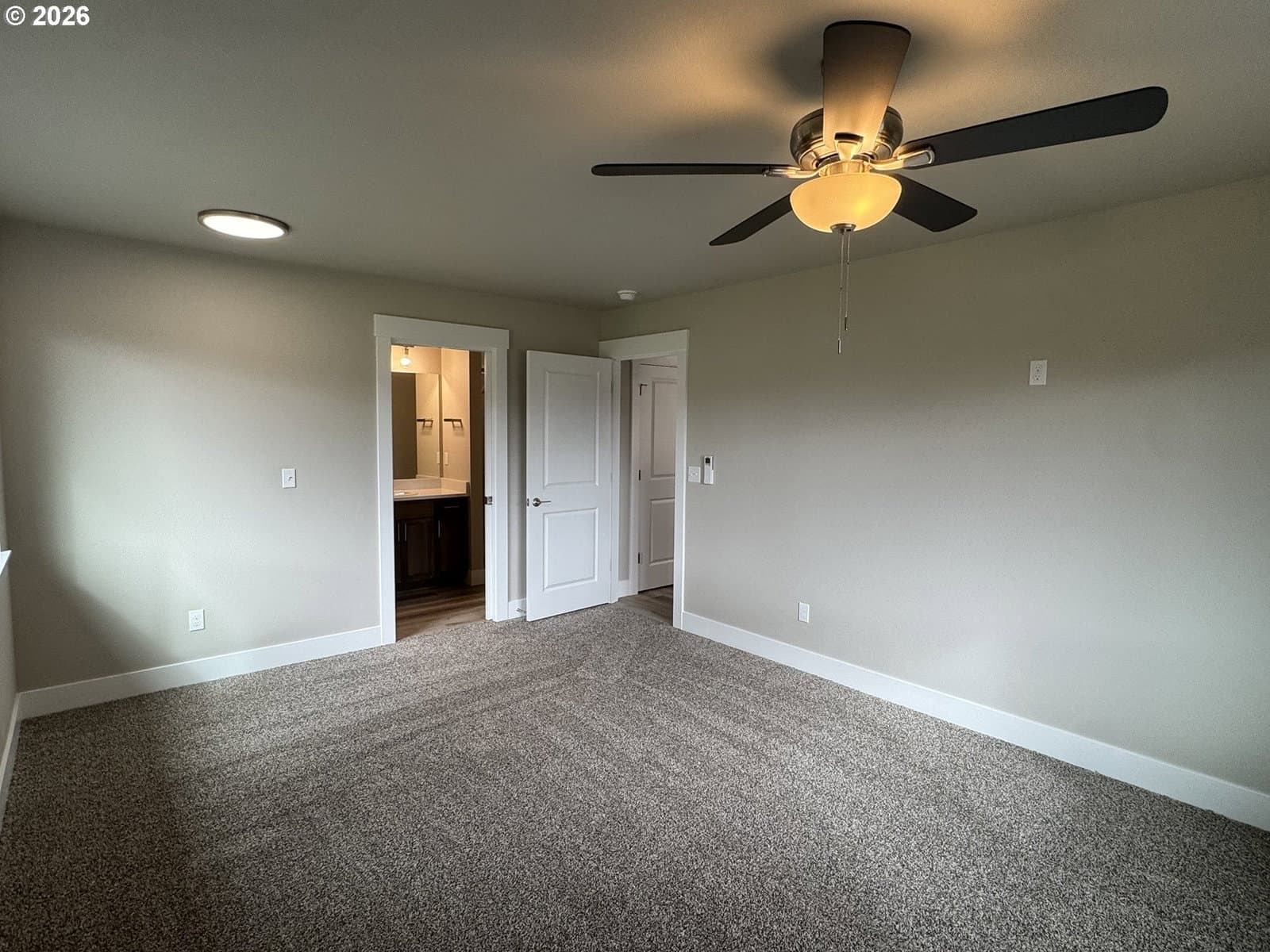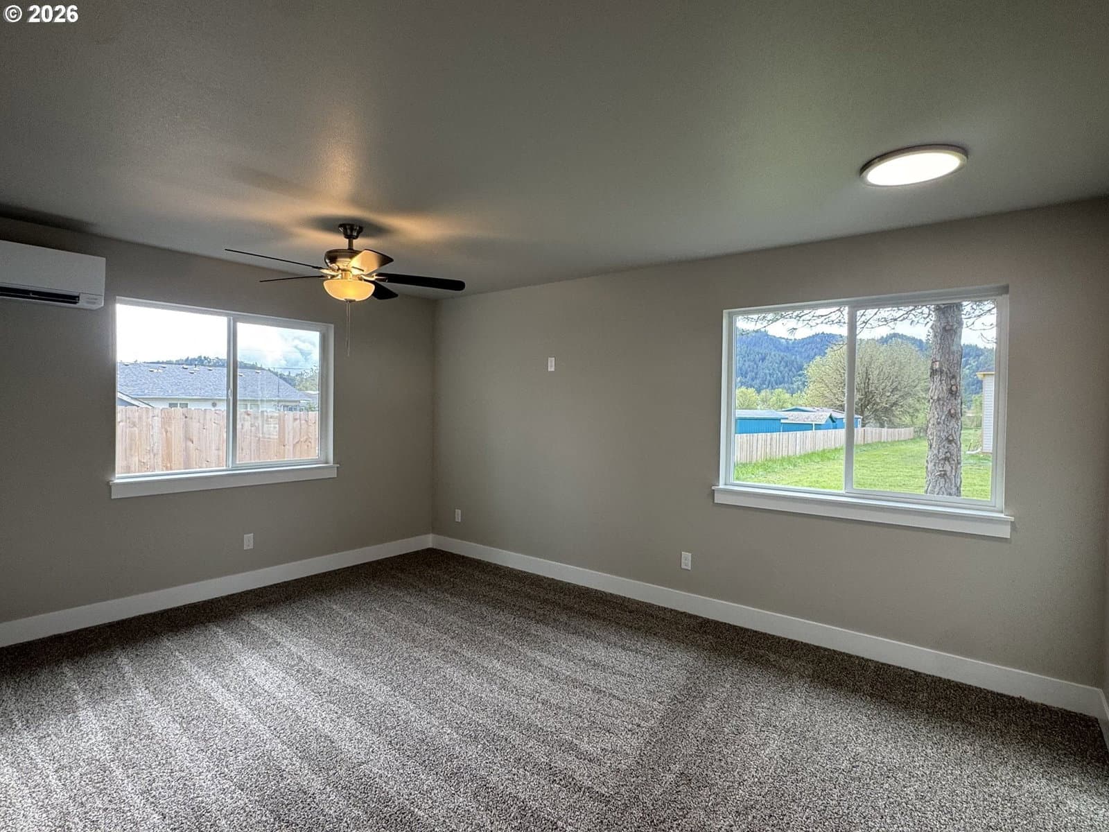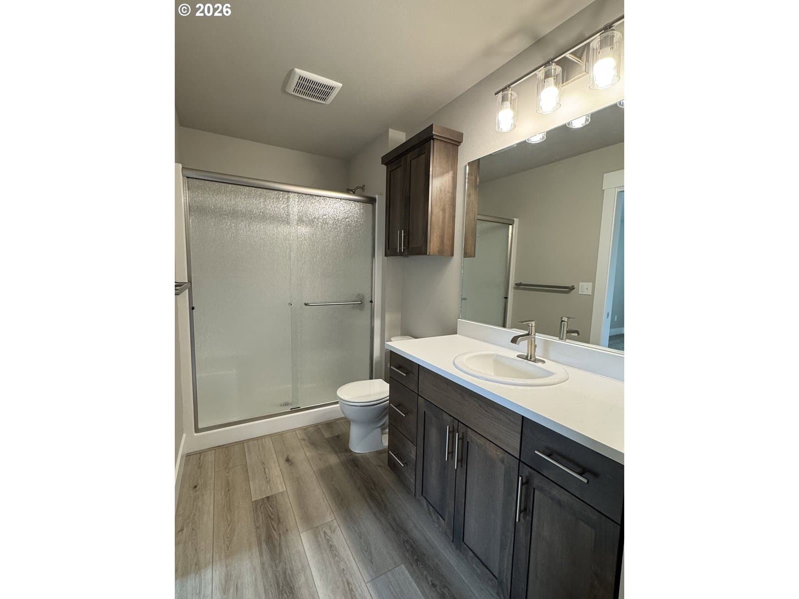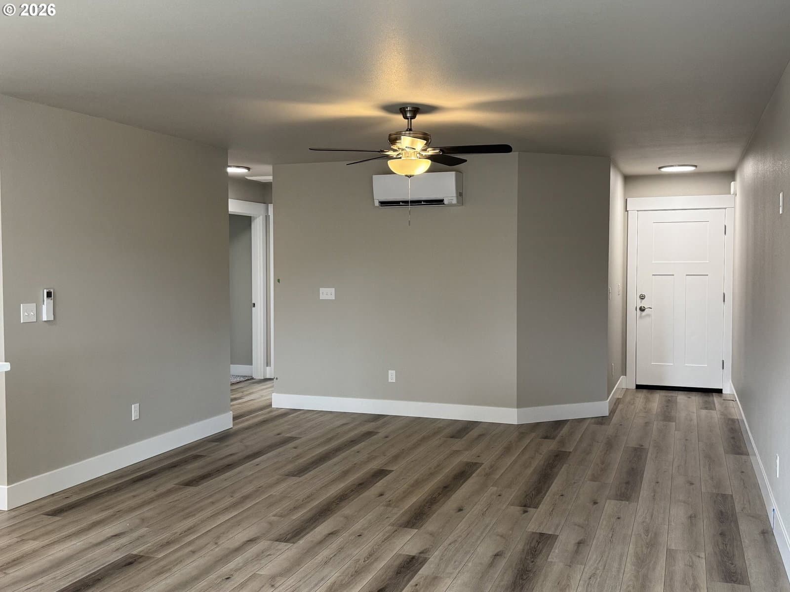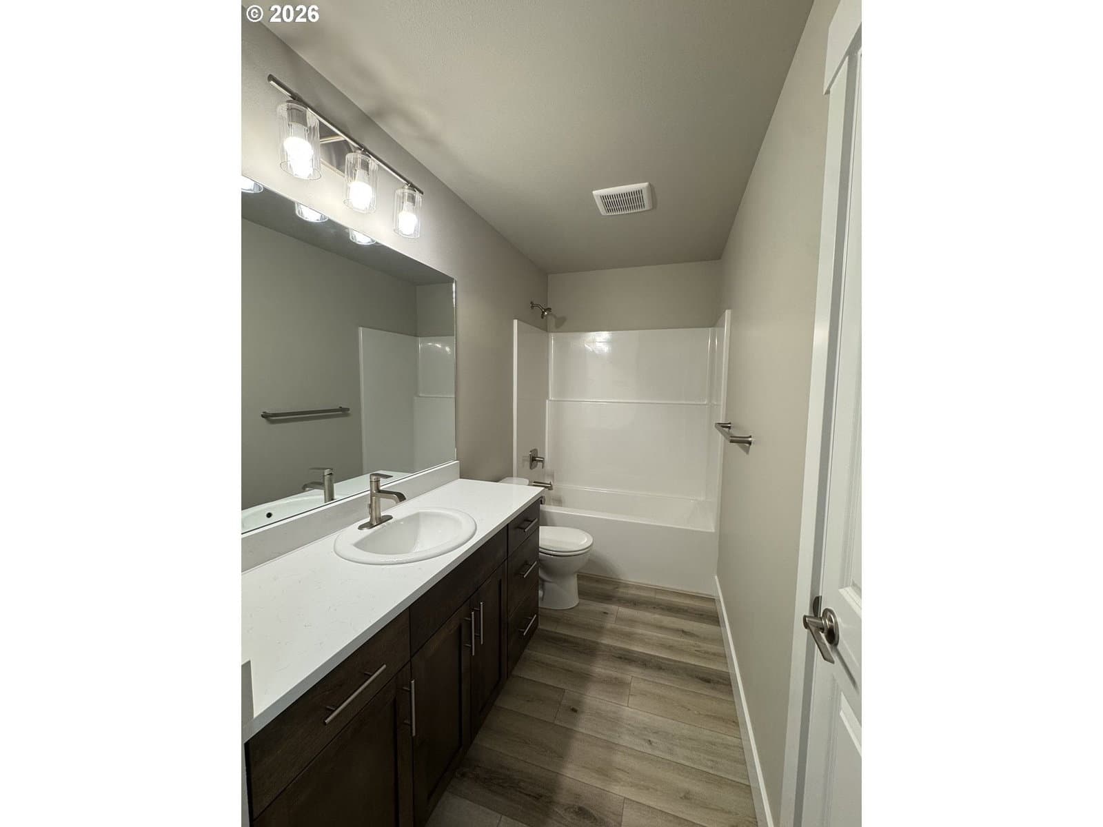 New home by Tabor Building. The “Horizon” open concept floor plan is designed to give a comfortable feel to the main area of a modest-sized house. Robust primary bedroom and closet space. Custom cabinets with raised eating bar, Quartz countertops, and LVP flooring.
