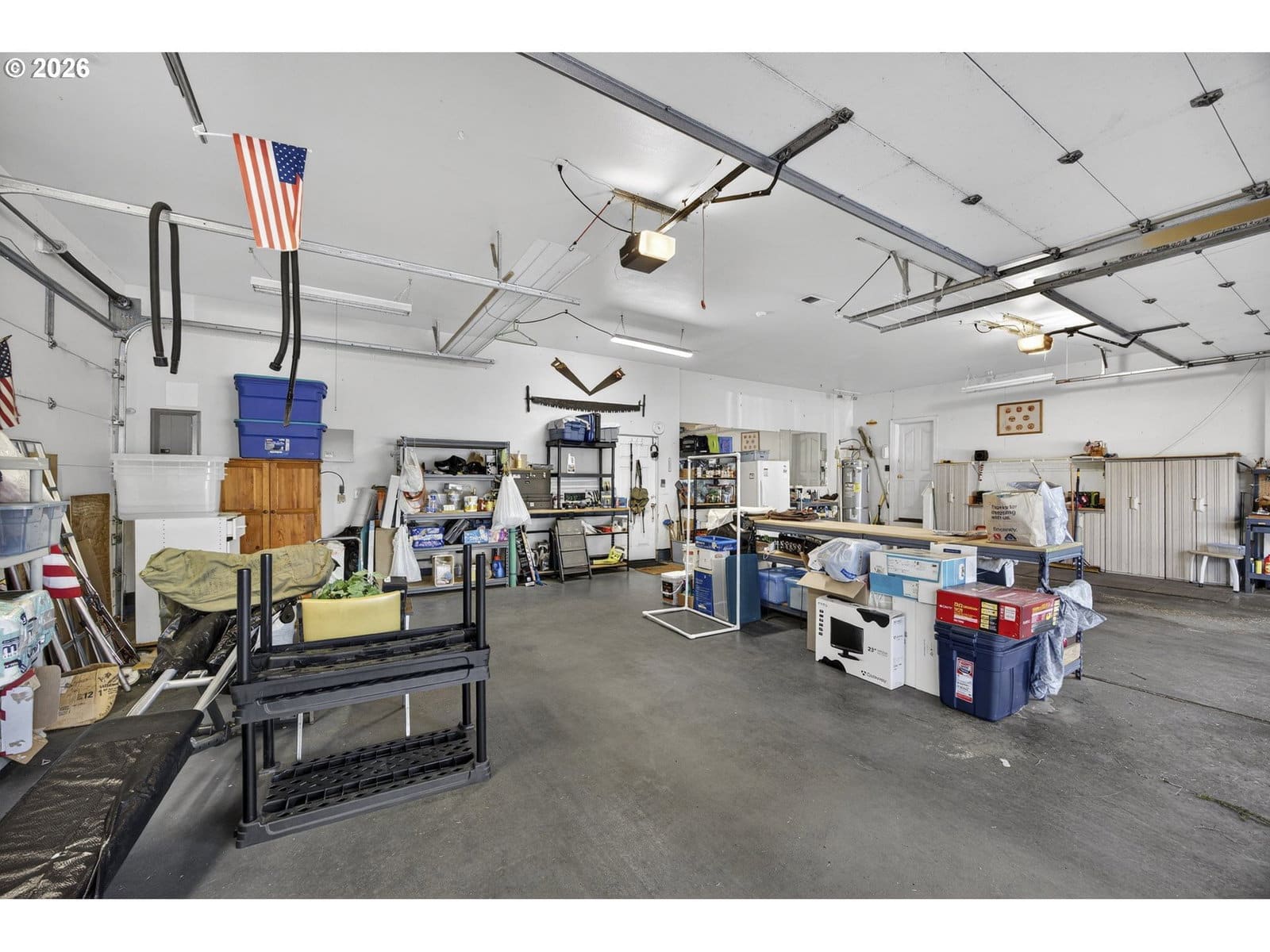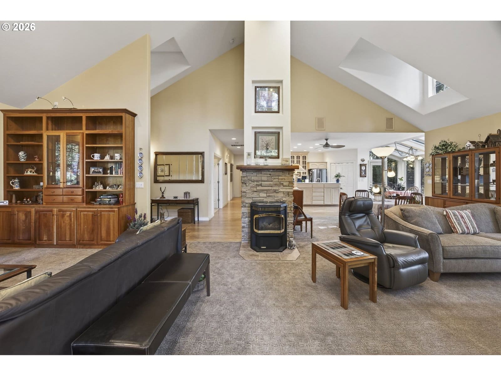 Spacious and well designed, this 3 bedroom, 2 bathroom home offers 2,245sqft of living space on a generous 0.72-acre lot. High vaulted ceilings throughout create an open, airy feel, enhanced by elegant french windows that fill the home with natural light. The inviting living room features a cozy pellet stove and a charming bay window, making it the perfect place to relax. The kitchen is thoughtfully equipped with a free-standing refrigerator, built-in oven, cooktop, built-in dishwasher, microwave, trash compactor, pantry, and ample counter space. An eating nook overlooks the expansive, beautifully landscaped yard, ideal for everyday meals or morning coffee. The primary suite serves as a private retreat with a walk-in closet and an attached bathroom featuring double sinks, a walk-in dual-head shower, and a jetted tub. The functional laundry room includes built-in storage and a utility sink for added convenience. Enjoy outdoor living from the wraparound porch with both covered and open areas. An attached oversized 2-car garage, detached 2-car garage, circular driveway, and abundant extra parking complete this exceptional property. You don't want to miss this beautiful retreat!