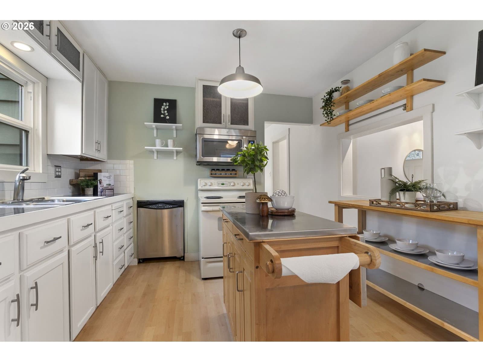 Move-in ready Hillsboro bungalow blending classic charm with modern style. Set on a beautifully landscaped lot, the private and expansive backyard offers an ideal setting for summer gatherings, featuring concrete hardscaping and mature plantings. Inside, enjoy a practical and flexible floor plan with warmly toned flooring, fresh interior paint, and abundant natural light throughout. The main level features an inviting eat-in kitchen with space for everyday meals and casual entertaining, along with two distinct living areas that provide versatility for relaxing, hosting, or working from home. A main-level bedroom and full bath add everyday convenience and flexibility. Upstairs, two additional bedrooms offer comfortable retreats with separation from the main living spaces. Located close to historic downtown Hillsboro, enjoy easy access to shopping, restaurants, the Walters Cultural Arts Center, parks, trails, and recreational facilities. Convenient to major commuter routes and nearby tech employers, this home offers an exceptional blend of lifestyle and location.