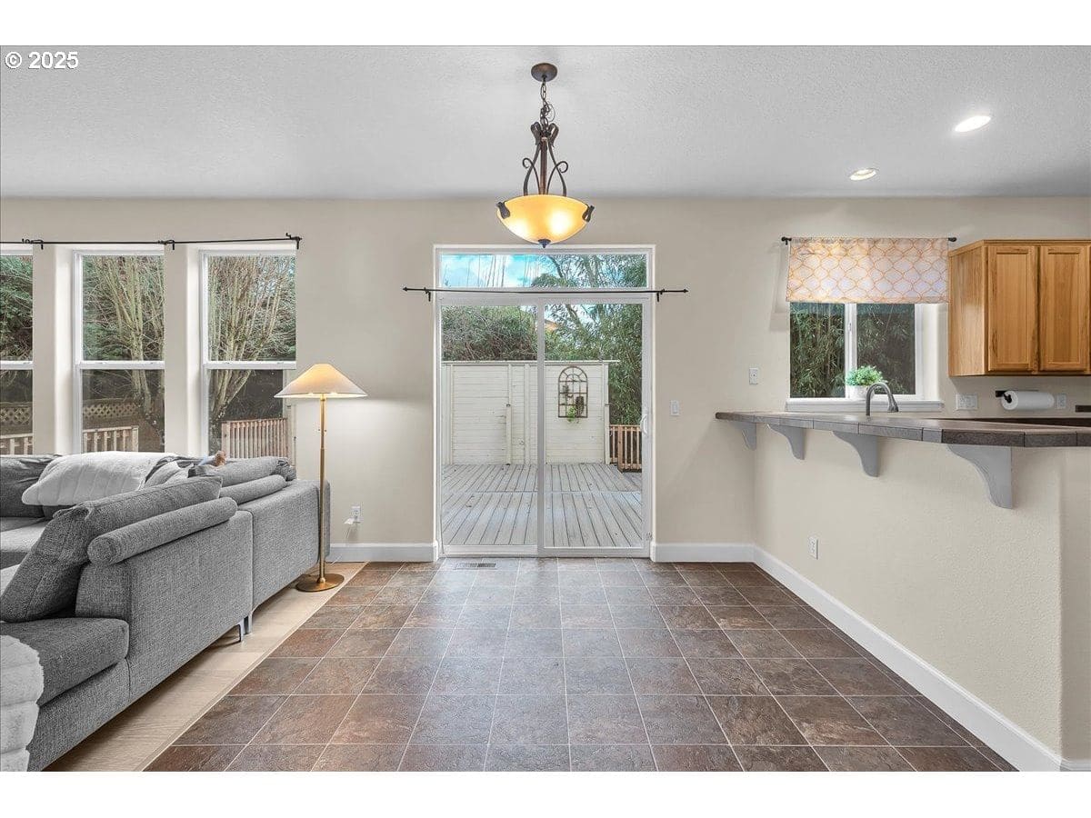 This inviting home offers a comfortable, versatile floor plan with effortless flow between the kitchen, dining area and two separate living spaces, perfect for entertaining or relaxed get-togethers. The spacious kitchen features tile countertops, an eating bar and updated appliances, all included, and opens to the adjoining family room with a cozy fireplace and ceiling fan. The main floor also includes a flexible den, ideal for a home office, study area or creative space, along with a convenient utility room featuring an updated washer and dryer. Upstairs, the bedrooms are thoughtfully grouped together. The primary suite showcases a vaulted ceiling that enhances the sense of openness, a generous walk-in closet, and a well-appointed bath with double sinks and a soaking tub. Newer carpet and laminate flooring, paired with freshly updated interior paint, gives the home a crisp, refreshed feel throughout, and the large windows bring in beautiful light. Outdoors, the fully fenced backyard offers a composite deck, tool shed, mature landscaping and seasonal enjoyment from raspberries, blueberries and rhubarb. The open farmland beyond offers a peaceful backdrop and a sense of privacy that is often not found in the city. An oversized garage provides excellent storage, including attic space, and the long driveway plus the separate carport offer ample parking options. Located near schools and along a popular annual holiday parade route, this home blends comfort, flexibility and a welcoming setting. No HOA here! The easy commute to the Metro area makes Scappoose a high-demand location to call home!