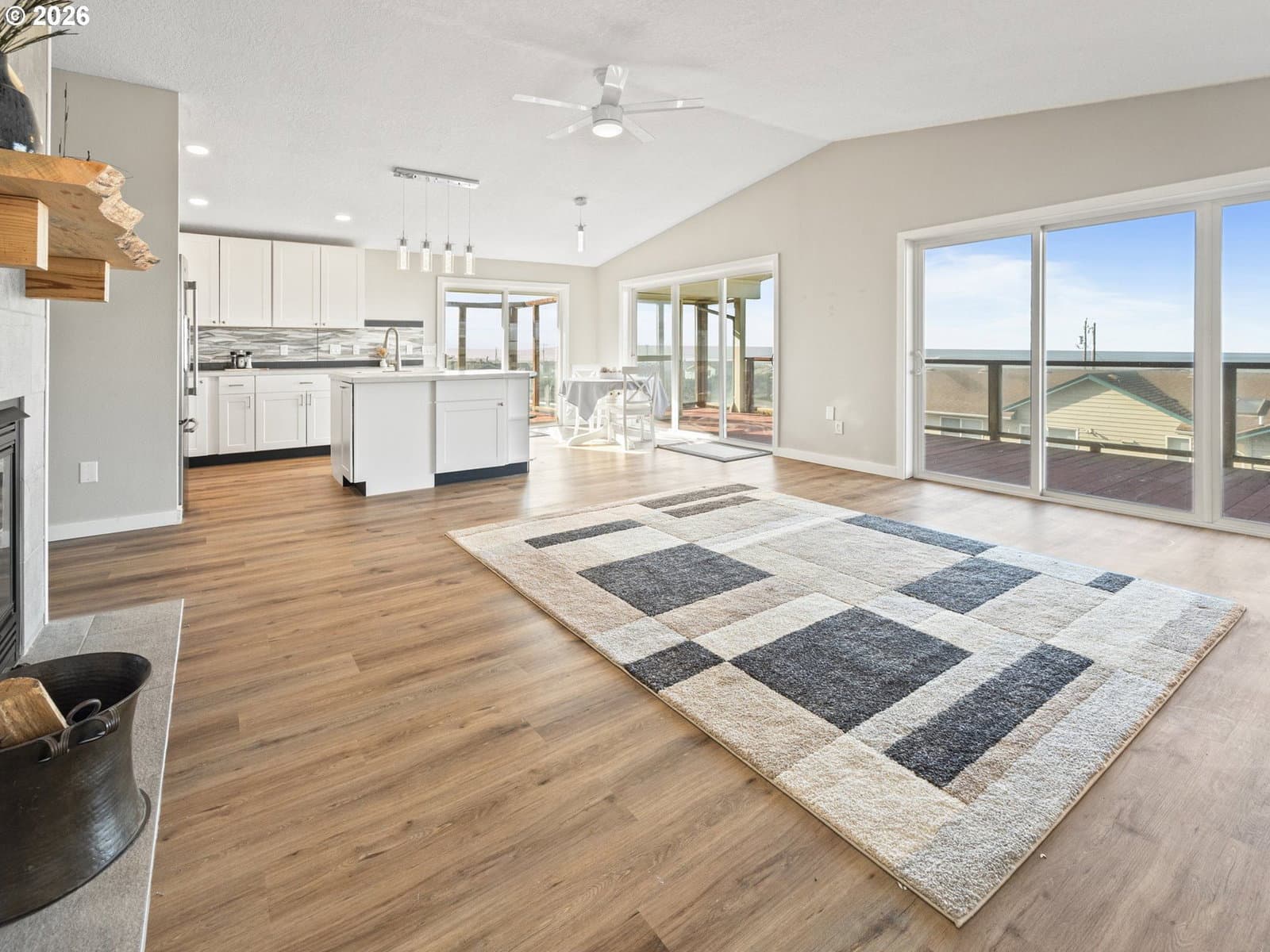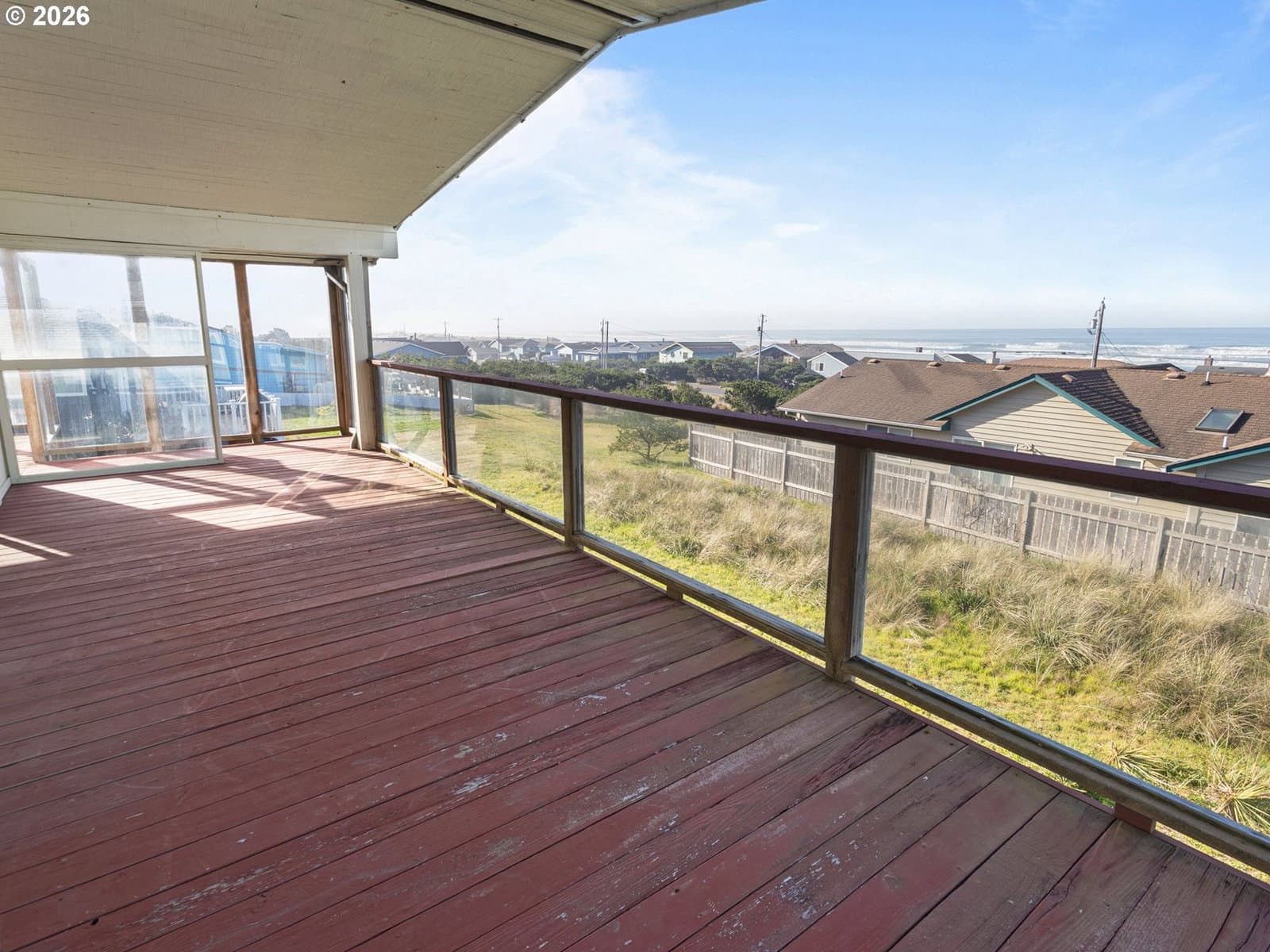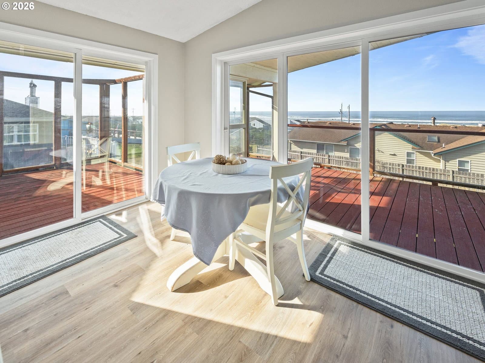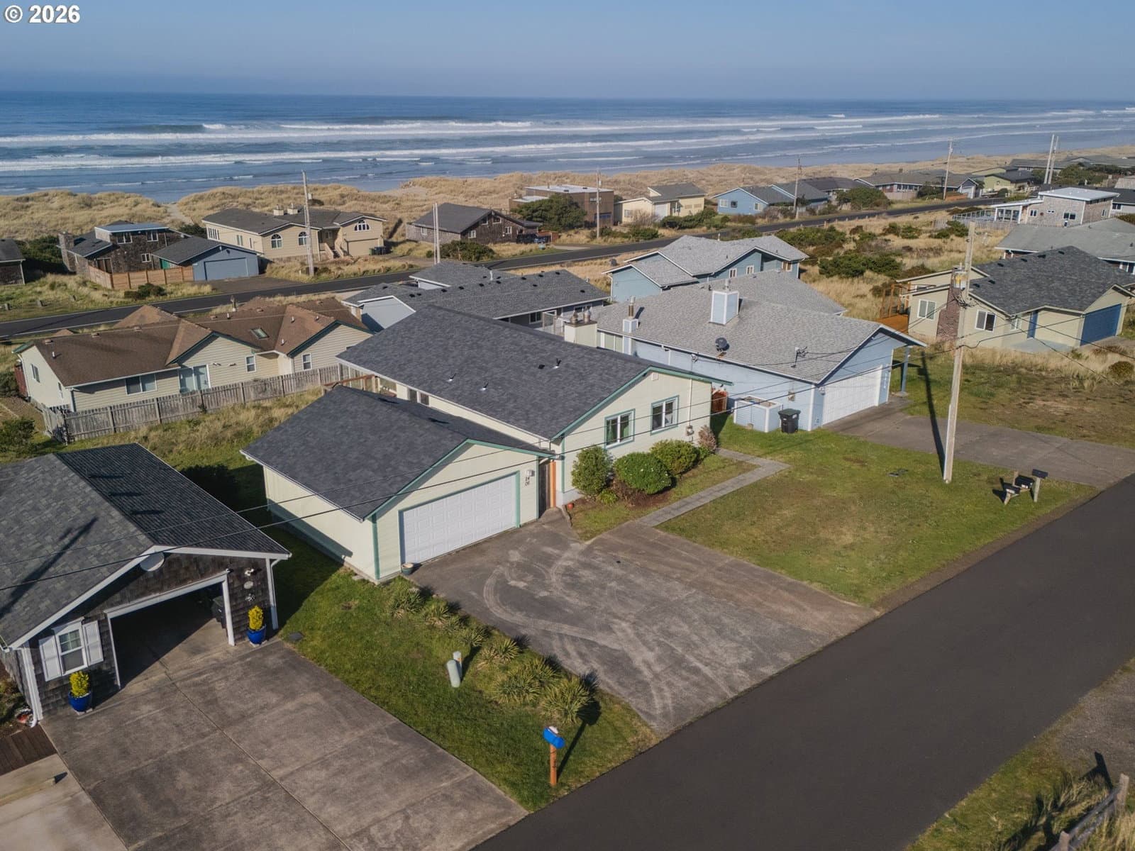Welcome home to breathtaking ocean views and the best of coastal living. A wrap-around deck invites year-round enjoyment, perfectly framing this beautifully refreshed 3-bedroom, 2-bath home. The newly updated kitchen opens to the great room, where expansive windows capture sweeping ocean vistas and fill the home with natural light. Spend your evenings cozied up by the fireplace in the living room. Thoughtful upgrades throughout include a newly updated kitchen with stainless steel appliances, laminate flooring and plush carpet, showers in all bathrooms, fresh interior paint, lighting, and a custom-designed laundry room with built-in storage.The lower level features a private bedroom with walk-out patio access, a bathroom with a walk-in shower, a quiet office, and a living room anchored by a second fireplace. New roof installed on the home in 2026. Just one block from the beach, this home delivers sought-after ocean-view living with plenty of space.
