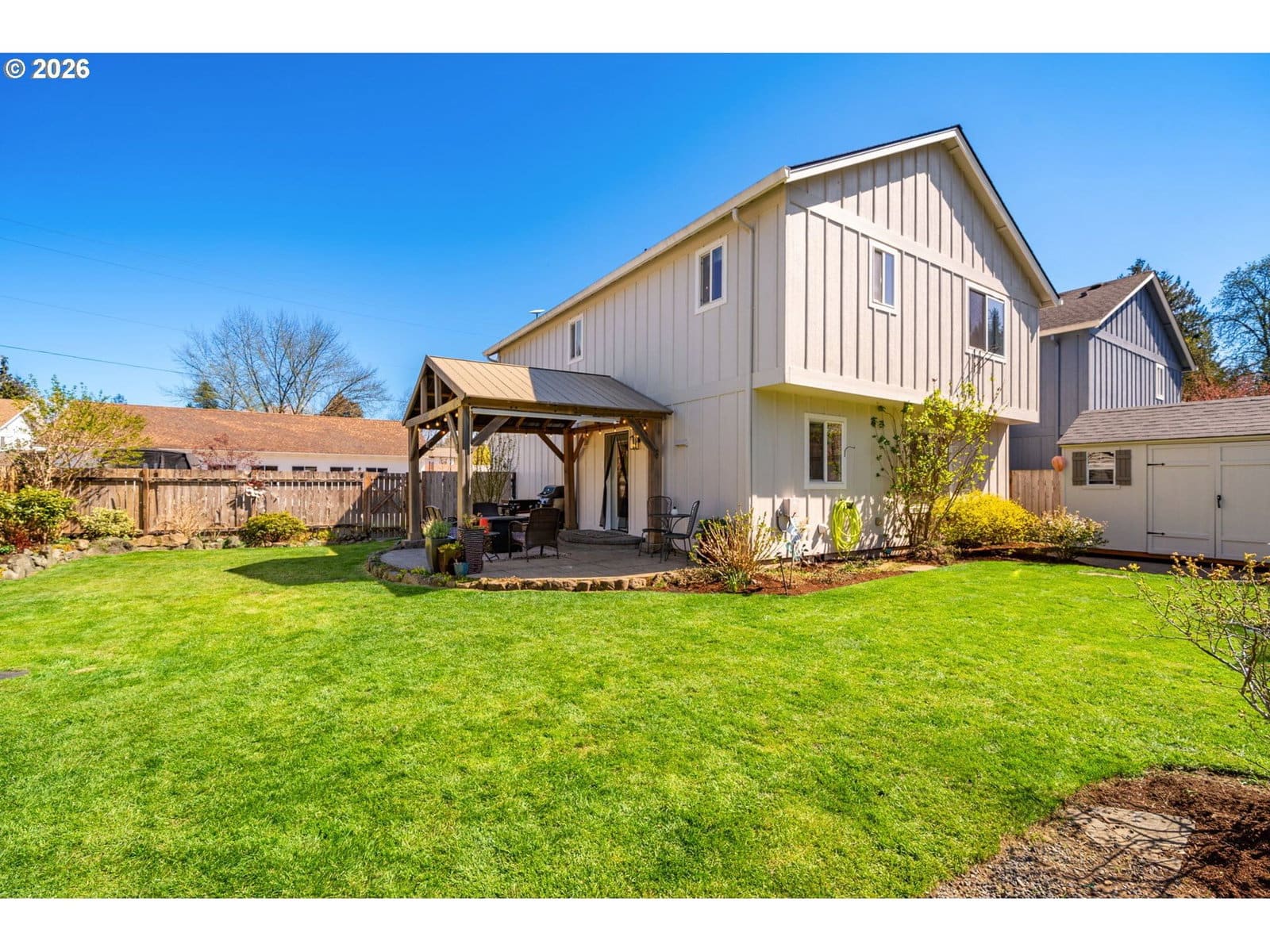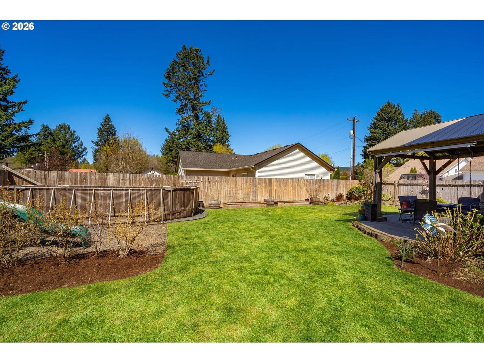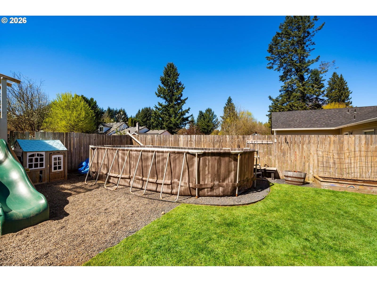 One of the best landscaped yards in Yacolt! Raised garden beds, hydrangeas, blueberry bushes covered patio, sprinklers and low voltage lighting. New roof in 2025 (nearly all new sheathing AND transferrable warranty), new exhaust vents and venting out of the attic. New carpet in 2024, LVT floors. Both bathrooms have new vanities, LVT flooring, new light fixtures and mirrors. 2023 Kitchen appliances replaced. Ceiling fans in every bedroom. Primary suite features accent wall, attached bathroom with walk in shower, separate water closet, and walk in closet. Upstairs Den/office makes a great hideaway! All of the included extras: Above ground pool, play structure, shed, Refrigerator.