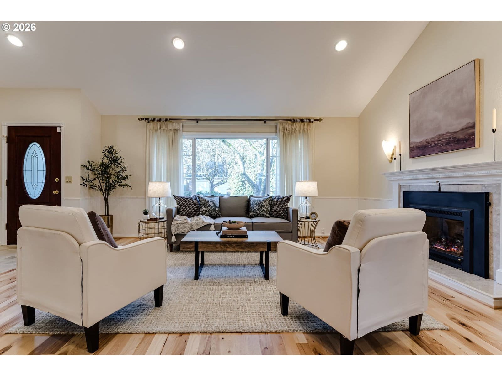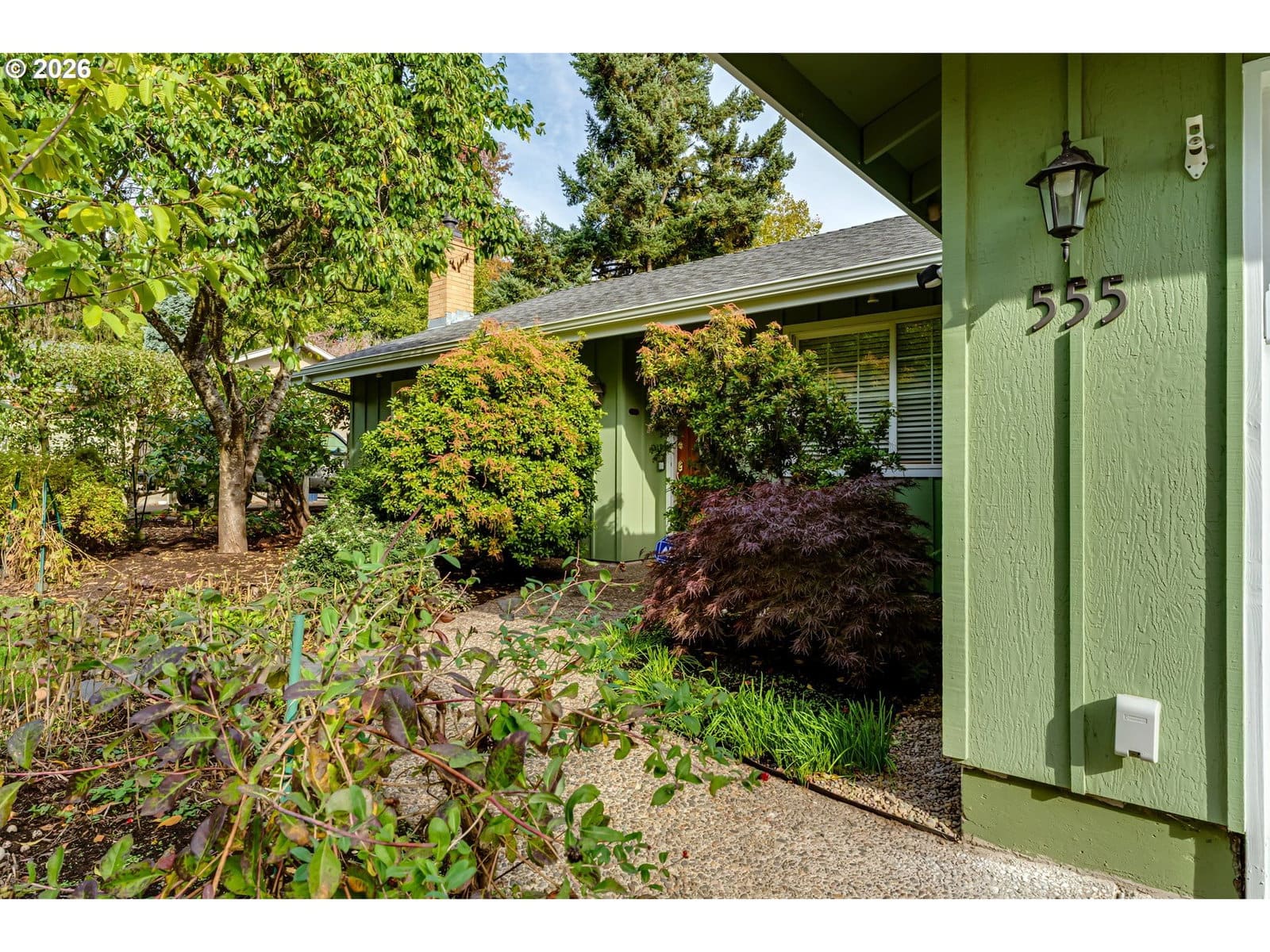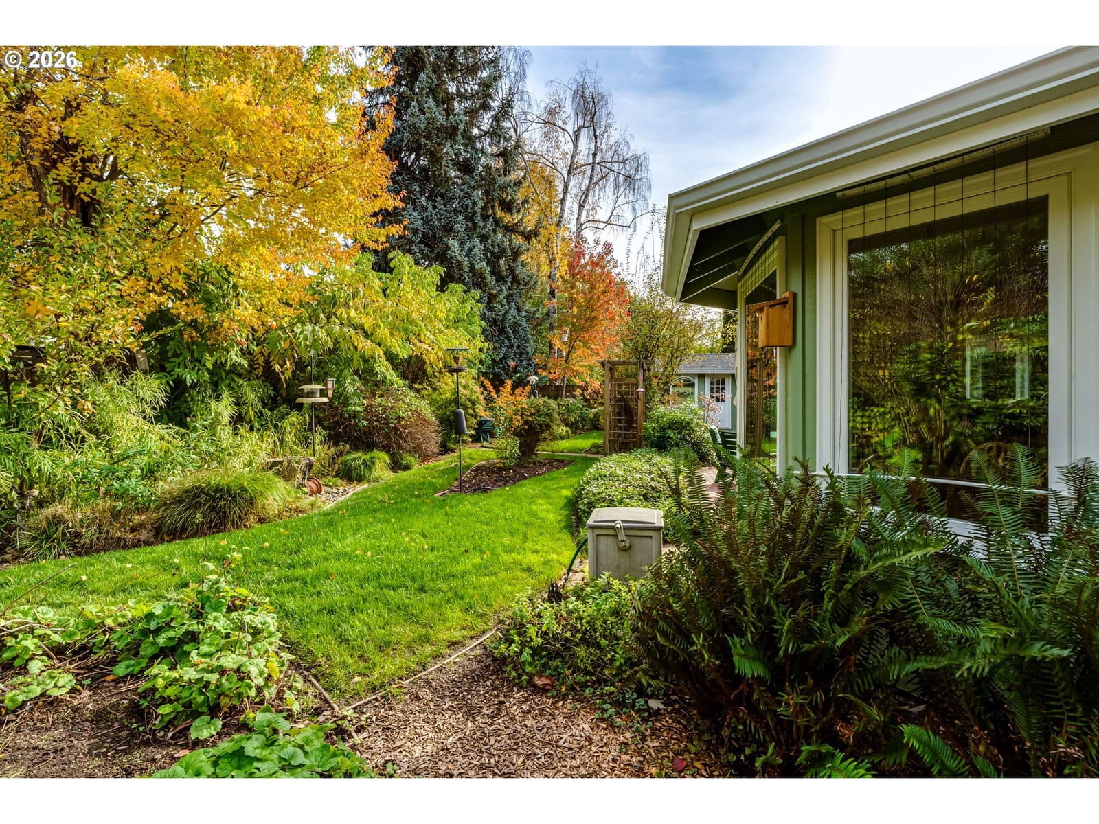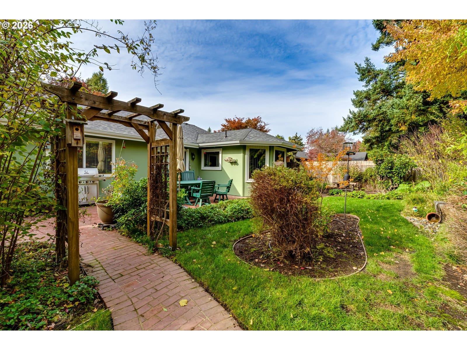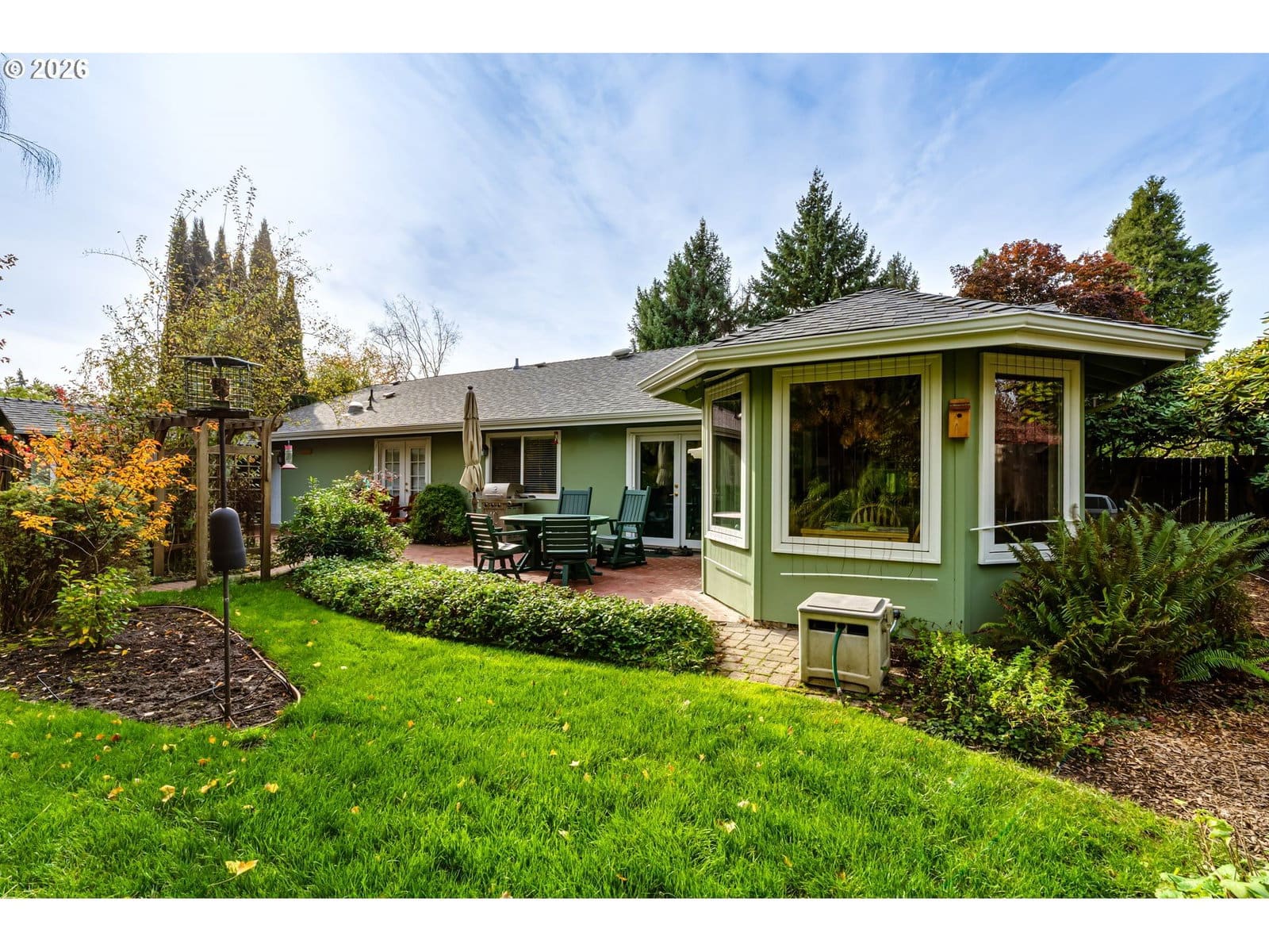 Highly desirable Chevy Chase neighborhood, ideally located near Autzen Stadium and the river canoe path. This meticulously maintained and thoughtfully upgraded single-level home offers far more than meets the eye.The light-filled interior features a vaulted living room with gas fireplace and hickory floors, an upgraded kitchen with granite countertops, maple cabinetry, gas cooking, and a generous eating area. The spacious primary suite includes French doors opening directly to the patio, while a well-placed family room or office also features French doors for flexible living. The backyard is a true sanctuary—beautifully landscaped with a water feature, brick walkways and patio, and established plantings that attract abundant birdlife (certified by the Habitat Haven Wildlife project). Additional highlights include a finished outbuilding with power, a finished two-car garage with epoxy floors, and a third-car garage with ample storage. A rare opportunity in one of Eugene’s most sought-after neighborhoods. Check out the video!