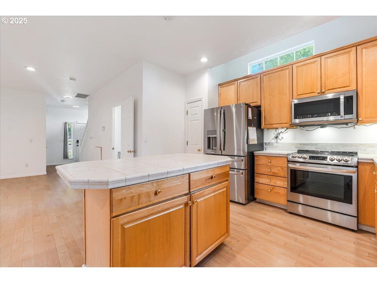 Beautiful West Linn convenience and affordability in this end-unit gorgeous townhome! Newer exterior paint (2023). Updates in 2024 include changed carpets, refinished wood floors, toilets, fresh interior paint! High ceilings and bamboo hardwoods throughout main floor. New lights in the house! Open kitchen with tile island, pantry, eating bar, and all upgraded appliances with high quality brands included. Vaulted primary suite with attached bath, walk-in closet, and private balcony. Both 2nd and 3rd bedrooms vaulted. Upstairs laundry room. Half guest bathroom has been remodeled with a new sink and lights! Large deck overlooking trees and privacy. Brand new roof installed in 2023. Fire textile has been changed and a retaining wall in the backyard! Walk to restaurants, shopping, Rosemont Ridge middle school!