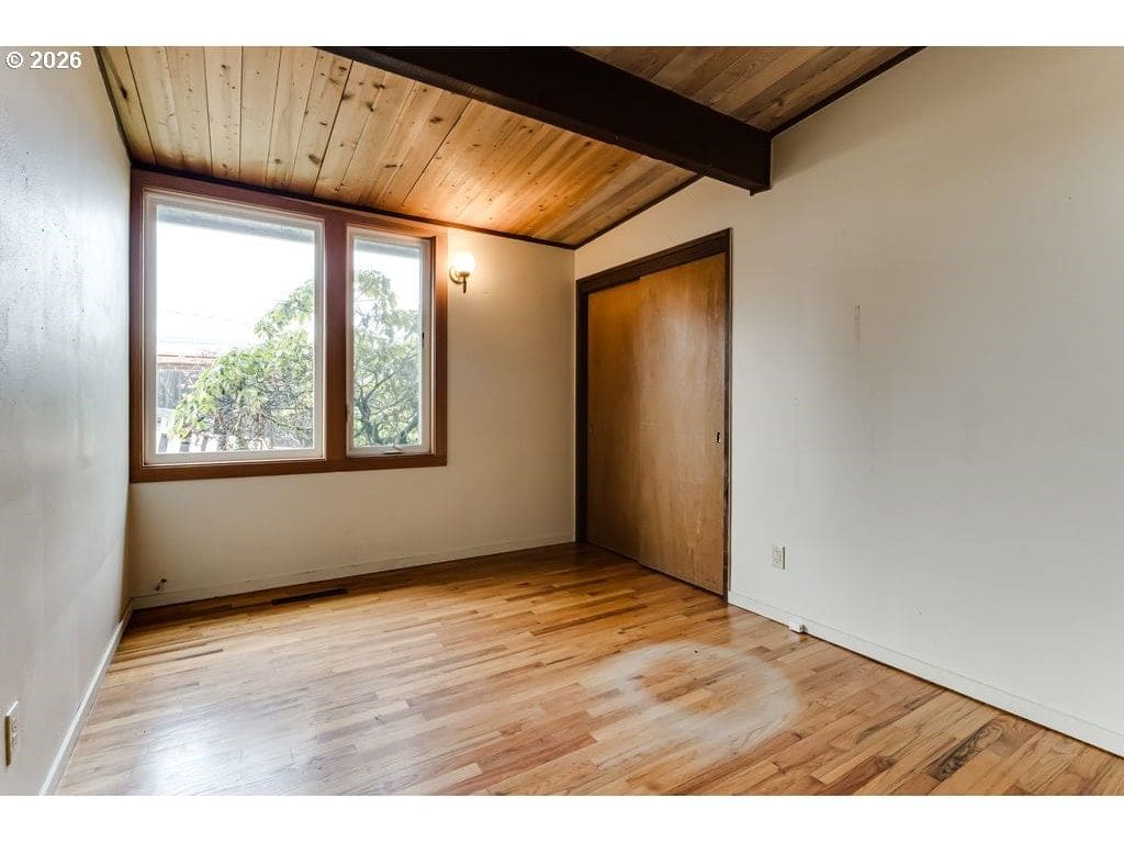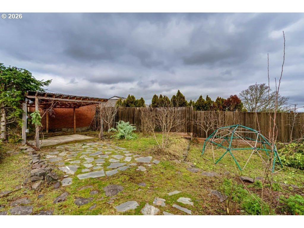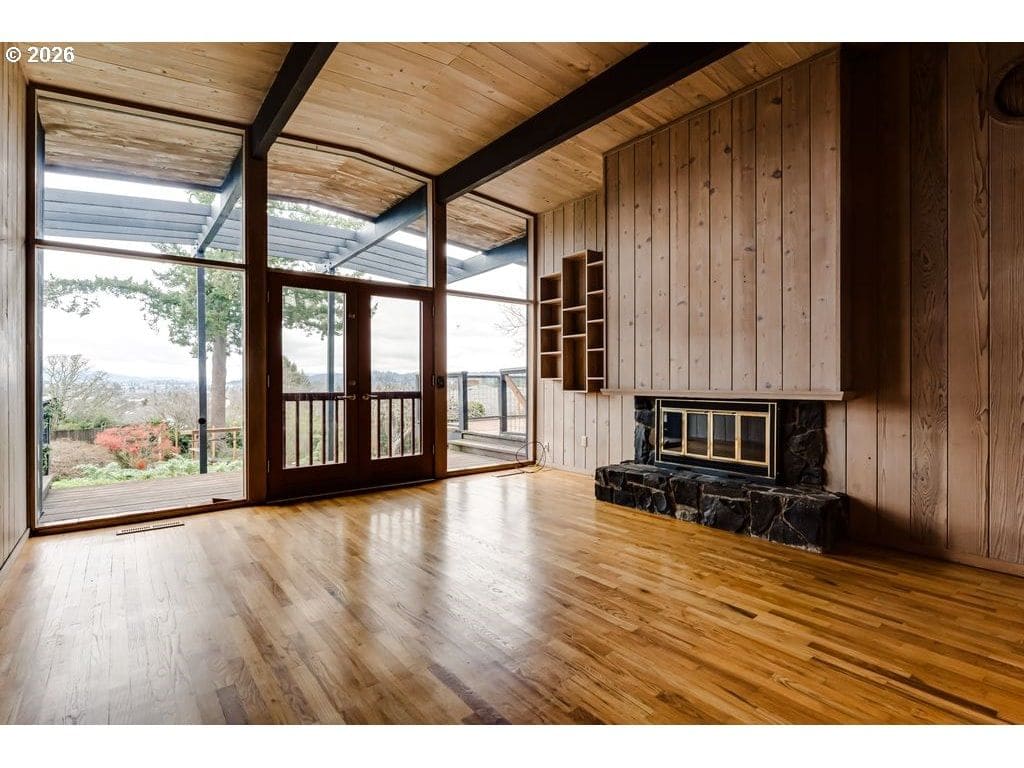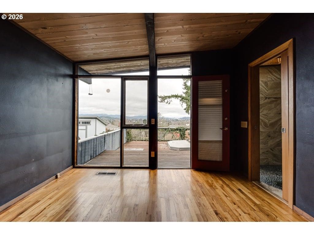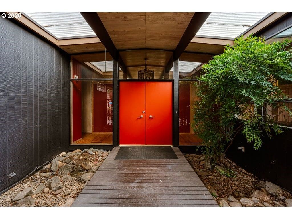 Tucked on one of the most desirable streets in Southwest Eugene and a neighborhood you will love coming home to, this light filled mid-century modern home blends character, comfort, and thoughtful organization throughout. Pull under the porte-cochere and enter through a covered atrium with tall double doors. Inside, a wall of windows spans the entire back of the home, framing sweeping valley views and filling the main living areas with natural light. The expansive covered deck extends your living space outdoors, offering a perfect place to relax or entertain while staying protected year-round. The interior features hardwood floors, warm cedar walls, open beamed ceilings, skylights, and two fireplaces — details that add both charm and functionality. The spacious living room and separate family room provide flexible options for gathering, working from home, hobbies, or quiet retreat. The primary suite has a large 7x9 closet and beautiful bathroom with one of a kind features. Outside, the fully fenced and private 1/3-acre yard is ready for gardeners and hobbyists alike, with fruit trees, generous planting space, and plenty of room to personalize. Pocket doors and smart layout choices throughout the home make everyday living easy and efficient. Two sheds and the carport provide plenty of storage. Washer and dryer are included for added convenience. Be sure to tour this desirable and distinctive home while it's available!
