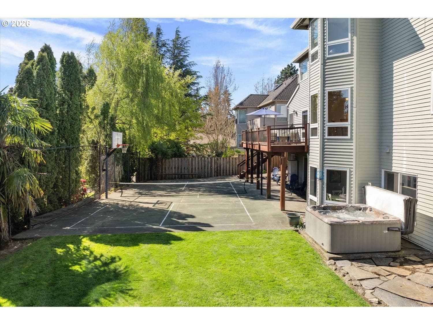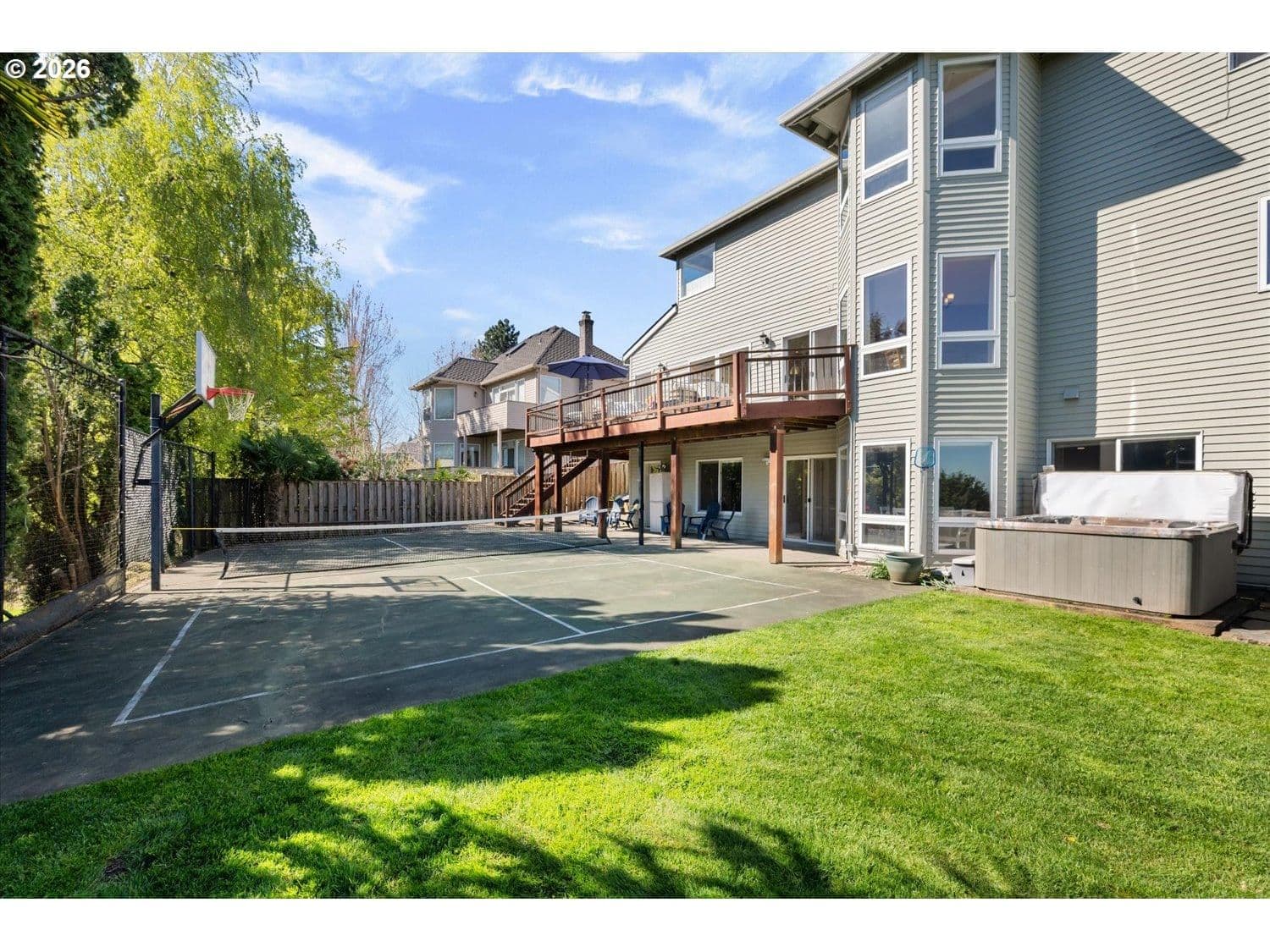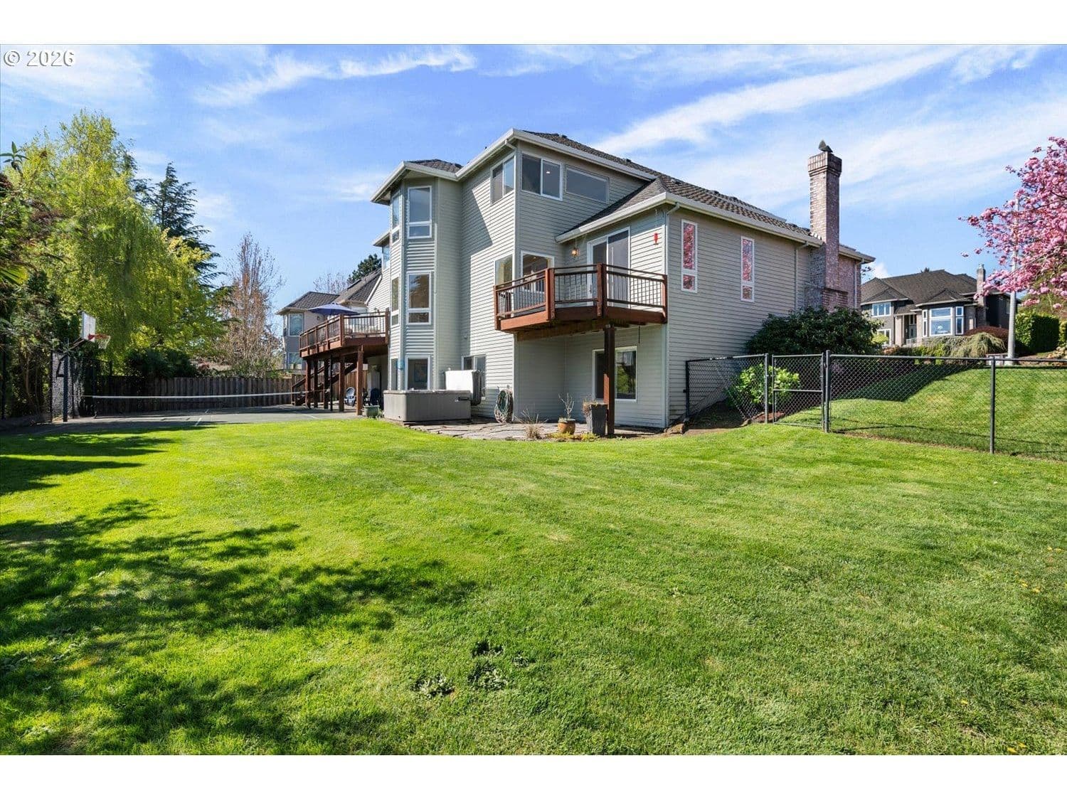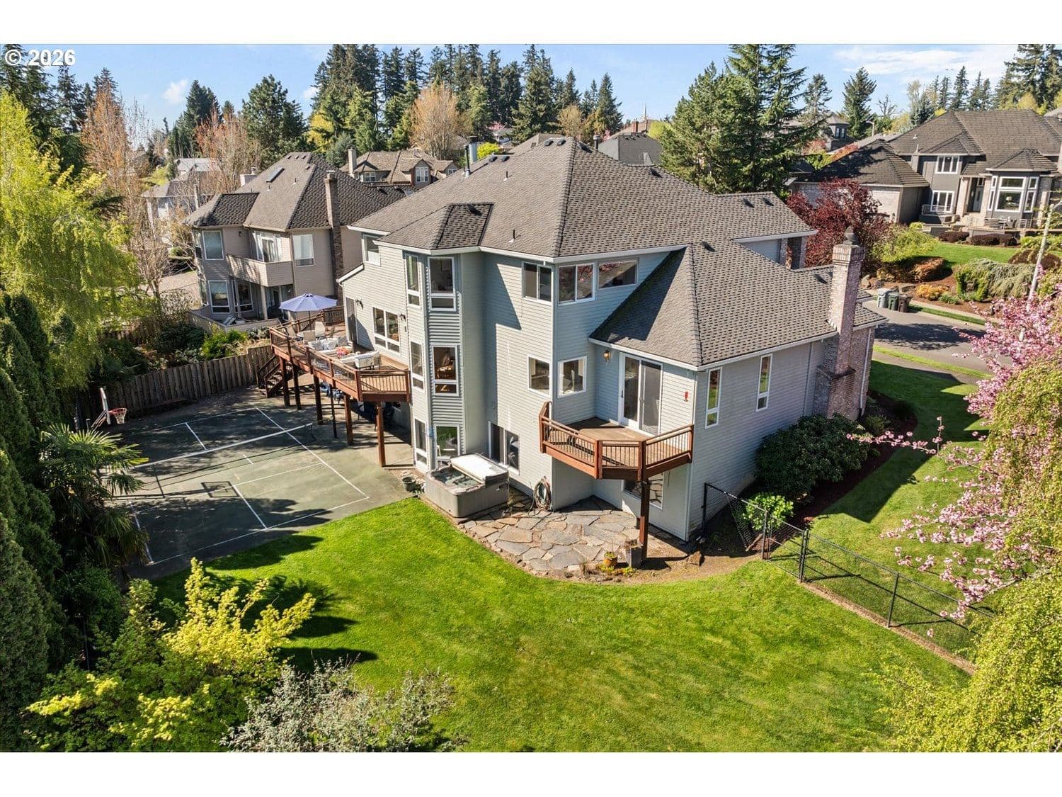 Set in a well-established West Linn neighborhood, this 5 bedroom, 4.5 bathroom home offers a spacious and well-designed layout with easy access to schools, shopping, restaurants, and major commuting routes. The kitchen and living room create a central gathering space, connecting to a sunroom that opens to a large deck that spans the back of the home and captures peek-a-boo views of Mt. Rainier, Mt. Adams, and Mt. St. Helens. The primary suite also enjoys mountain and territorial views, adding to the home’s connection to its surroundings. Recent updates include fully remodeled shared bathrooms and new carpet, creating a clean and refreshed feel throughout. The lower level has been thoughtfully improved to expand functionality, featuring a recreation room with a new kitchenette, an updated bathroom, and a flexible room currently used as a home gym. Sliding doors provide direct access to the backyard, where a sports court and hot tub create additional outdoor living opportunities. Multiple decks and outdoor areas offer options for relaxing or entertaining. A large laundry room and abundant storage throughout add to the home’s everyday convenience. The home offers a flexible floor plan that supports a variety of living needs, combining everyday comfort with space to spread out both inside and out.
