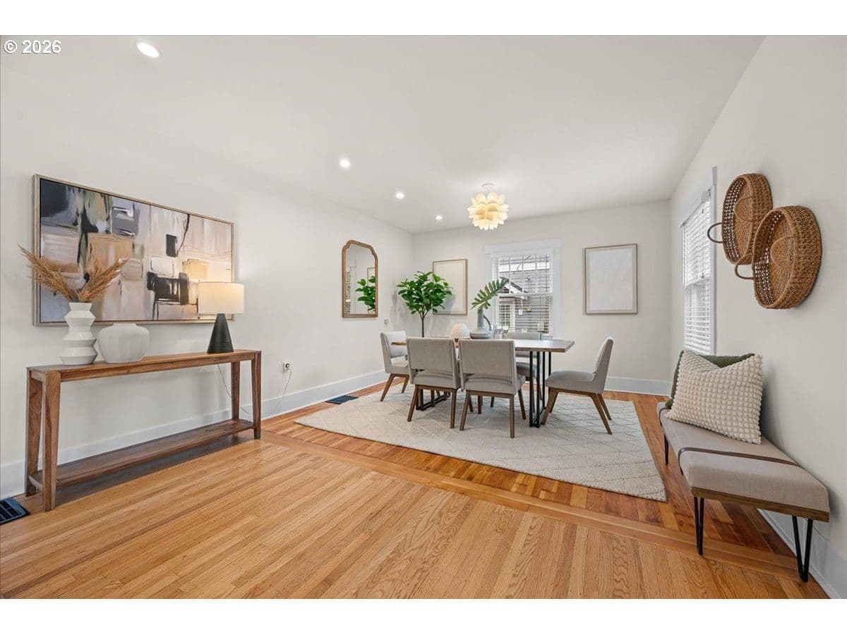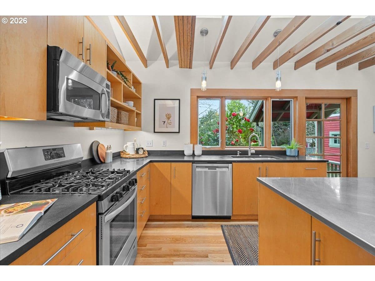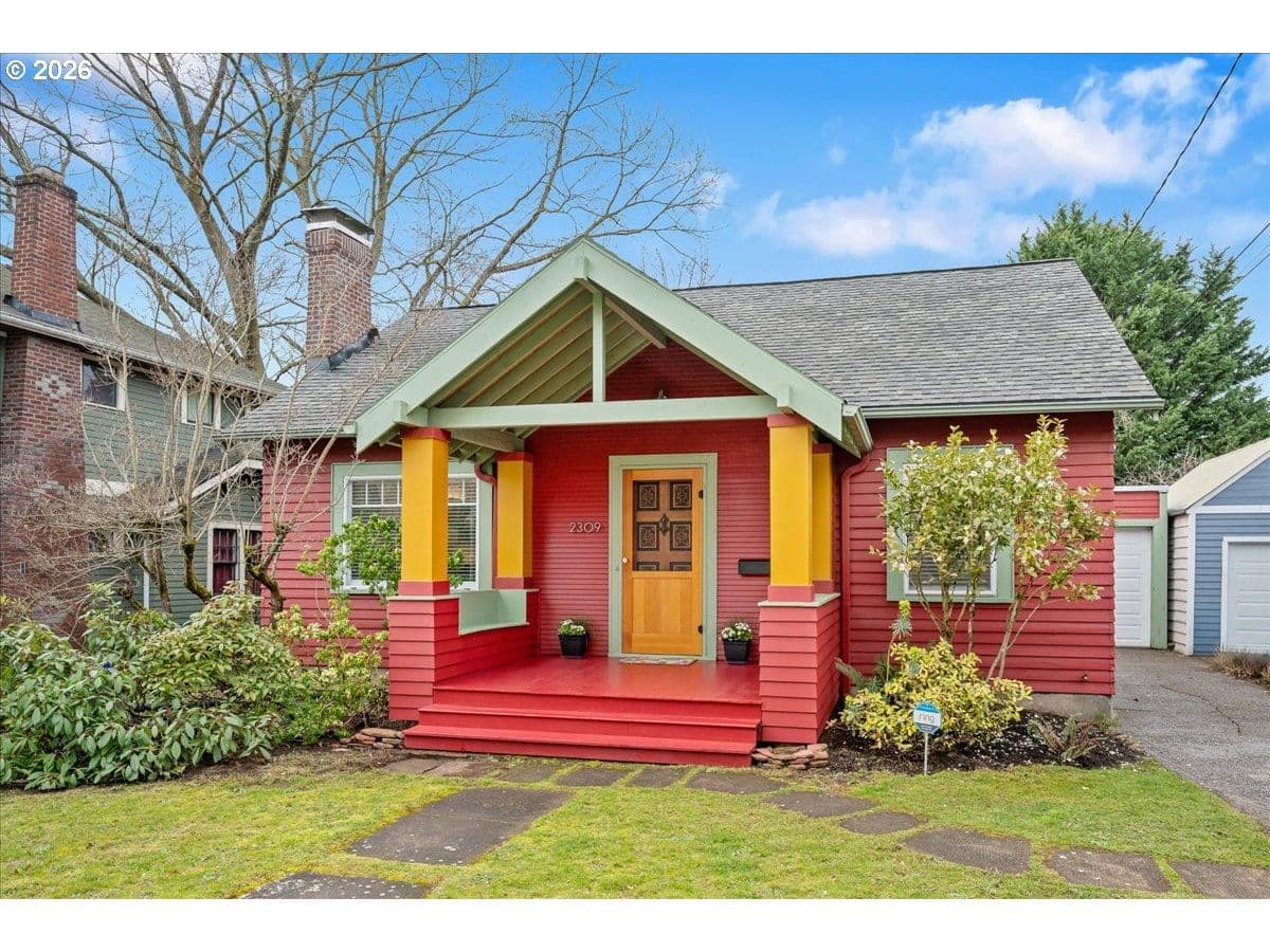 The charm of this 1922 Bungalow begins at the curb with a big covered front porch complete with built-in benches. The front door opens to a spacious living room featuring oak floors, a woodburning fireplace and a built-in bookcase. On the other side of the room, gleaming fir floors frame a formal dining room with a large picture window. At the heart of the home is a spacious kitchen. Vaulted ceiling with skylights, honed granite countertops, and ample cabinets set the stage for the centerpiece - a wonderful stainless-steel island. The primary bedroom and a fully updated bathroom are on the main floor. Upstairs are 2 bedrooms with fir floors. A large basement with a laundry area offers expansion opportunities - perhaps a family room, office, workshop, or 2nd bathroom. Outside, a large, private, fully-fenced, west-facing backyard invites entertaining, relaxing, and gardening. A detached 1-Car garage rounds out this move-in ready property. All of this just blocks from coveted Mt Tabor Park as well as the popular shops, culinary hotspots, and theaters on Hawthorne and Division. It is also just a block from the Lincoln St bike path. A truly incredible location! [Home Energy Score = 4. HES Report at https://rpt.greenbuildingregistry.com/hes/OR10054000]