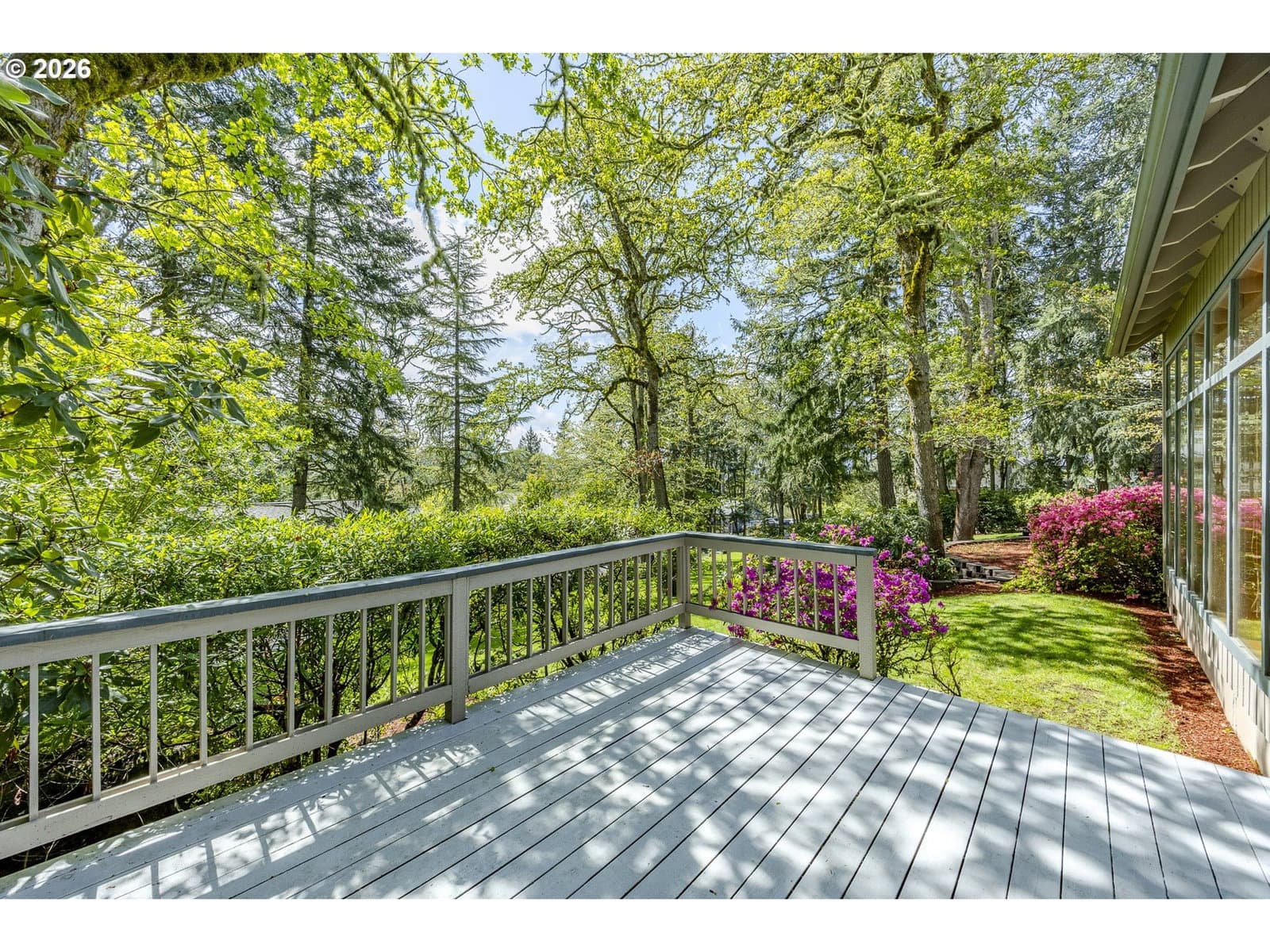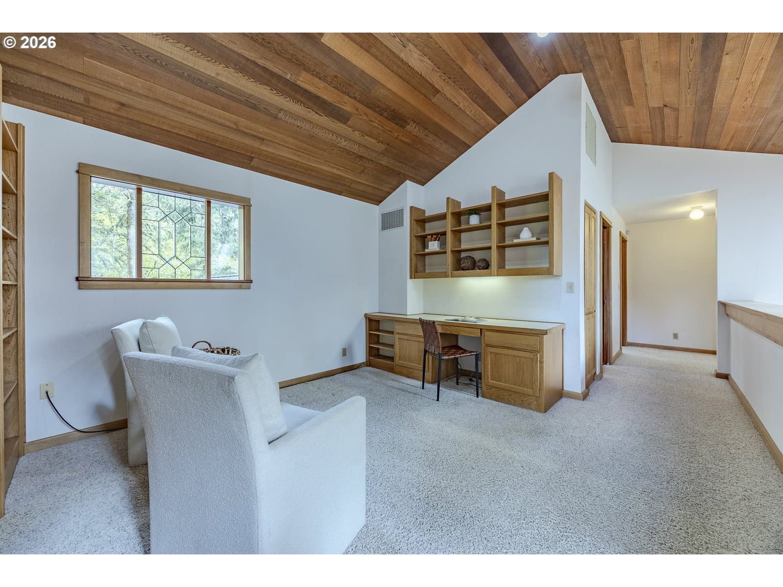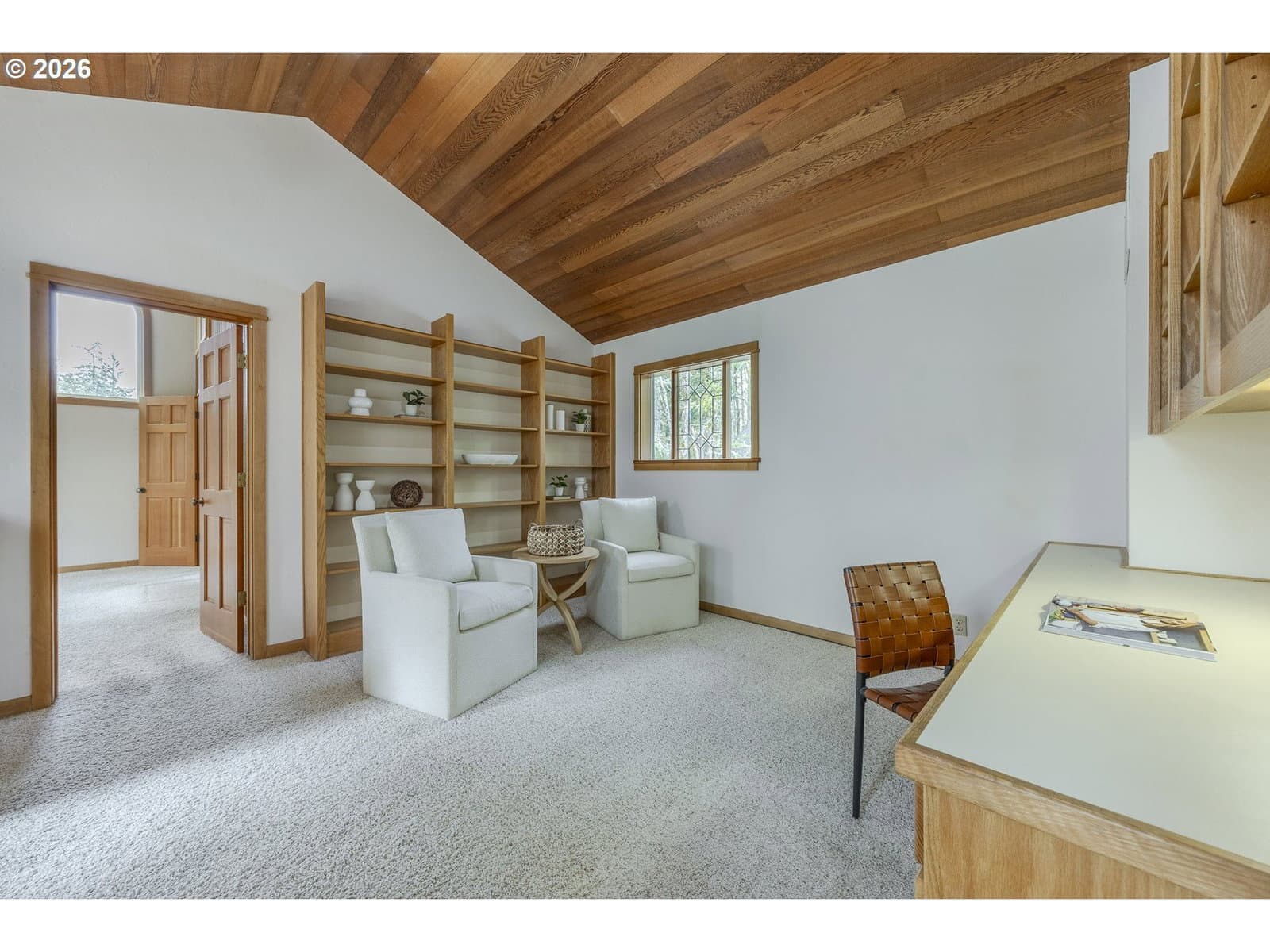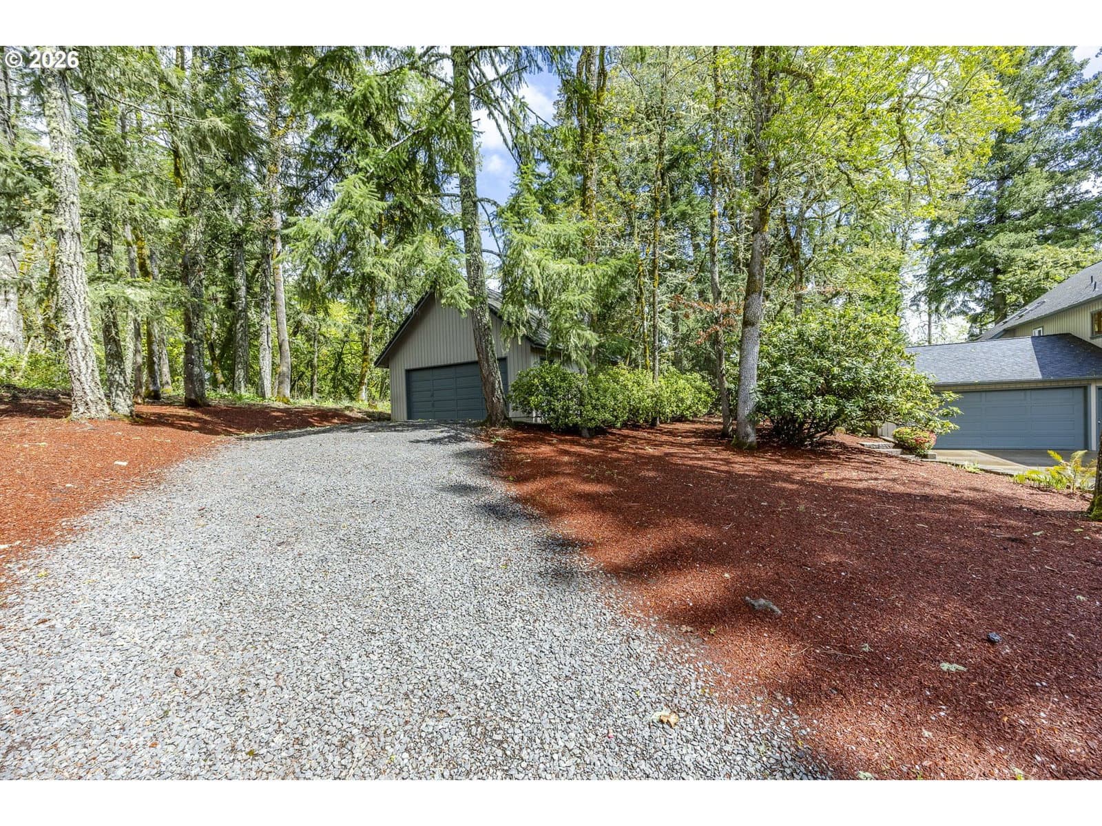 Tucked away on a private driveway and set on .71 acres, this inviting property offers a rare blend of privacy, space, and natural beauty—all within town and with views of Spencer Butte. Surrounded by a park-like setting, the home welcomes you with a charming front porch complete with a swing. Inside, distinctive architectural details shine throughout. The home opens to a stunning living room featuring a wall of windows, exposed beamed ceilings, and rich hardwood floors that bring warmth and character to the space. The formal dining room flows into a thoughtfully designed kitchen with an eat-at island, as well as a cozy bay window dining nook. The family room, anchored by a fireplace, opens into a spacious sunroom with tile flooring and direct access to the deck—ideal for entertaining or enjoying indoor-outdoor living year-round. A convenient main-level laundry room offers built-in desk space and abundant storage. Upstairs, a versatile loft with built-in bookcases and desk provides the perfect space for a home office, reading retreat, or workout area. The ensuite primary bedroom features vaulted ceilings and a walk-in closet, while two additional bedrooms each offer their own unique charm with built-ins, skylights, vaulted ceilings, and walk-in closets. Outdoors, the expansive property invites exploration and boarders the Ridgeline Trail system. Not only do you have an attached two car garage there is an additional detached two-car garage that includes a dedicated workspace, adding flexibility for hobbies or storage. Carefully updated while preserving its original character, this home beautifully blends timeless design with modern comfort—truly welcoming the outdoors in.