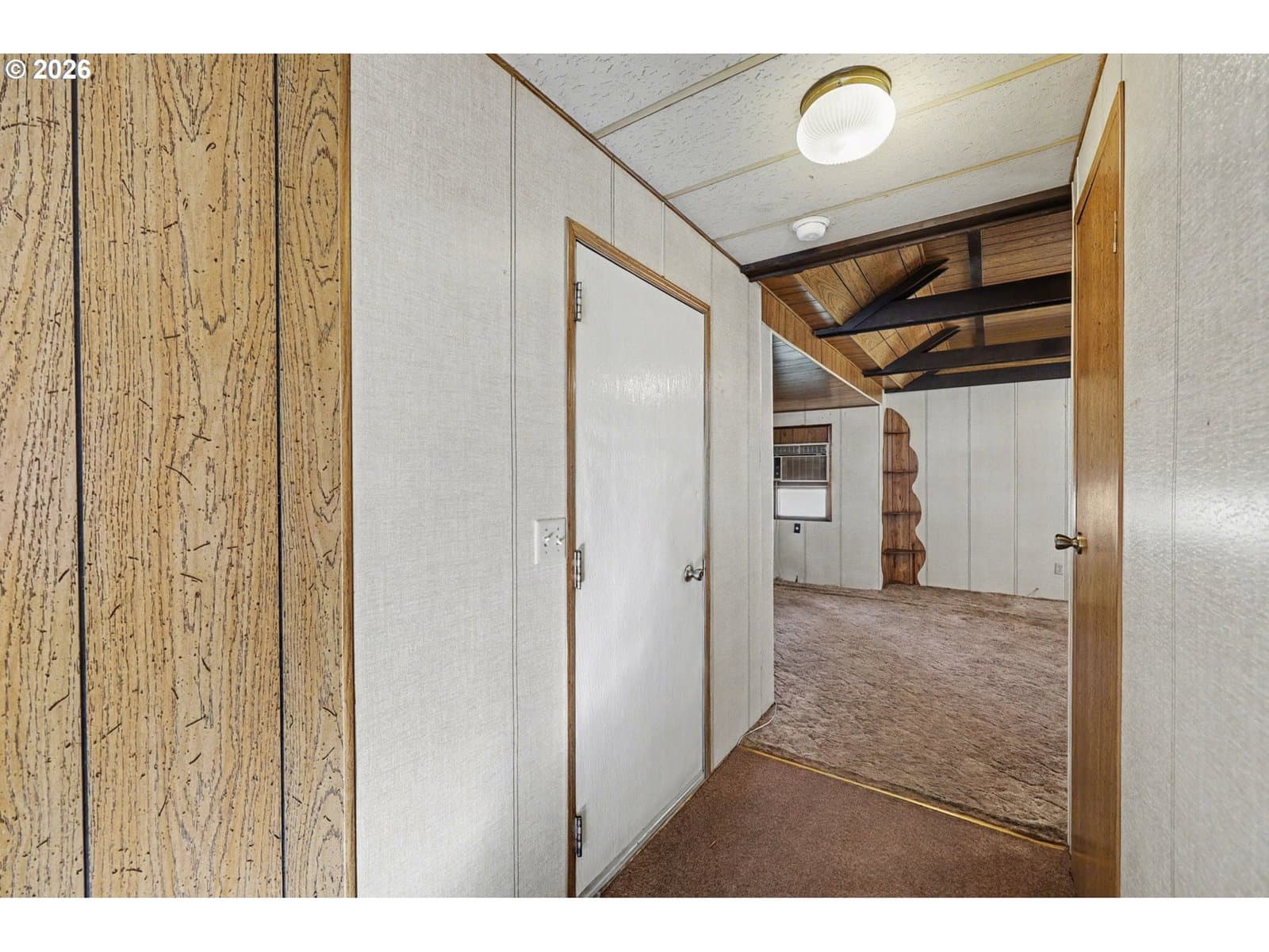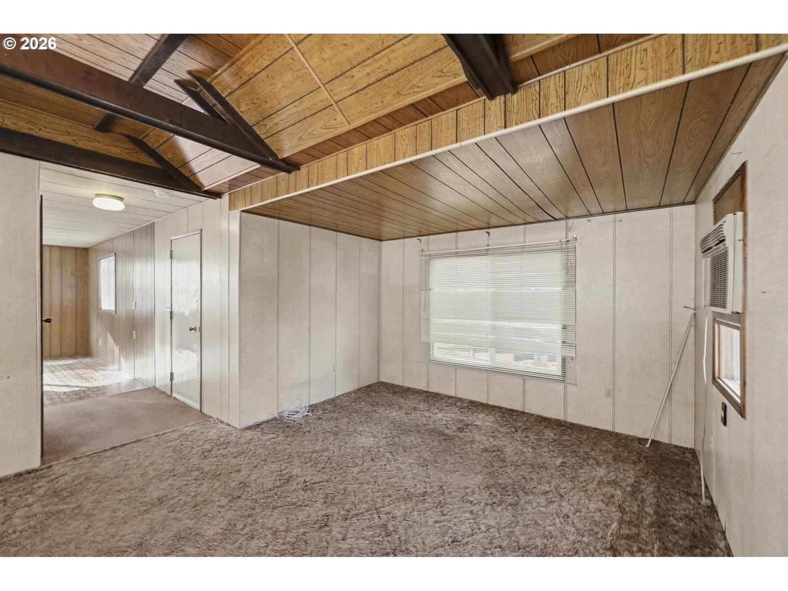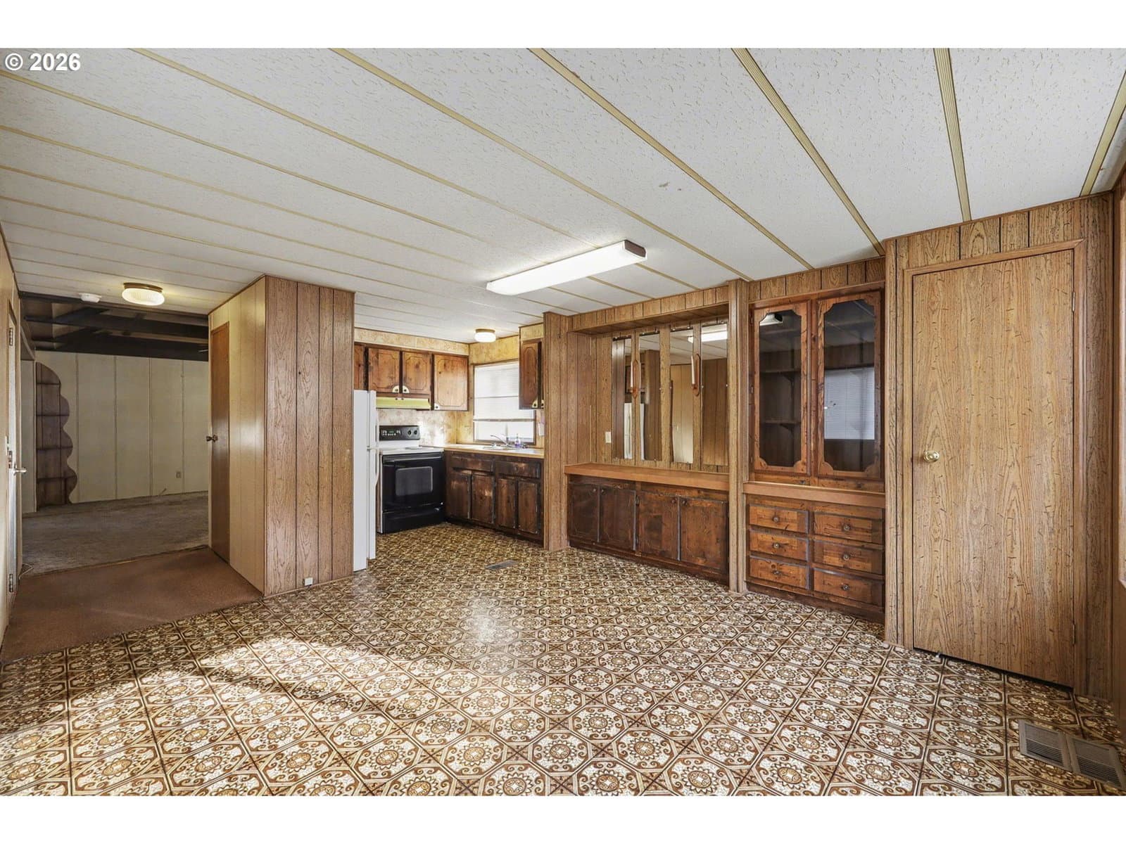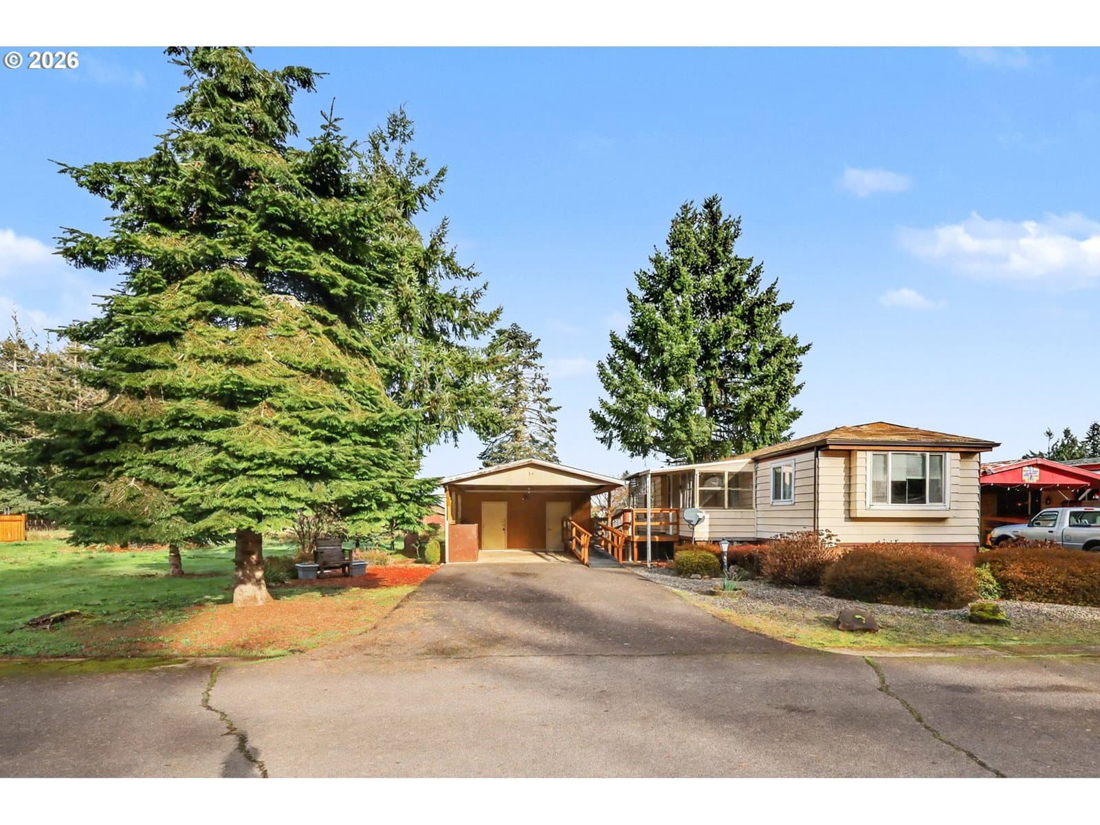 Charming two bedroom, one bath manufactured home located in a desirable 55+ community. Home features a large dining room with ample storage, along with raised open beam ceiling in the living room. The home is situated adjacent to a park-like green space, offering a peaceful and scenic setting. The community is quiet, well-maintained, and welcoming, with a friendly atmosphere and exceptionally low space rent. This home sold "as is", Seller to do no repairs.