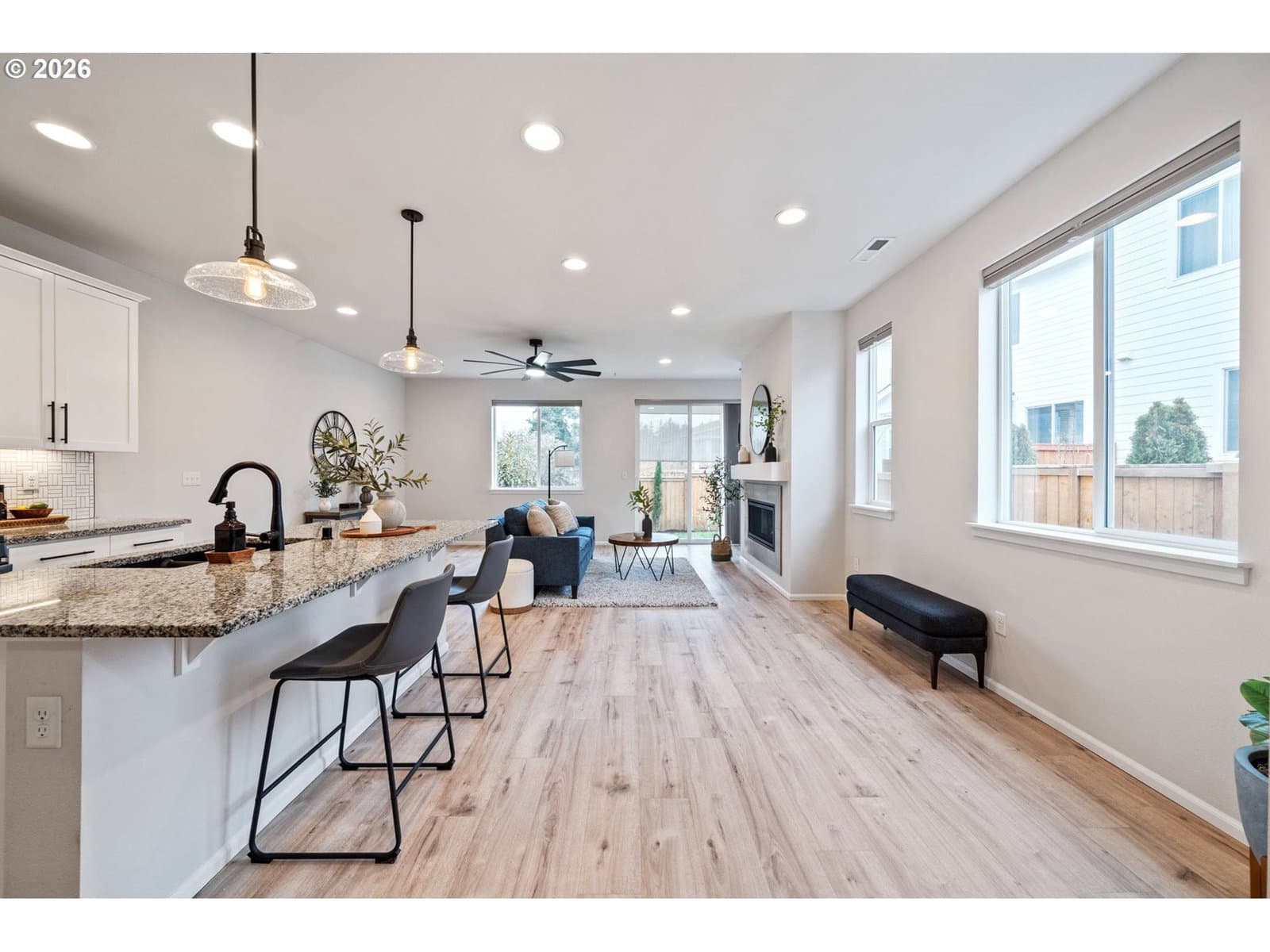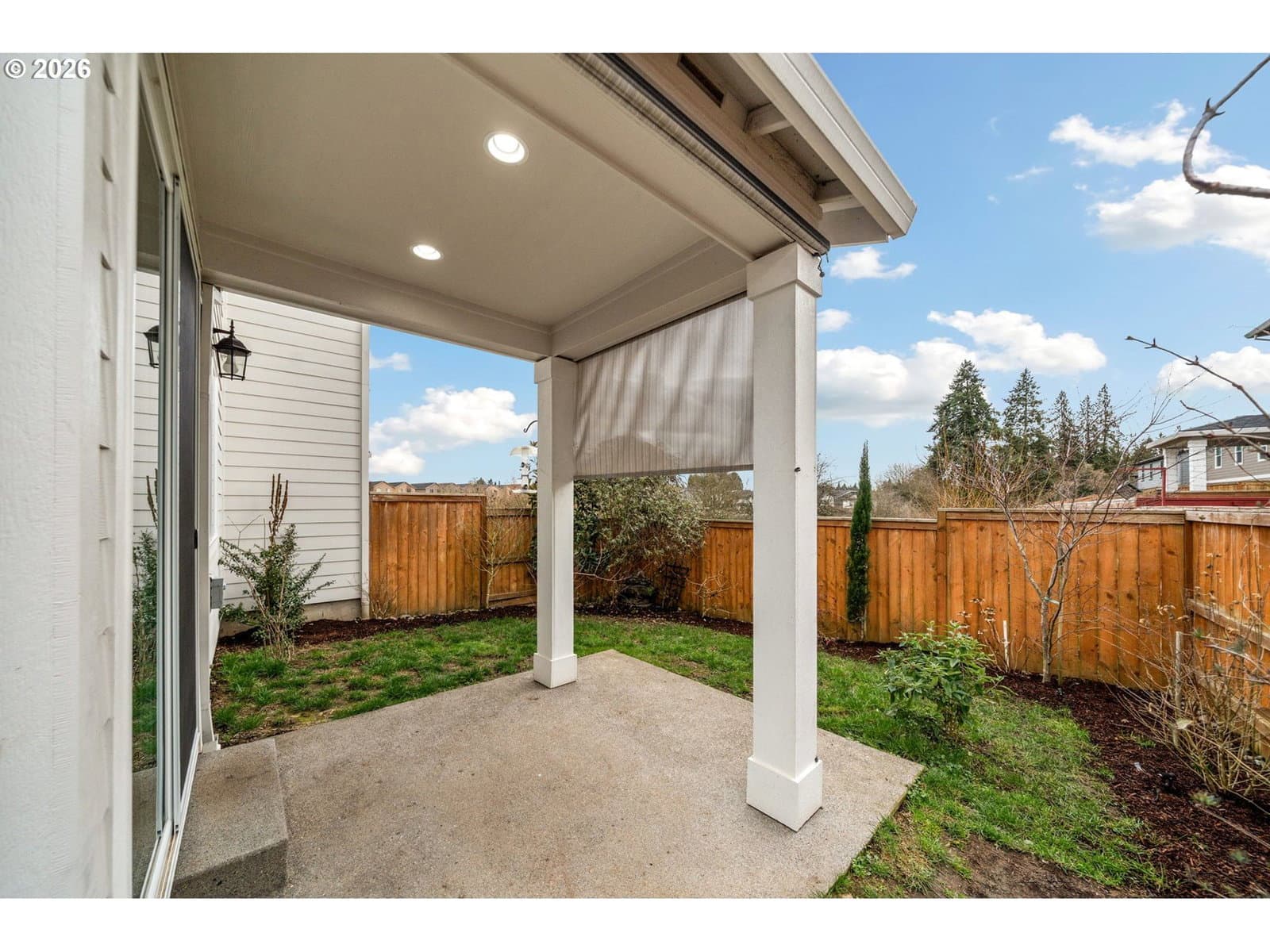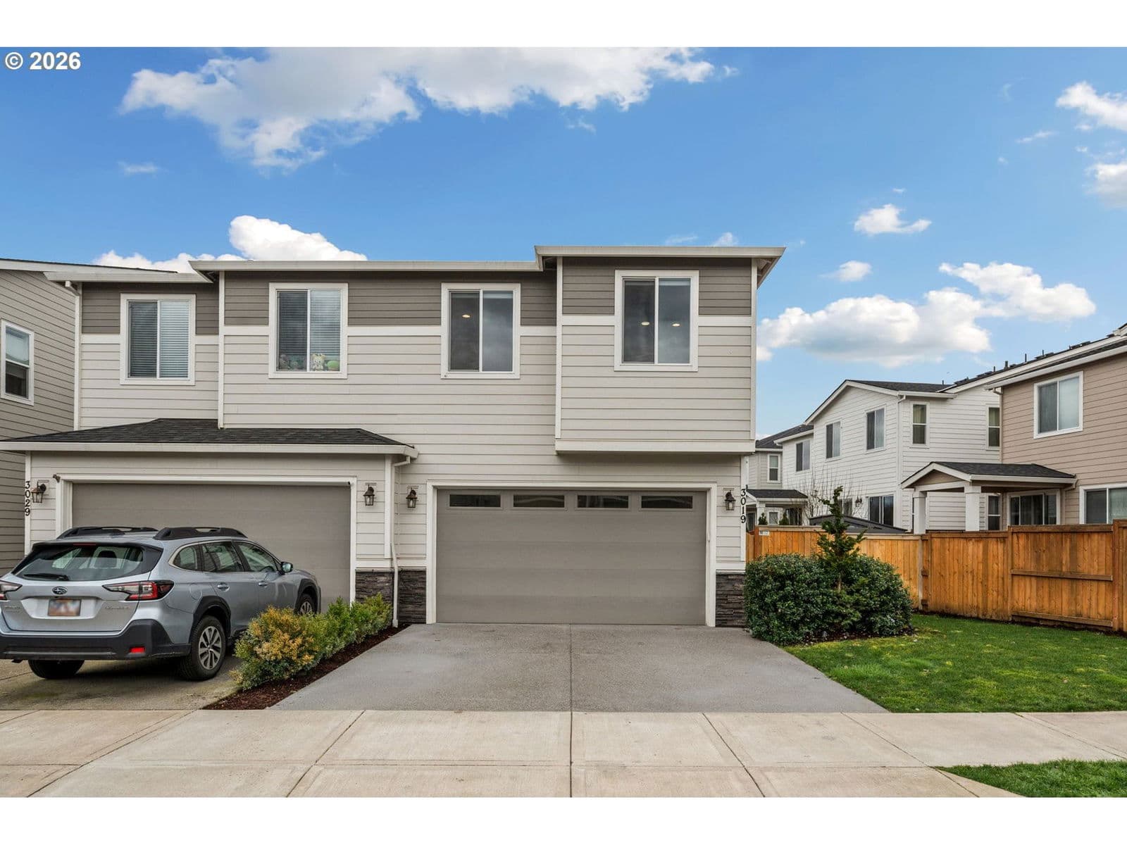 Located in Ridgefield’s desirable Kemper Grove neighborhood, this upgraded townhome offers a rare combination of privacy, modern finishes, and low-maintenance living with HOA dues of just $78 per month including front landscaping. Backing to greenspace with sweeping territorial views and set on a larger lot, the property features a fenced backyard with a covered patio plumbed for natural gas, three storage sheds, and direct access to peaceful outdoor surroundings just blocks from neighborhood parks, walking trails, and a future dog park. The modern elevation welcomes you into an open-concept floor plan featuring a spacious great room anchored by a tile-surround gas fireplace, creating a warm focal point for everyday living and entertaining. Upgraded can lighting enhances the light and bright feel throughout, complemented by durable LVP flooring on the main level, new carpet installed in 2026 upstairs, and fresh interior paint for a clean, move-in-ready finish. The kitchen showcases white cabinetry, granite countertops, and an upgraded stainless steel appliance package including refrigerator, built-in microwave, and dishwasher, along with a pantry and eat-in island designed for functionality and casual dining. A sliding glass door connects the dining area to the backyard, offering seamless indoor-outdoor flow. All bedrooms are wired for ceiling fans and all closets feature electrical outlets for added flexibility. Additional highlights: 8' Doors on main, extra insulation between homes for enhanced comfort and sound reduction, whole-house blinds, a high-efficiency tankless water heater, efficient furnace and air conditioning, and a two-car garage. Well-maintained and ideally located with convenient access to shopping, dining, services, and major commuter routes, this home delivers comfort, efficiency, and scenic living in one of Ridgefield’s most sought-after communities.