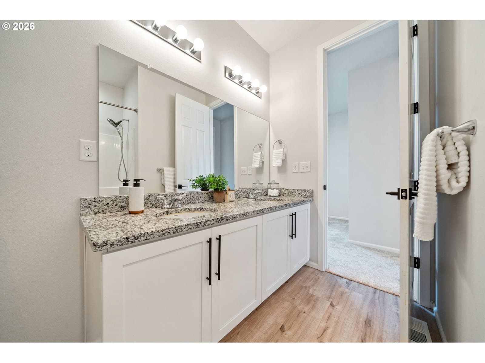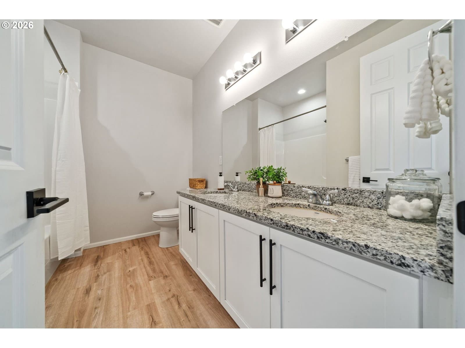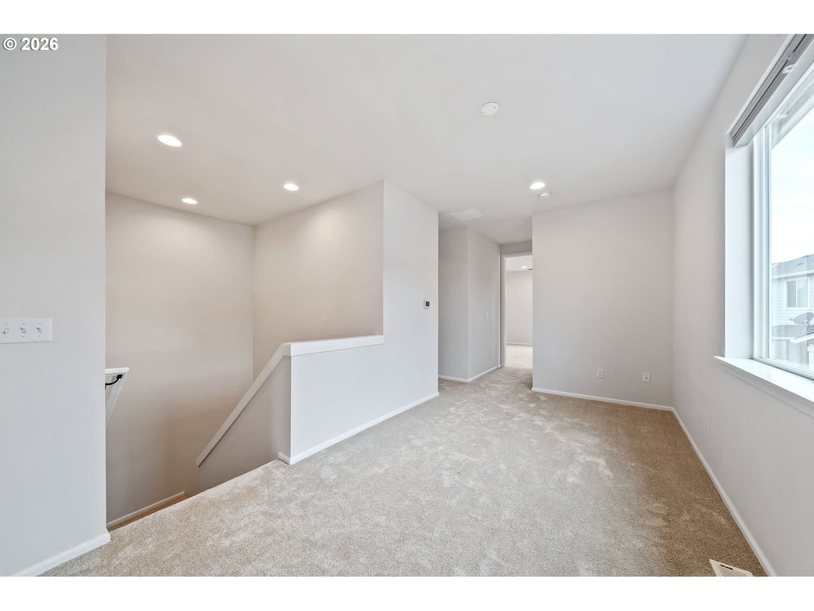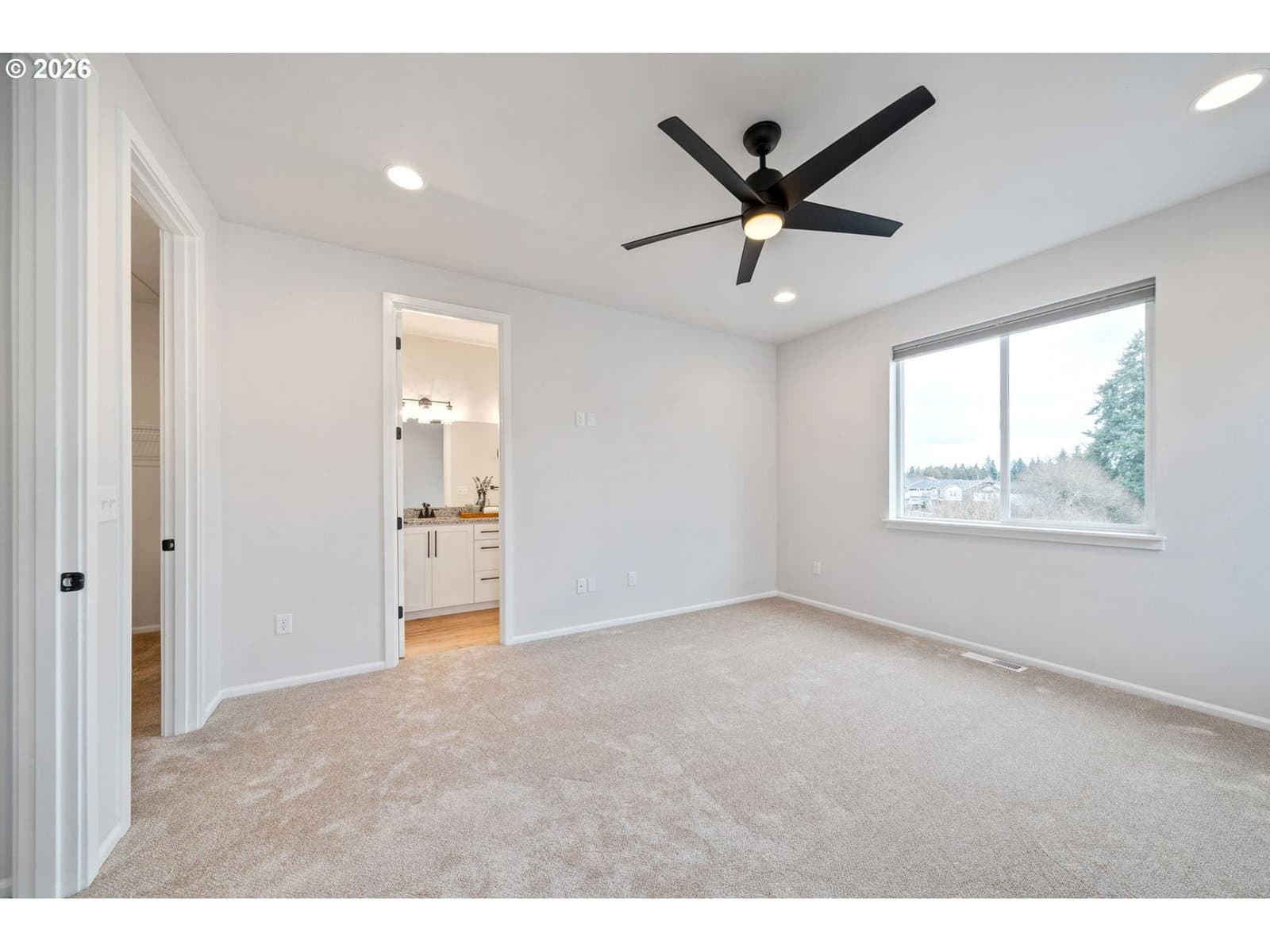 Located in Ridgefield’s desirable Kemper Grove neighborhood, this upgraded townhome offers a rare combination of privacy, modern finishes, and low-maintenance living with HOA dues of just $78 per month including front landscaping. Backing to greenspace with sweeping territorial views and set on a larger lot, the property features a fenced backyard with a covered patio plumbed for natural gas, three storage sheds, and direct access to peaceful outdoor surroundings just blocks from neighborhood parks, walking trails, and a future dog park. The modern elevation welcomes you into an open-concept floor plan featuring a spacious great room anchored by a tile-surround gas fireplace, creating a warm focal point for everyday living and entertaining. Upgraded can lighting enhances the light and bright feel throughout, complemented by durable LVP flooring on the main level, new carpet installed in 2026 upstairs, and fresh interior paint for a clean, move-in-ready finish. The kitchen showcases white cabinetry, granite countertops, and an upgraded stainless steel appliance package including refrigerator, built-in microwave, and dishwasher, along with a pantry and eat-in island designed for functionality and casual dining. A sliding glass door connects the dining area to the backyard, offering seamless indoor-outdoor flow. All bedrooms are wired for ceiling fans and all closets feature electrical outlets for added flexibility. Additional highlights: 8' Doors on main, extra insulation between homes for enhanced comfort and sound reduction, whole-house blinds, a high-efficiency tankless water heater, efficient furnace and air conditioning, and a two-car garage. Well-maintained and ideally located with convenient access to shopping, dining, services, and major commuter routes, this home delivers comfort, efficiency, and scenic living in one of Ridgefield’s most sought-after communities.