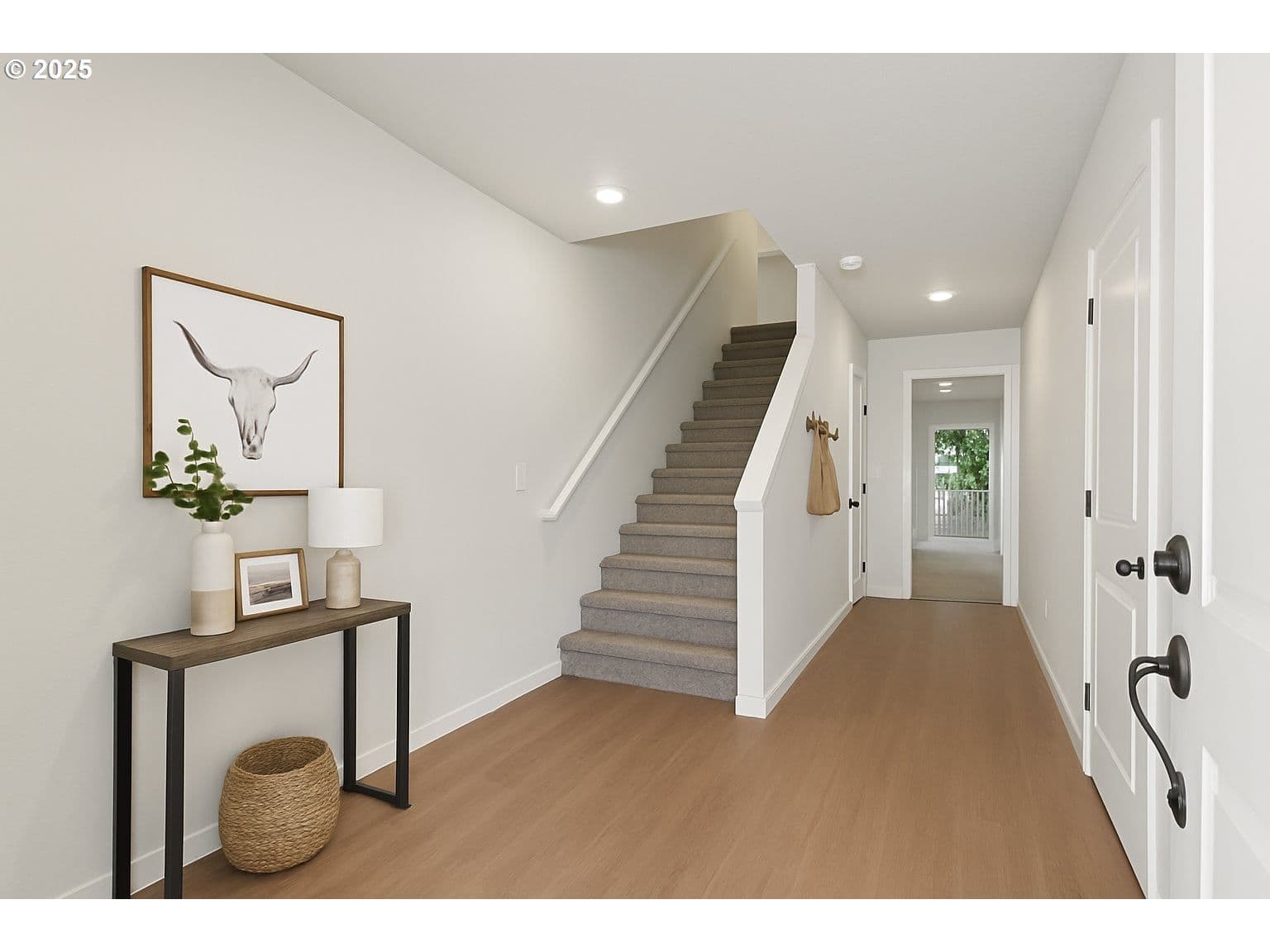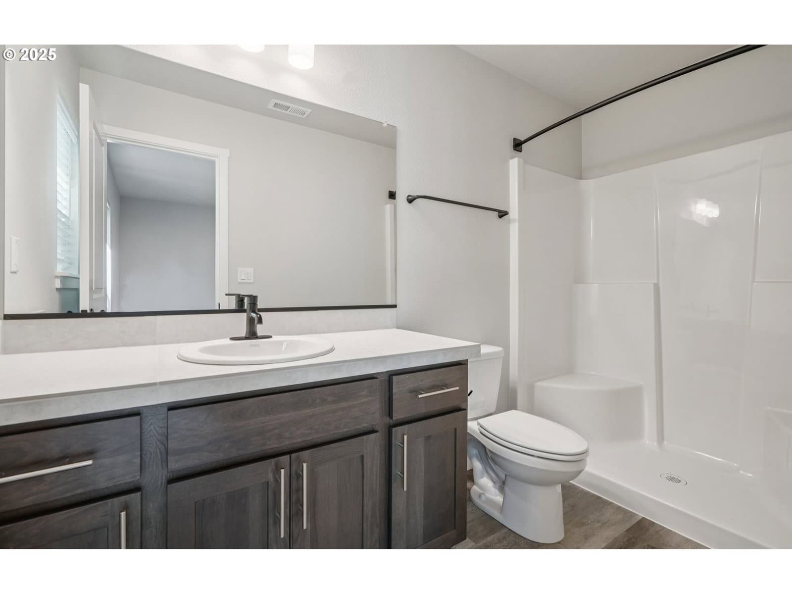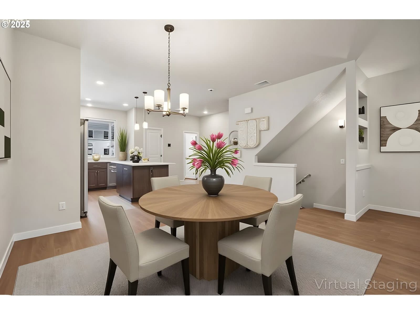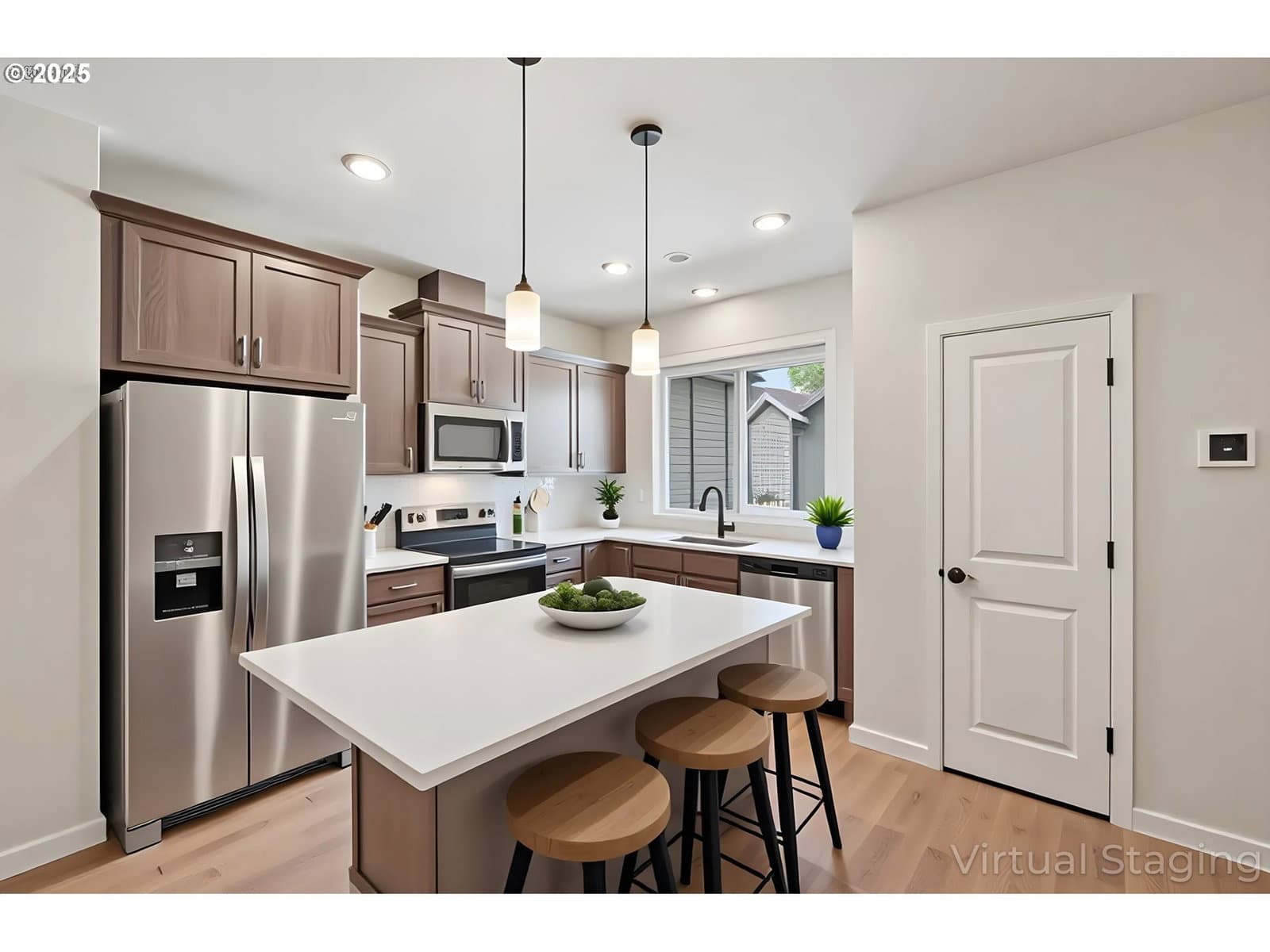 New Construction North-facing home with high ceilings and three spacious bedrooms, each featuring a private full bath—ideal for multigenerational living or roommates. Convenient lower-level suite with no stairs offers flexible and accessible living. The expansive great room features laminate flooring and an open-concept layout. Kitchen includes a quartz island, stainless steel appliances, and walk-in pantry. Stacked washer/dryer, refrigerator, blinds are all included. Central A/C for year-round comfort.Private fenced yard provides outdoor space for relaxation. Prime location near Intel, Market of Choice, shopping, dining, and major employers. HOA covers exterior maintenance including roof, siding, windows, and front yard/common area landscaping.