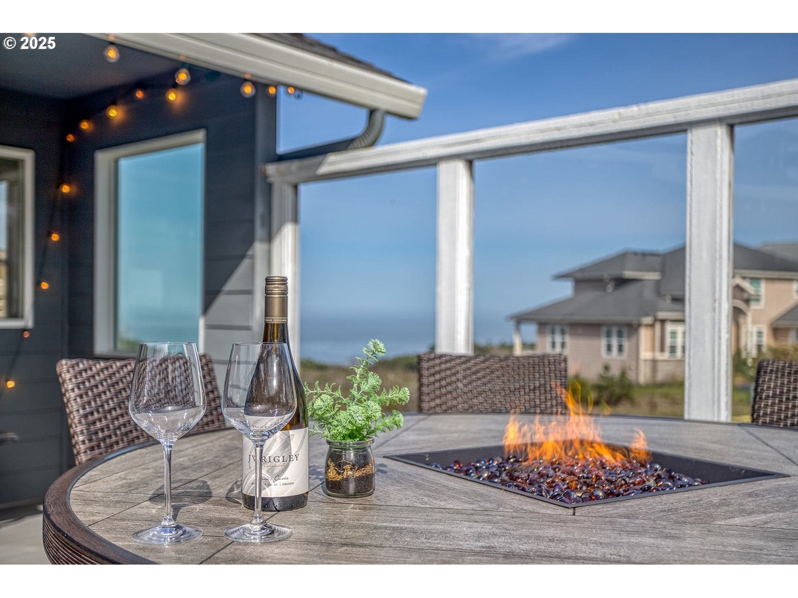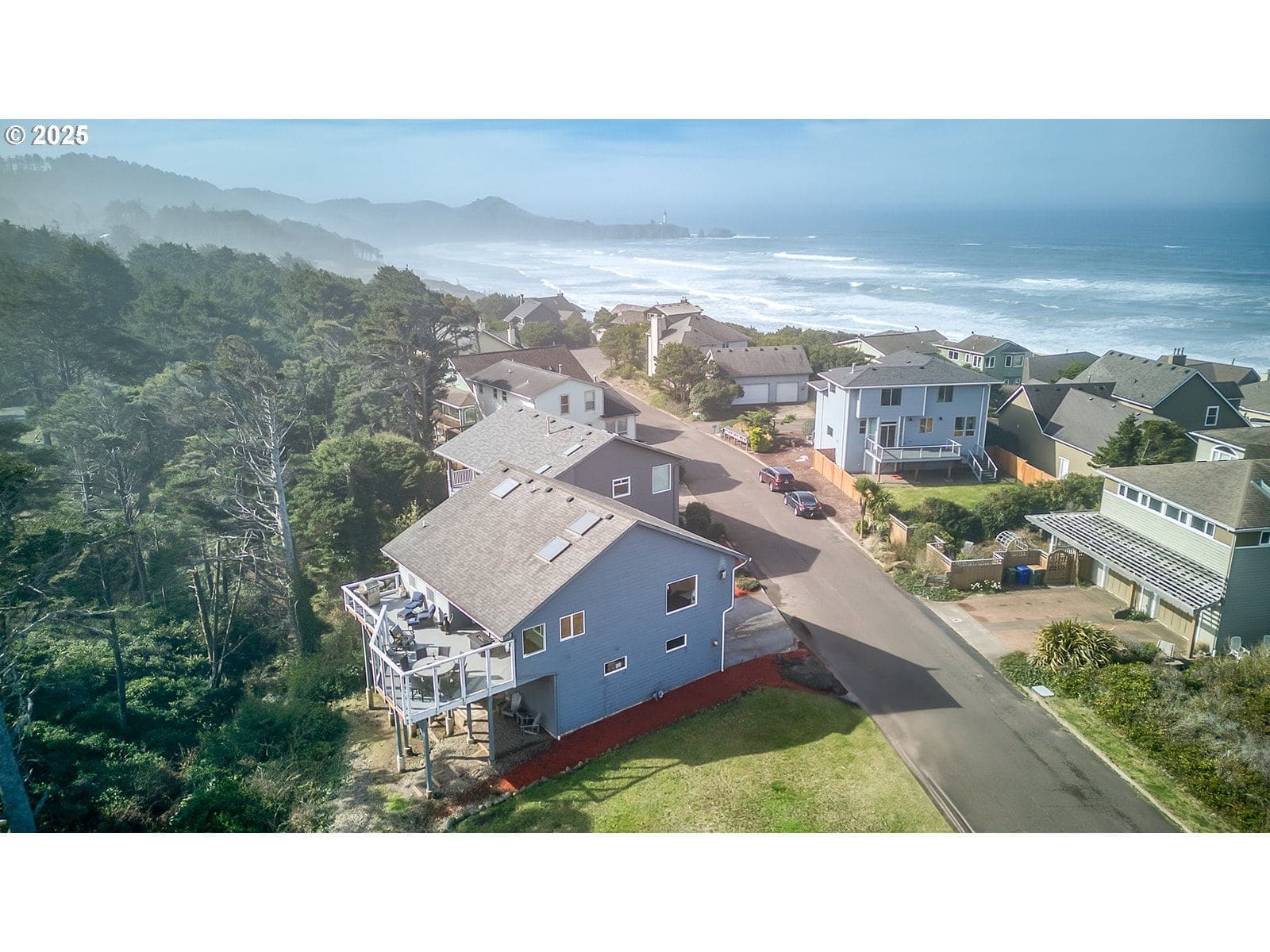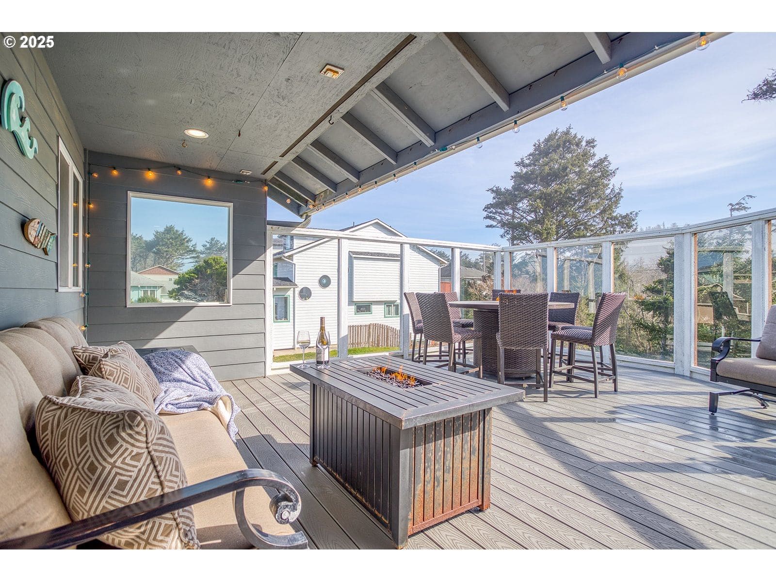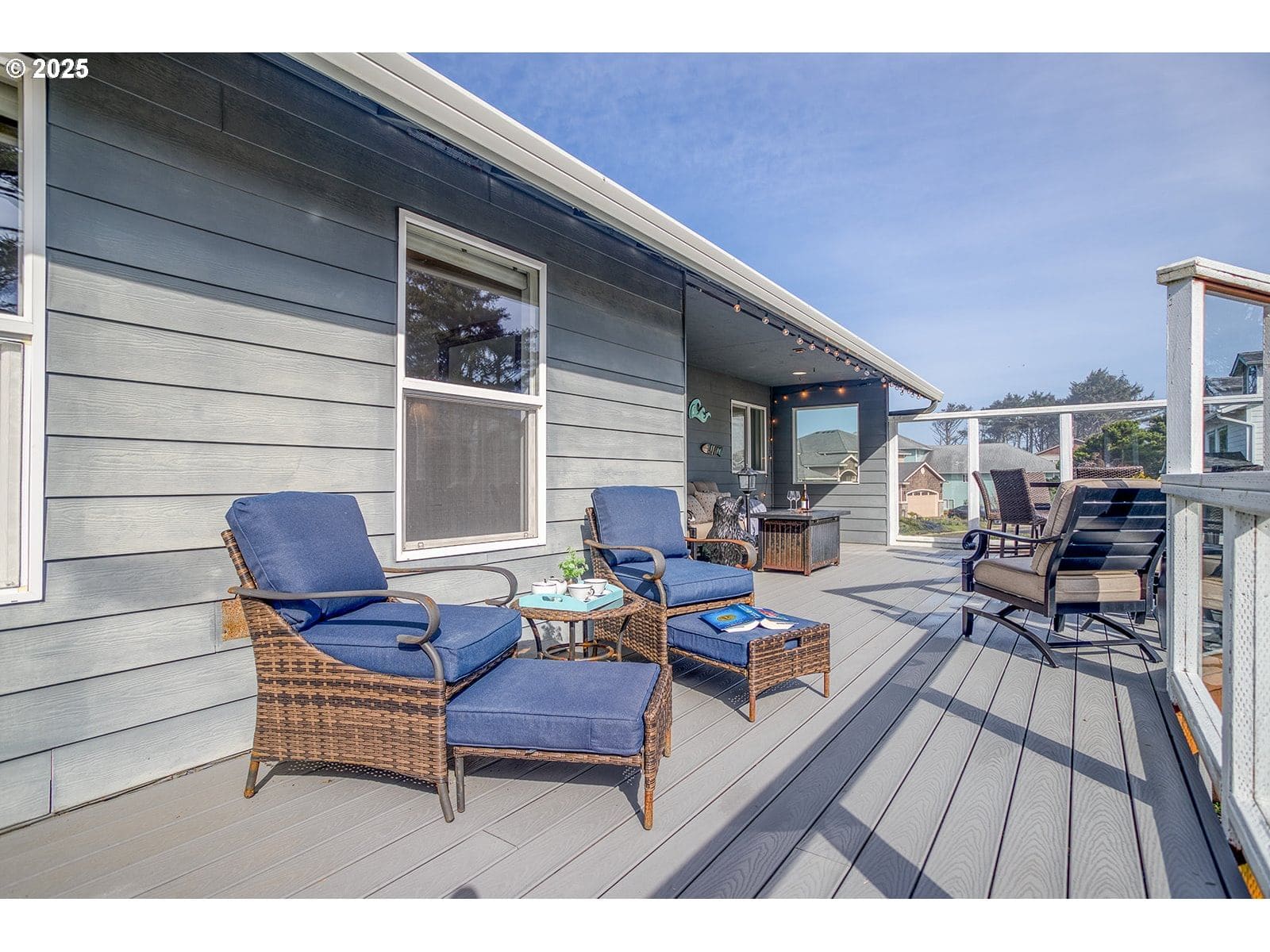 Welcome to this beautifully updated ocean-view home in Newport, where luxury meets coastal charm. Offering sweeping views of the Pacific Ocean, enjoy watching whales, fishing boats, and vibrant sunsets from this meticulously maintained 3-bedroom, 2.5-bathroom retreat. The open-concept great room is filled with natural light, featuring vaulted ceilings, skylights, and a wall of windows, all complemented by built-in surround sound speakers. Vinyl plank flooring adds both elegance and durability throughout the home, while a partially enclosed glass windbreak on the upstairs deck ensures year-round enjoyment for relaxing or entertaining. The deck is also plumbed for a gas grill, ideal for coastal dining. A chef-inspired kitchen boasts rich walnut cabinets, a convection oven and microwave, instant hot water, and a convenient pantry. The primary suite is a true sanctuary, featuring a Jacuzzi tub, walk-in closet, laundry chute to the nearby laundry room, and is plumbed for a gas fireplace, allowing you to create the ultimate retreat. Both bathrooms offer luxurious dual shower heads, elevating your everyday experience. For added convenience, this home is equipped with central vacuum, and the garage is plumbed for a gas crab pot, perfect for your coastal culinary adventures. Additional storage in the daylight basement provides ample space for all your outdoor gear, from kayaks to bicycles. With deeded beach access via the 'Beach Path,' you'll be just steps away from the stunning Yaquina Head Lighthouse. This home offers the perfect blend of comfort, luxury, and location, making it an unparalleled opportunity for oceanfront living in Newport.
