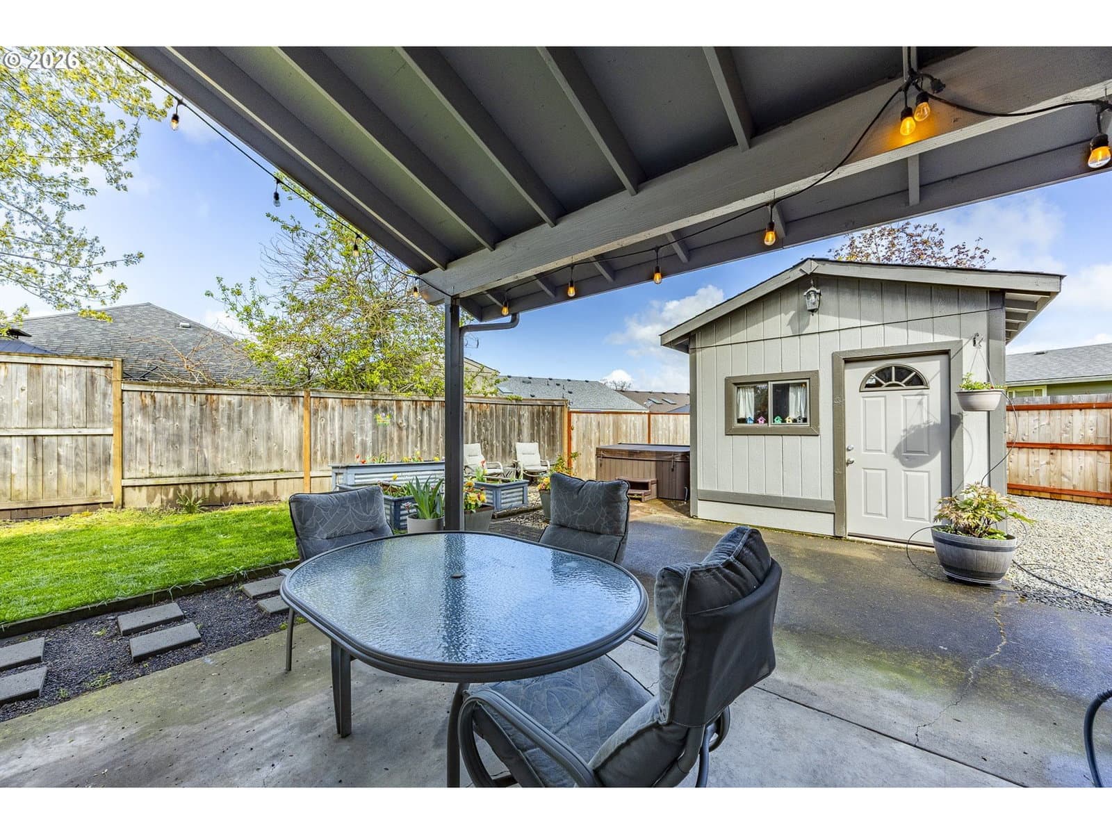 3days on marketThis lovely 1 level home lives much larger than the square footage. Vaulted ceilings in the main living area make for gracious enjoyment of the space. French doors lead to a covered patio area complete with a powered garden workshop, a hot tub & darling raised bed garden area. The oversized double car garage is insulated, heated & equipped with a big utility sink which makes it wonderful bonus flex space for work or play. There is plenty of auxiliary parking for your recreation vehicles, boat & trailer alongside the garage & additional fenced parking.
