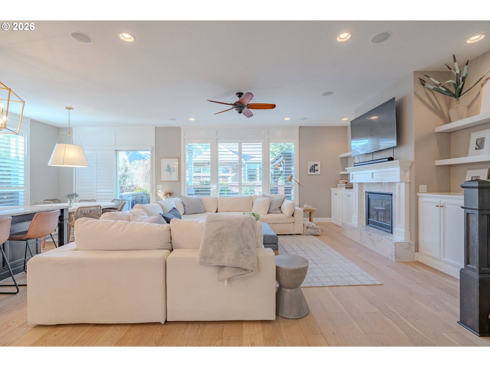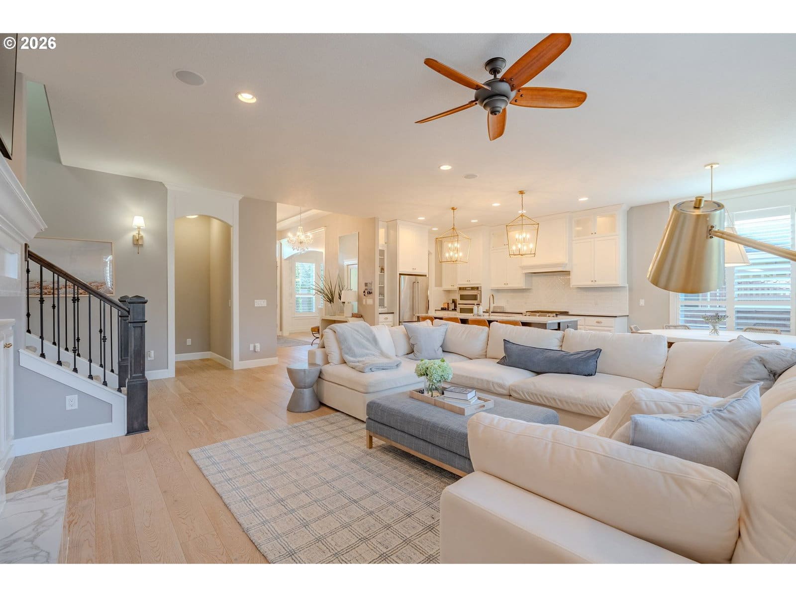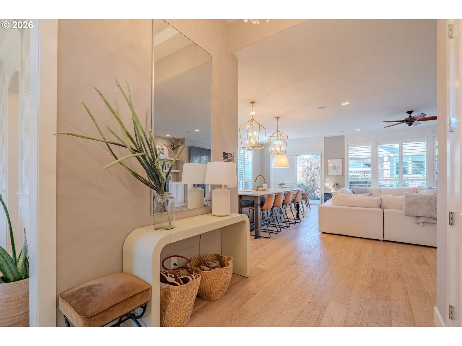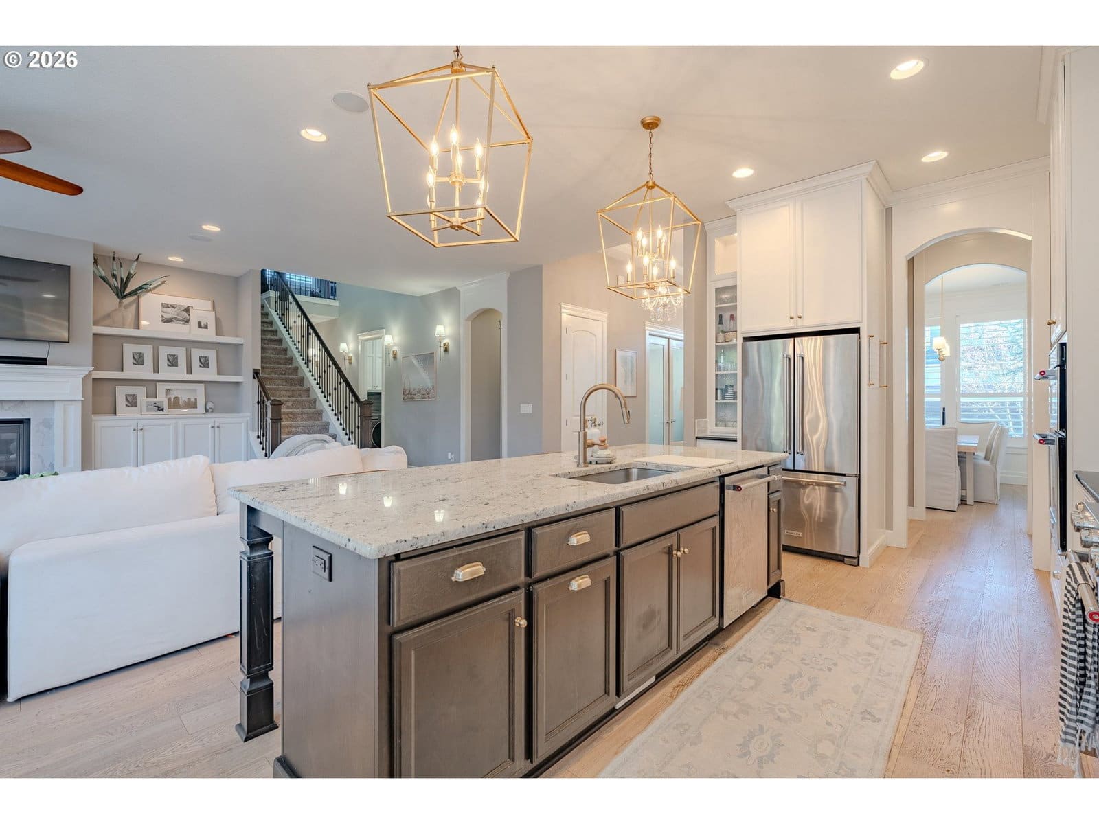 Located in the coveted Erickson Farms neighborhood, this exceptional custom home offers timeless design, quality craftsmanship, and elevated finishes throughout. From the moment you arrive, its inviting curb appeal and well-maintained grounds provide a welcoming introduction to the elegance found inside. Upon entering, the entry immediately impresses with soaring 12-foot ceilings, gorgeous wide-plank oak wood floors, and substantial millwork, establishing an immediate sense of scale and warmth. Open sight lines and abundant natural light draw you seamlessly into the main living areas, creating an open, inviting, sophisticated atmosphere. Custom finishes throughout include crown molding, extensive built-ins, custom cabinetry, plantation shutters, and designer lighting. The great room centers around a gourmet kitchen, featuring an oversized eat-island with slab granite surfaces, stainless appliances, a butler’s pantry with pass-through, and a breakfast nook, all opening to the family room with a gas fireplace accented by a beautiful marble surround and extensive built-ins. The main-level owner’s suite offers French doors, tray ceiling, walk-in closet, and lux ensuite with a clawfoot cast-iron soaking tub, dramatic marble walk-in shower framed by an arched full-height stone surround, polished stone floors, and dual vanities. A second main-level suite with full bath provides flexibility for guests or multi-generational living. Upstairs, enjoy a loft or bonus/family room, 2 spacious vaulted bedrooms, and full bathroom. Additional highlights include formal dining room, main-level office, and oversized laundry room. Outdoors, the large, covered tongue-and-groove patio with gas hookup invites effortless entertaining amid thoughtfully designed landscaping and impeccably maintained grounds. Located near Felida Park, schools, and local dining, this exceptional home offers elevated living in one of Felida’s most desirable neighborhoods.