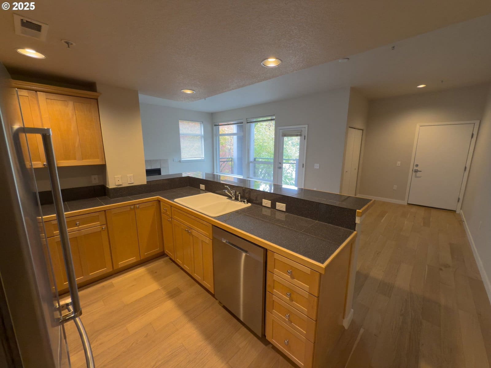 Amazing location in the heart of NW 23rd area walking district. One-level with condo entrance from attached garage. Great layout with high ceilings, two bedroom suites, gas fireplace, and balcony. Newer flooring, furnace, kitchen appliances, washer/dryer. Dedicated parking space included in attached garage. Nice neighborhood near many restaurants & shops. One block from Legacy Good Samaritan Medical Center.