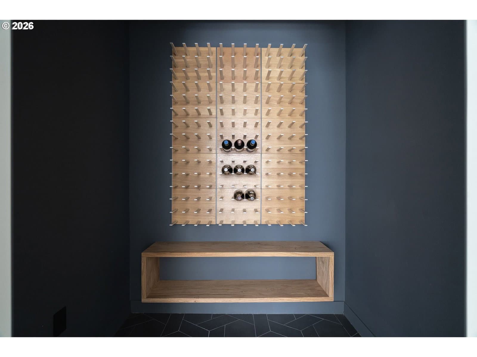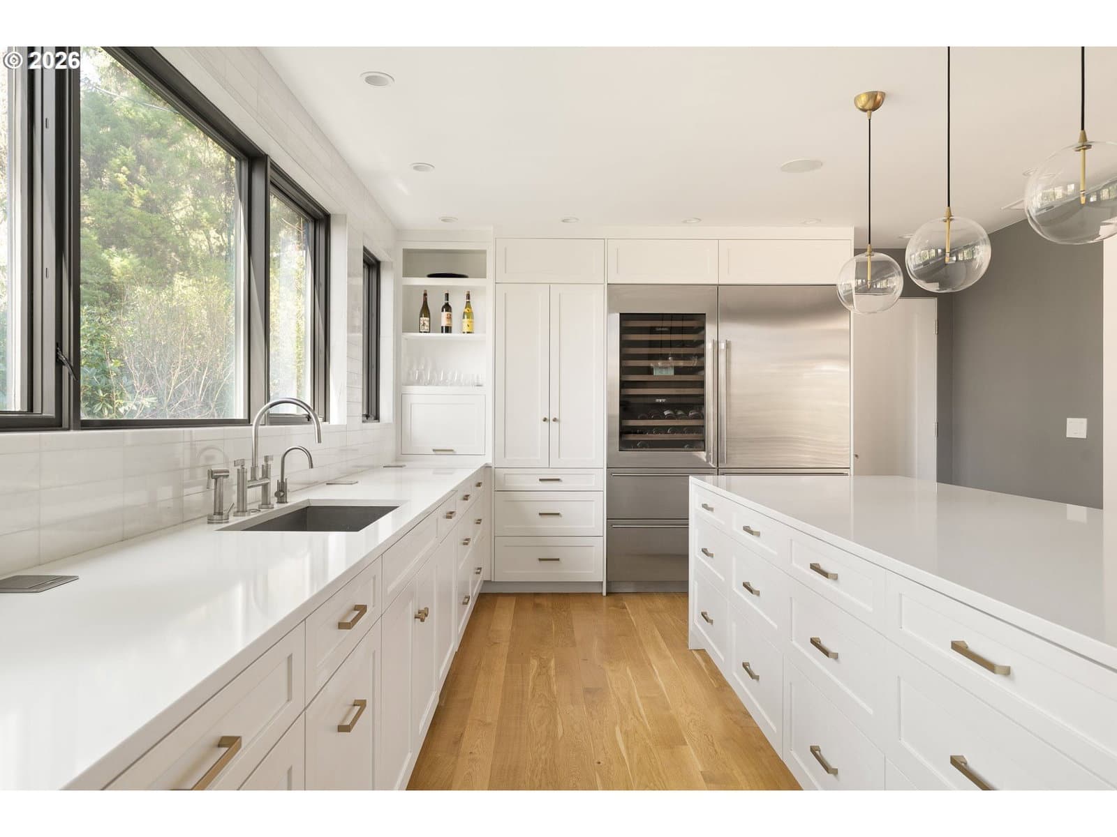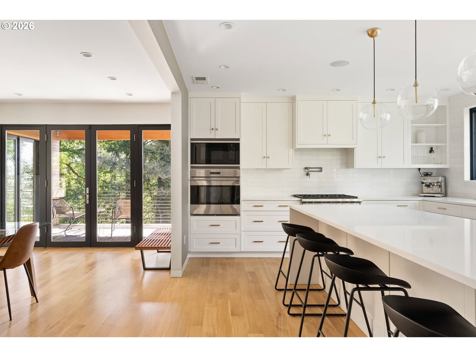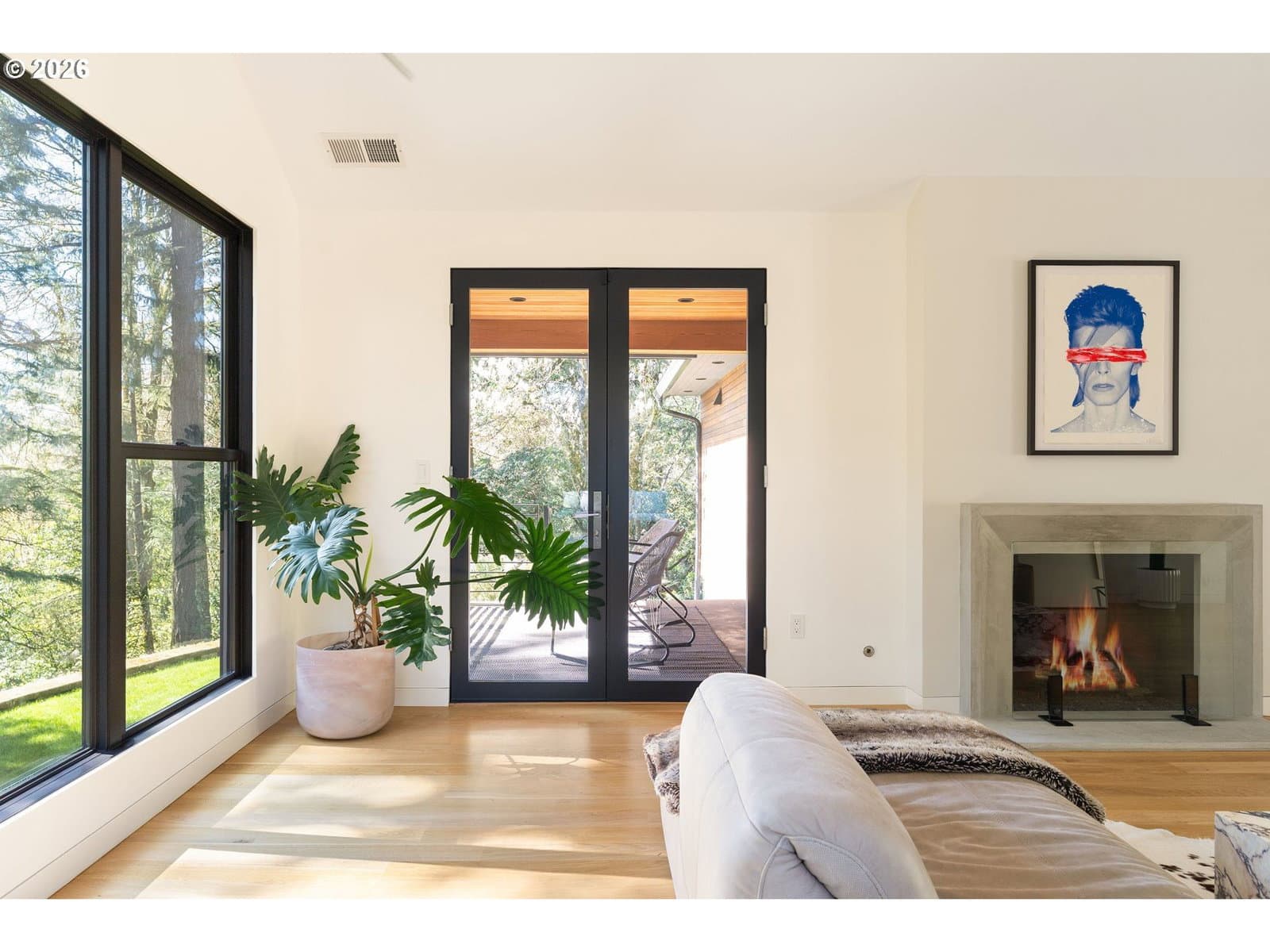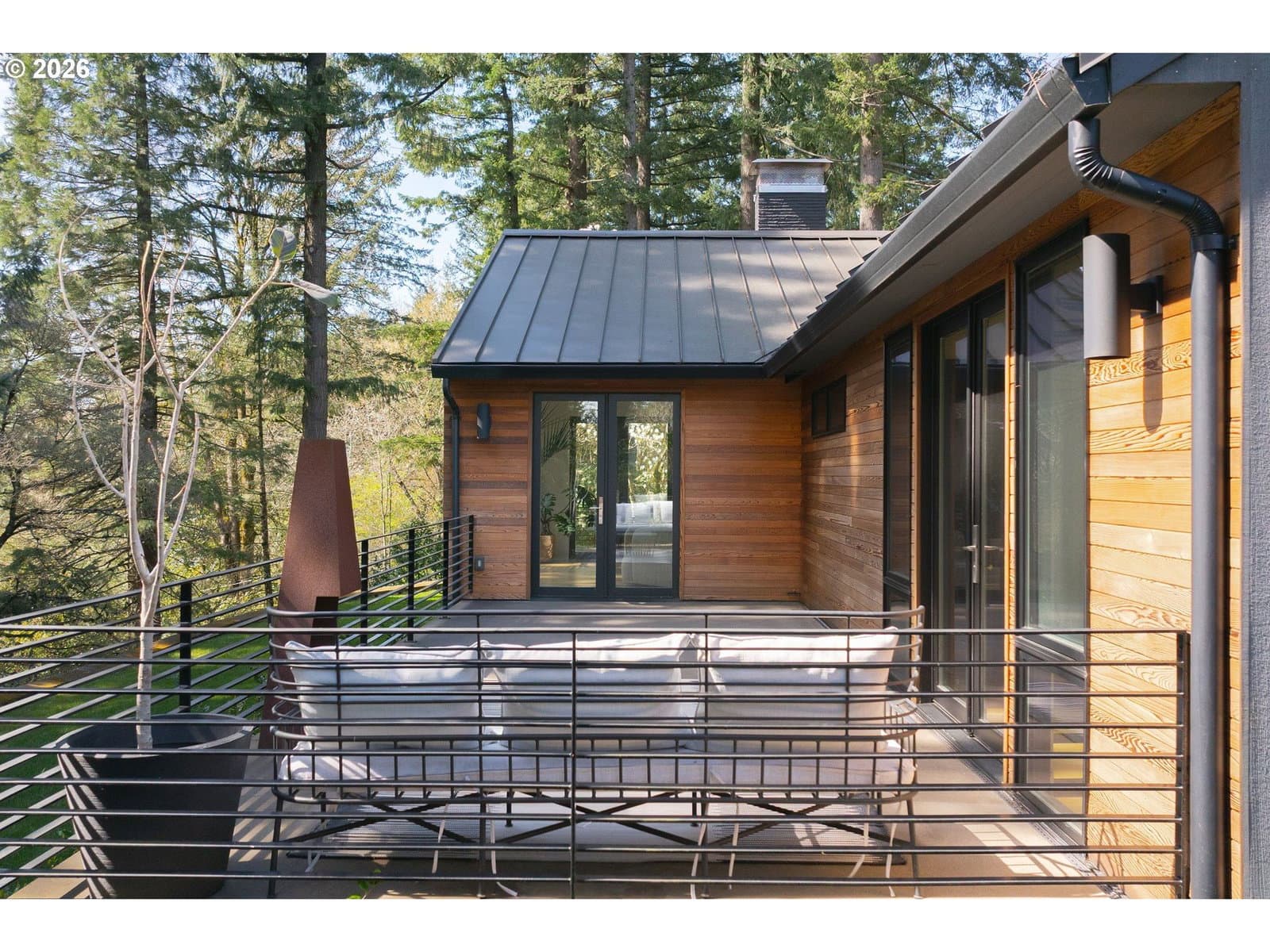 Originally designed in 1939 by noted Portland architect Roscoe Hemenway, this home has been reinvented by local designer Benjamin Silver who transformed it into a breathtaking modern interpretation of Hemenway's original vision. The living spaces are defined by a bright, light,airy ambiance beneath vaulted open beamed ceilings while natural wood flooring flows throughout. The living room with its centered picture window that bathes the space in natural light and connects the inhabitants with the forested lot beyond while two sets of French doors open to outdoor lounge areas.The adjacent dining room is open to the kitchen and features glass doors that connect to a covered patio. A bright and spacious chef's kitchen is filled with high-end touches and appliances including a Wolf gas range and Sub-Zero refrigerator. A central quartz wrapped island provides prep workspace and seating for casual meals.The main floor primary suite features vaulted ceilings and French doors leading out to an outdoor patio.The luxe ensuite bathroom has a custom vanity,heated tile flooring and the suite is complete with a large walk-in closet. A modern wood staircase leads to the lower level featuring a second living room with a gas fireplace and large windows. This level also includes two bedrooms with a full bathroom,laundry room,office/flex space&custom wine storage.Throughout the home,high-end details combine with detailed craftsmanship,designer lighting,tankless toilets&wood flooring. Beautiful natural wood built-in cabinetry provides ample storage, and the main level powder room features marble tile and a custom concrete counter.The exterior is wrapped in beautiful cedar and a durable metal roof.Custom hardscaping blends seamlessly into the natural contours of the property in a forested setting with open yard space, providing a private oasis. This property is a rare find in its celebrated architectural history while offering modern Dwell-worthy, elevated living. [Home Energy Score = 9. HES Report at https://rpt.greenbuildingregistry.com/hes/OR10098292]