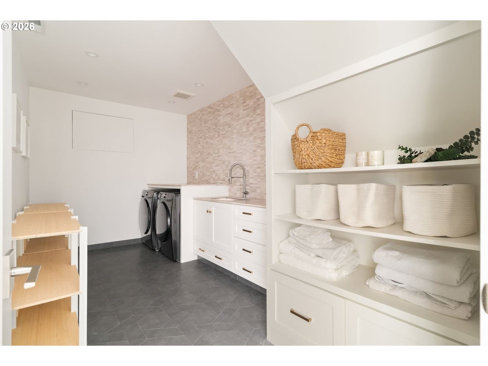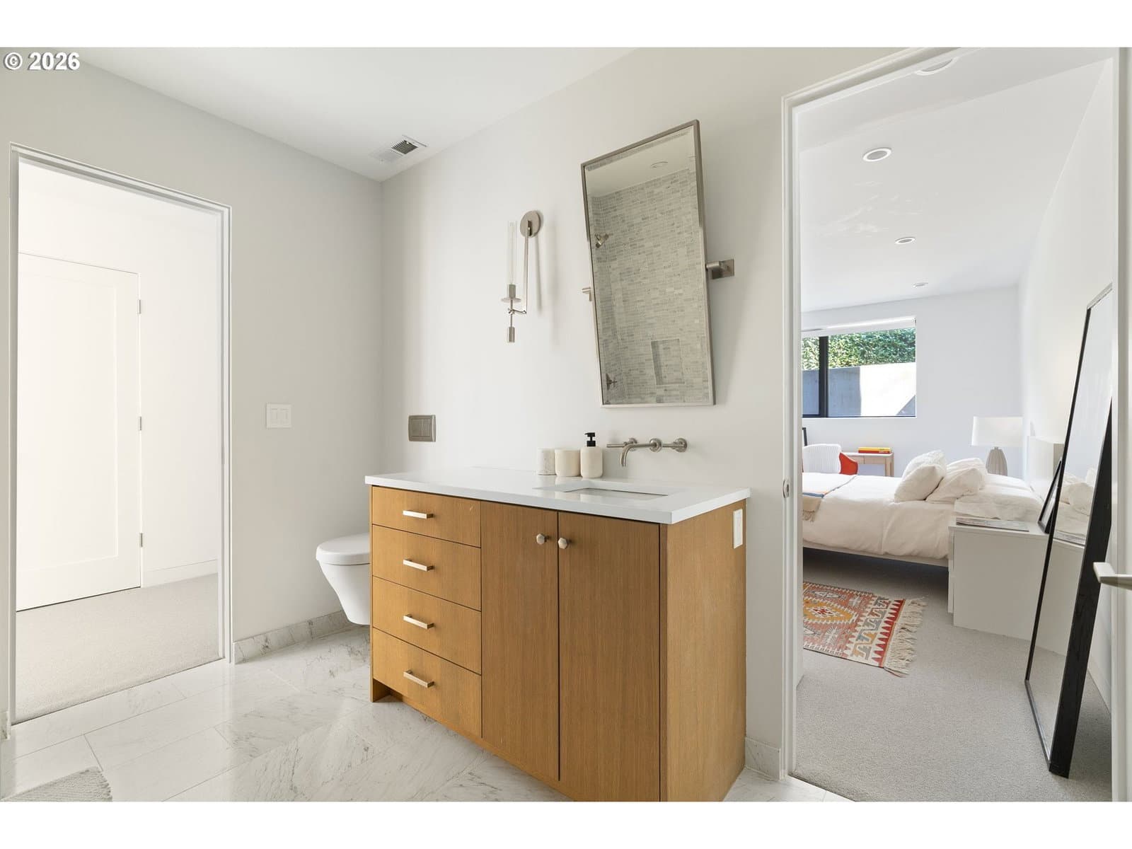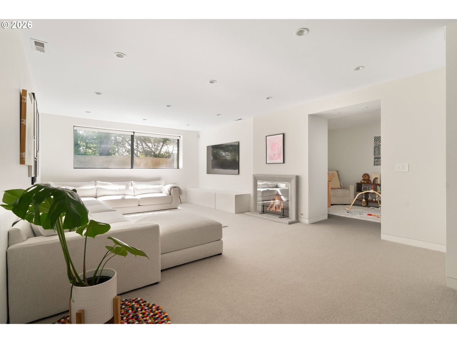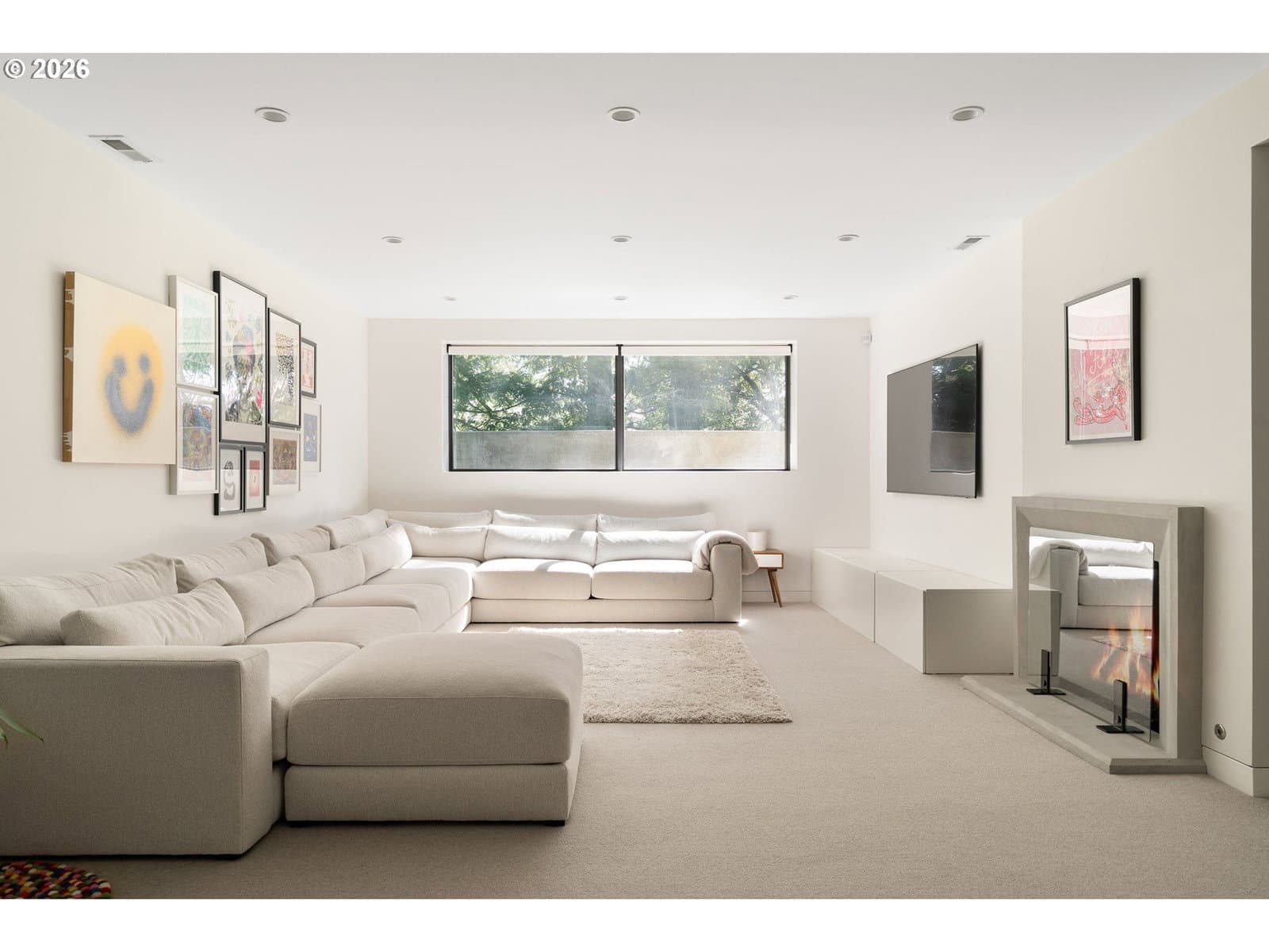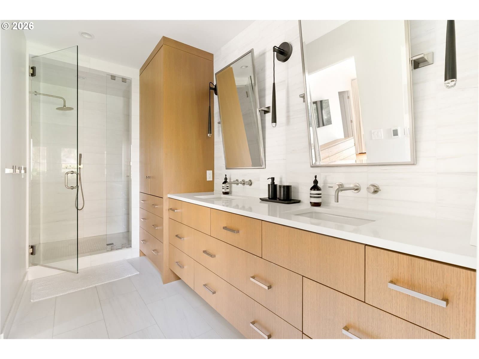 Originally designed in 1939 by noted Portland architect Roscoe Hemenway, this home has been reinvented by local designer Benjamin Silver who transformed it into a breathtaking modern interpretation of Hemenway's original vision. The living spaces are defined by a bright, light,airy ambiance beneath vaulted open beamed ceilings while natural wood flooring flows throughout. The living room with its centered picture window that bathes the space in natural light and connects the inhabitants with the forested lot beyond while two sets of French doors open to outdoor lounge areas.The adjacent dining room is open to the kitchen and features glass doors that connect to a covered patio. A bright and spacious chef's kitchen is filled with high-end touches and appliances including a Wolf gas range and Sub-Zero refrigerator. A central quartz wrapped island provides prep workspace and seating for casual meals.The main floor primary suite features vaulted ceilings and French doors leading out to an outdoor patio.The luxe ensuite bathroom has a custom vanity,heated tile flooring and the suite is complete with a large walk-in closet. A modern wood staircase leads to the lower level featuring a second living room with a gas fireplace and large windows. This level also includes two bedrooms with a full bathroom,laundry room,office/flex space&custom wine storage.Throughout the home,high-end details combine with detailed craftsmanship,designer lighting,tankless toilets&wood flooring. Beautiful natural wood built-in cabinetry provides ample storage, and the main level powder room features marble tile and a custom concrete counter.The exterior is wrapped in beautiful cedar and a durable metal roof.Custom hardscaping blends seamlessly into the natural contours of the property in a forested setting with open yard space, providing a private oasis. This property is a rare find in its celebrated architectural history while offering modern Dwell-worthy, elevated living. [Home Energy Score = 9. HES Report at https://rpt.greenbuildingregistry.com/hes/OR10098292]