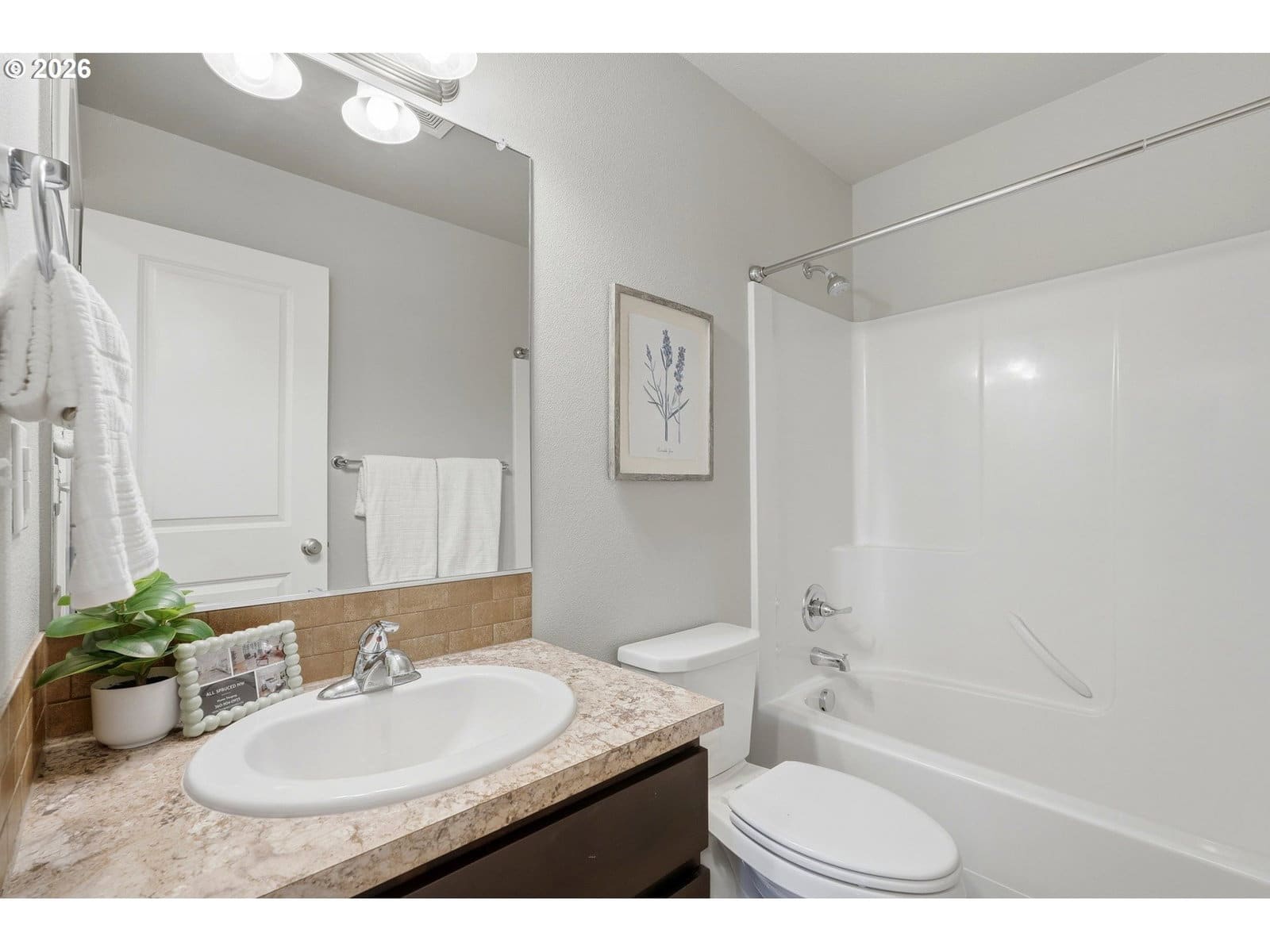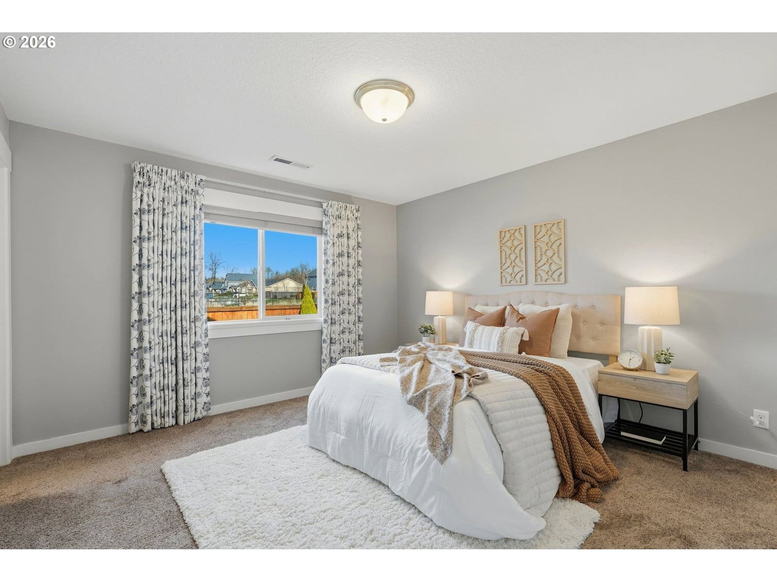 Skillfully crafted modern two-bedroom home with a spacious office and two baths sets a higher standard with its thoughtful design and elevated finishes throughout. A dramatic vaulted ceiling crowns the open-concept living room, creating an airy, light-filled environment that feels both expansive and warmly inviting. At the heart of the home, the kitchen is designed to impress and perform. Featuring a gas range, sleek stainless-steel appliances, a pantry, abundant counter and cabinet space, it seamlessly supports both everyday living and effortless entertaining. The primary suite offers a generous walk-in closet and a well-appointed bath with tile flooring. A dedicated laundry room adds convenience with tile floors, shelving, and a washer and dryer included. Stylish laminate flooring flows throughout the main living areas, delivering a refined aesthetic paired with easy maintenance. Plush carpeting in the bedrooms and office enhances comfort. Forced air heating and efficient air conditioning provide dependable year-round comfort in every season. Step outside to a covered back patio and fully fenced yard with gated access, a private and practical extension of the living space, perfect for relaxing or entertaining. Ideally positioned on a quiet dead-end street, this low-maintenance property is exceptional. Enjoy being within half a mile of the Battle Ground Farmers Market, Fairgrounds Park, Al & Ernie's Bakery & Cafe, and the Battle Ground Community Center — placing local favorites and community amenities just moments from your doorstep. Whether you are purchasing your first home or seeking to downsize without compromising style or convenience, this property delivers modern comfort, quality craftsmanship, standout features, an unbeatable location — and the added benefit of no HOA.