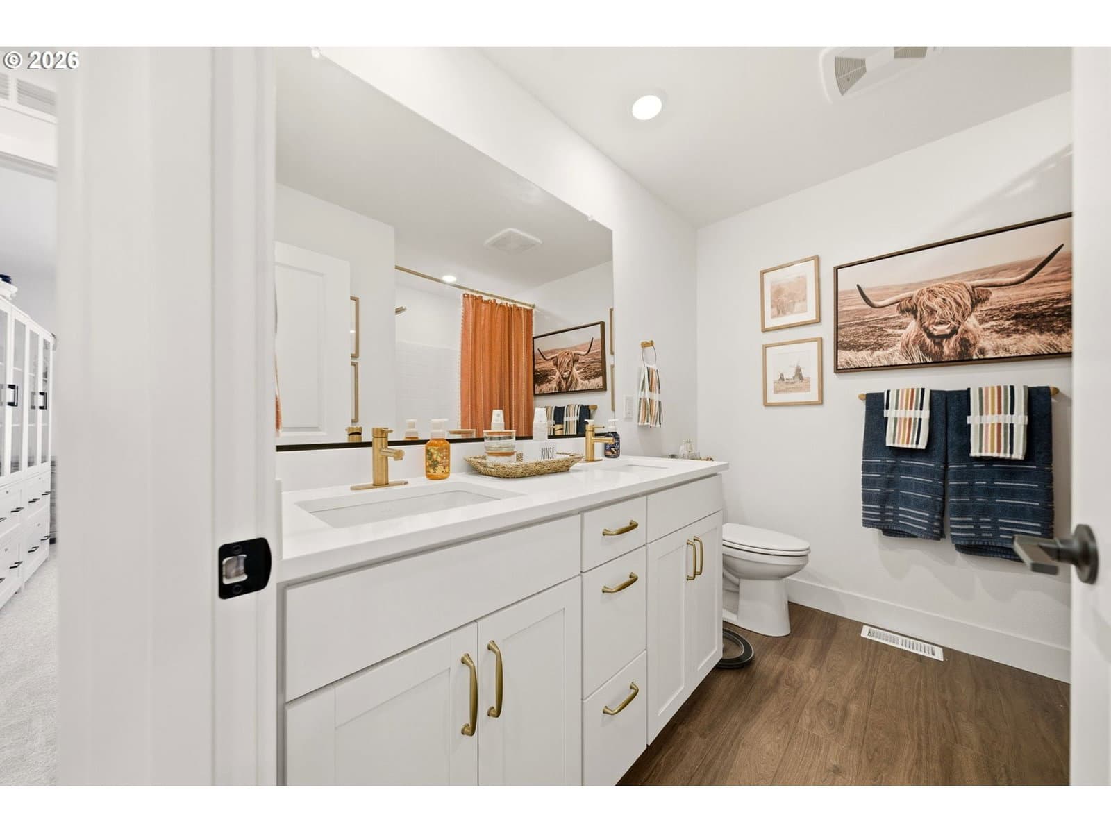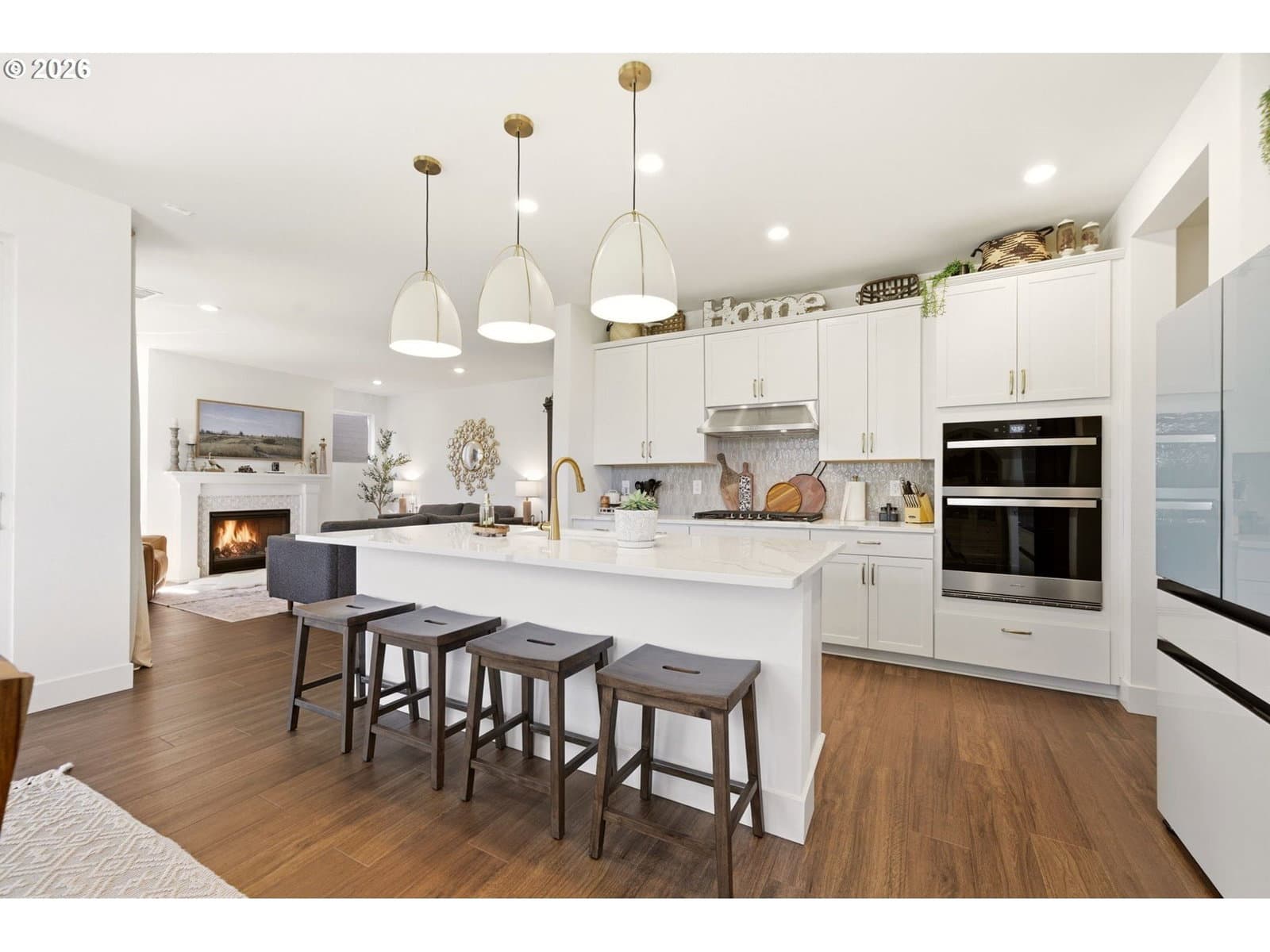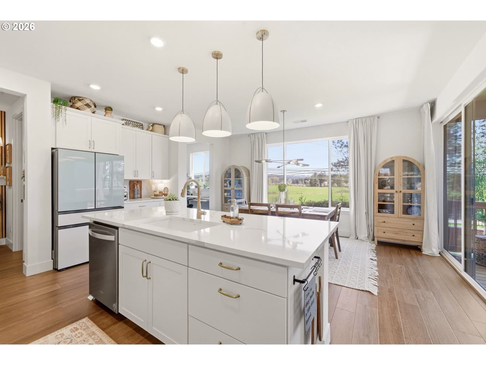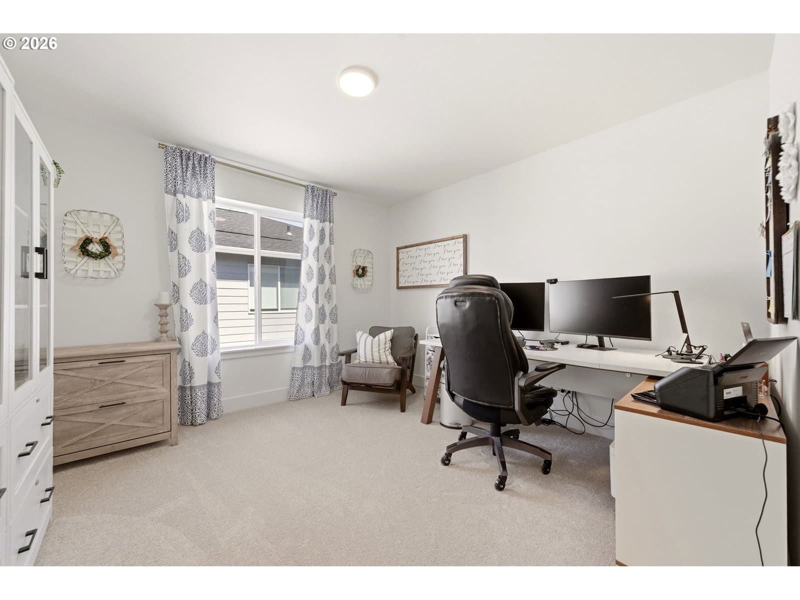 This upgraded Quincy floorplan, built by Pulte Homes, offers a fantastic design with 5 bedrooms, an office nook and bonus/media room, as well as 3 full baths and approx. 2,842 square feet of living space. A spacious entry opens to a Greatroom concept living area that is perfect for entertaining while being connected to the dining area and kitchen. The kitchen has beautiful quartz countertops, stainless steel appliances, a large island, and an expanded walk-in pantry for added storage; the main level includes a full bedroom and full bath with a tiled shower, providing flexible living options for guests or multi-generational needs, while upstairs you’ll find a private owner’s suite with soaking tub, walk-in closet, and custom tile work, along with three additional bedrooms—each with walk-in closets—a versatile media/game room, and a convenient laundry room; interior finishes include luxury vinyl plank flooring, 5" baseboards, soft-close dovetailed construction cabinets and drawers, high 9'ceilings on the main, and designer details throughout, plus power blinds and curtains included; exterior features include a covered deck, fenced yard, fully landscaped yard with front and back outdoor sprinkler systems, with a 2-car attached garage enhanced by a durable epoxy floor; built in 2025 with modern systems such as central air, high-efficiency forced air heating, and tankless hot water, this home also includes a transferable builder warranty and is located in the desirable Frog Pond Crossing community.
