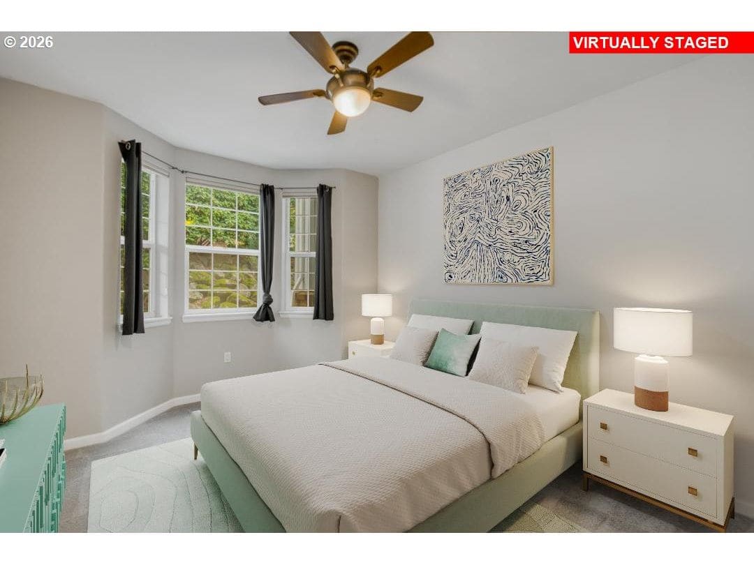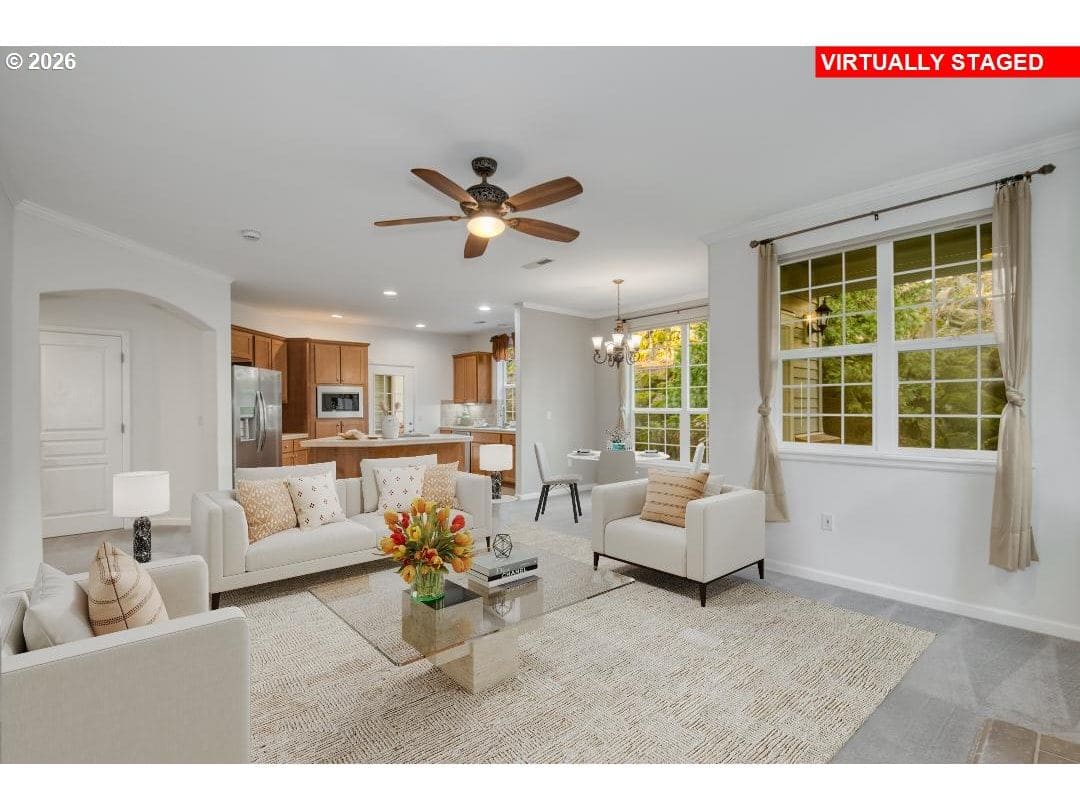 OPEN HOUSE 1/25 12-1:30 Private Corner Residence | True One-Level Living. Tucked away in the desirable Madison Heights community, this rare single-level corner residence offers 1,290 square feet of refined, effortless living in a serene and private setting. Set back from the main road with its own private entrance, the home delivers true one-level living with no stairs inside or out—an exceptional opportunity for accessibility & long-term ease. Inside, the spacious living area is anchored by a gas fireplace with tile surround and mantel, creating a warm focal point for everyday living & entertaining. Fresh interior paint and plush new carpeting enhance the home’s bright, move-in-ready atmosphere. Two private patios extend the living space outdoors—one opening from the living room, ideal for hosting or unwinding, and the second accessible from both the primary suite and kitchen, perfect for morning coffee, container gardening, or a peaceful outdoor retreat. The kitchen is thoughtfully designed with stainless steel appliances, a new refrigerator, center island with integrated cooktop, tile countertops and flooring, and abundant custom cabinetry offering both beauty and function.The primary suite provides a tranquil escape with a generous walk-in closet and a well-appointed en-suite bath featuring dual sinks and a private, step-free shower and toilet area. A second bedroom and full guest bath offer flexibility for visitors, hobbies, or a home office. Additional amenities include a dedicated laundry room with built-in cabinetry and included washer and dryer, as well as ample storage throughout. Residents enjoy impeccably maintained grounds with winding walking paths, two picturesque koi ponds, thoughtfully placed benches designed for moments of relaxation. Located just minutes from restaurants, shopping in the historic Willamette Falls Drive. Offering privacy, accessibility, and comfort, this home is perfectly suited for those seeking lifestyle without compromise.