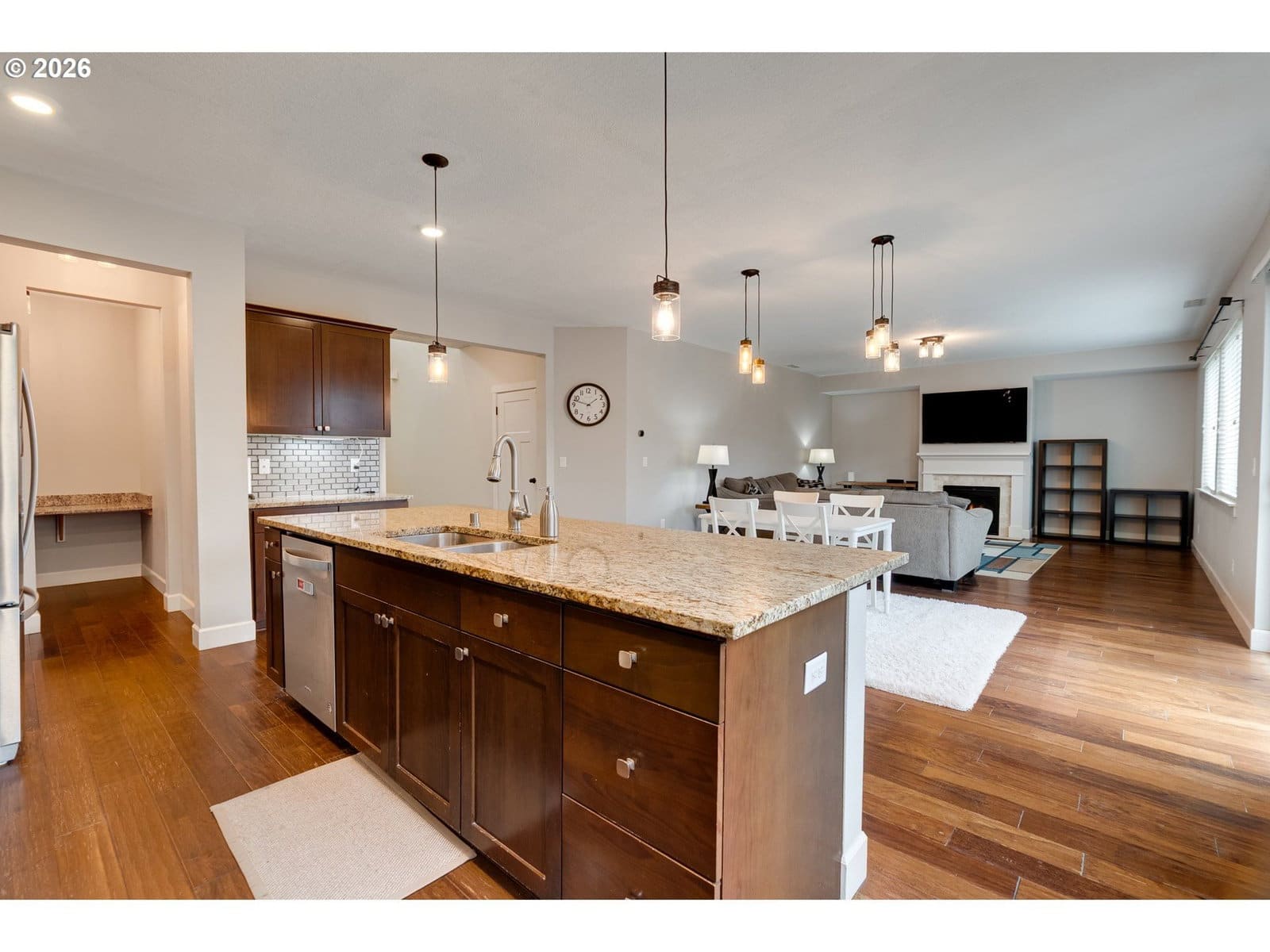 Beautifully maintained Craftsman-style home featuring open-concept living and thoughtful design throughout. The main level showcases stunning slab granite countertops in both the kitchen and dedicated office/workspace areas, complemented by stylish stainless-steel appliances, gas cooktop, double sink, and expansive island ideal for gathering, entertaining, and everyday living. The spacious living room is anchored by a cozy travertine-lined gas fireplace, creating a warm and inviting focal point while maintaining clean modern lines. Large windows and sliding doors bring in natural light and connect seamlessly to the fully fenced backyard. Perfect for relaxing, grilling, or entertaining. Upstairs, the versatile loft area offers incredible flexibility and has been virtually staged as a recreation and entertainment space, ideal for pool table, media lounge, playroom, or additional family gathering area. The generous primary suite includes a walk-in-closet and well-appointed bath, while additional bedrooms and/or bonus space provide flexibility for guests, hobbies, or work-from-home living. Located in a quiet, well maintained, and peaceful neighborhood within the desirable Greater Brush Prairie area, this home offers convenient access to local amenities while maintaining a serene residential feel. Nearby attractions include Alderbrook Park with trails and recreation, neighborhood parks, and easy access to Vancouver's shopping, dining. This move-in-ready home combines comfort, versatility, and lifestyle in a sought-after location.