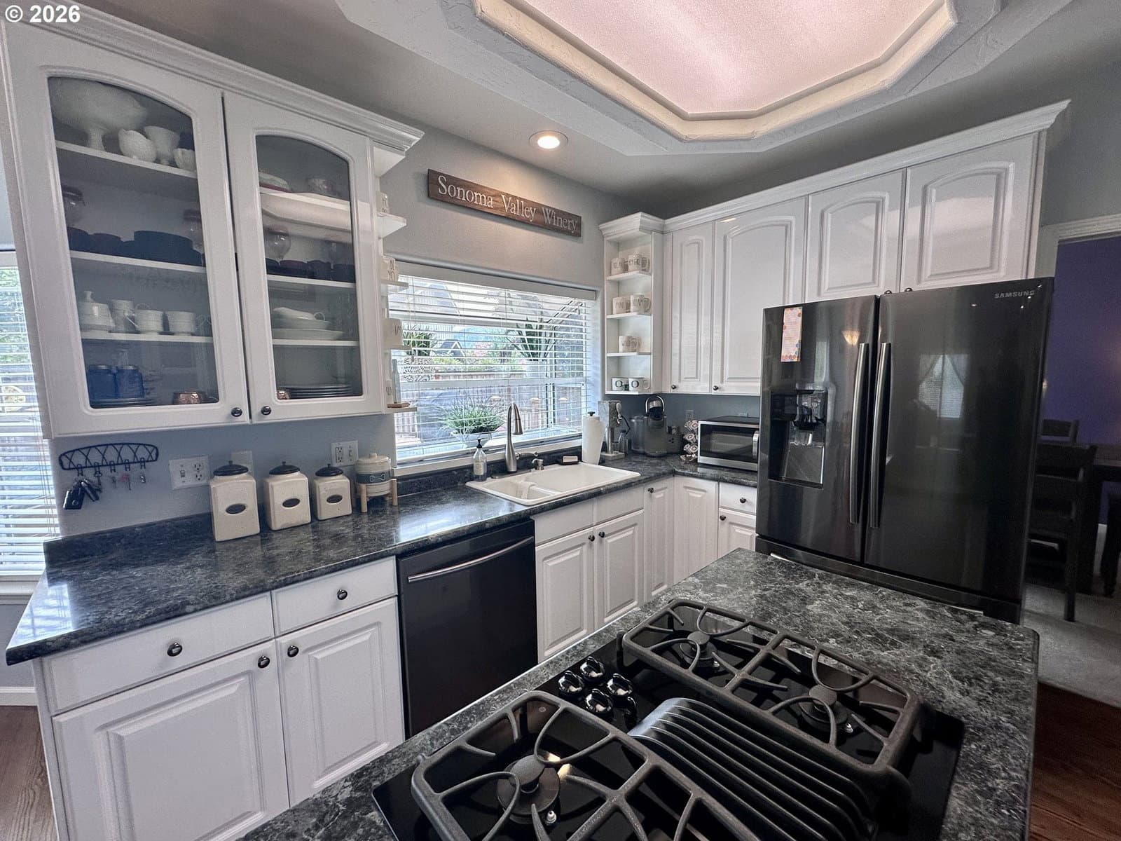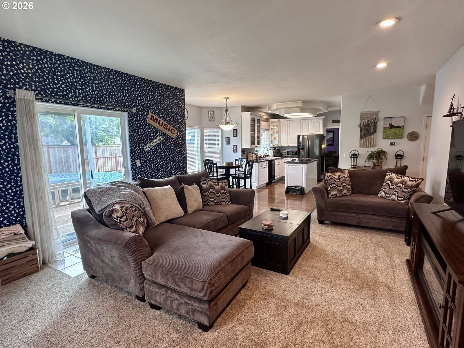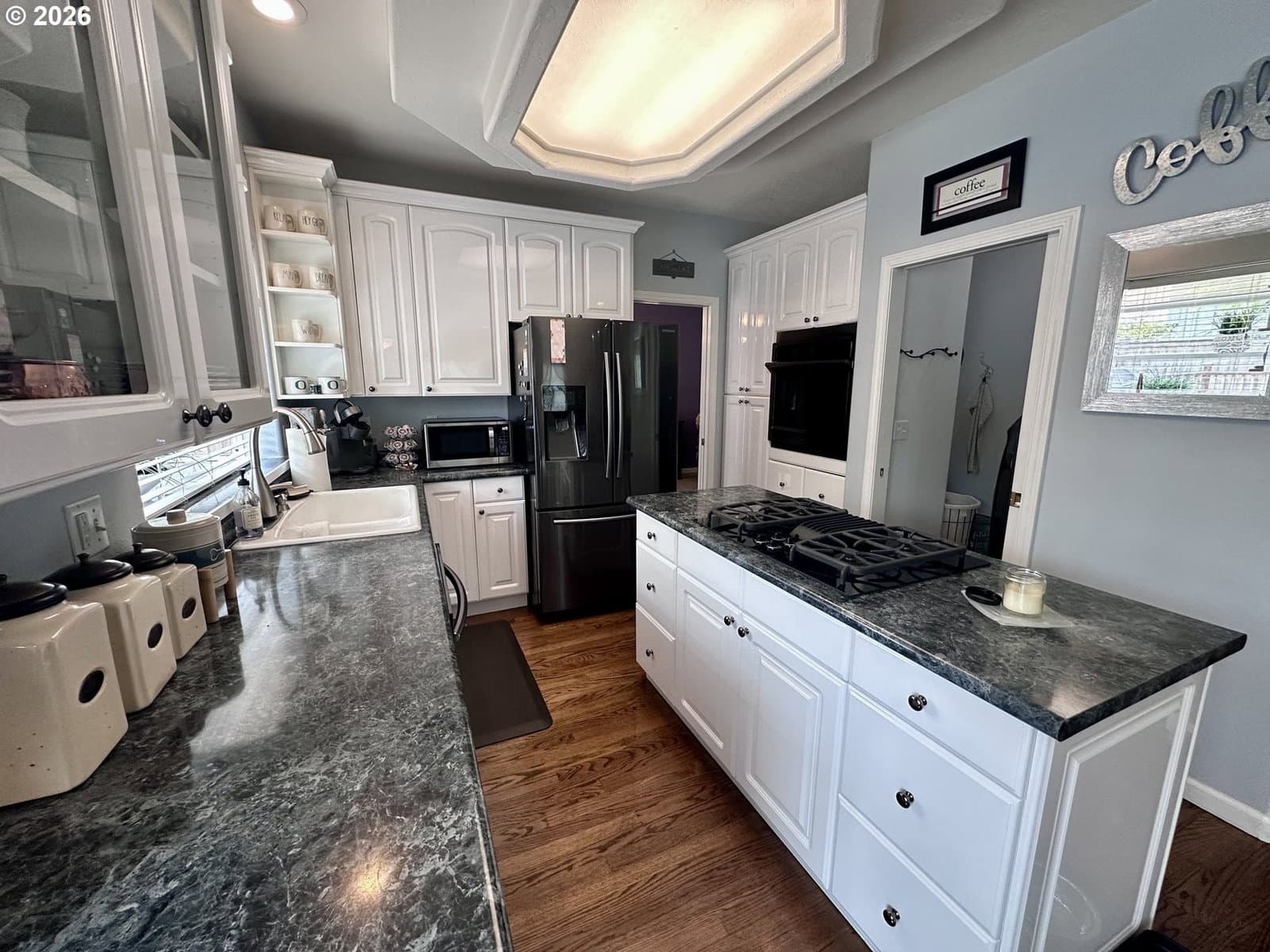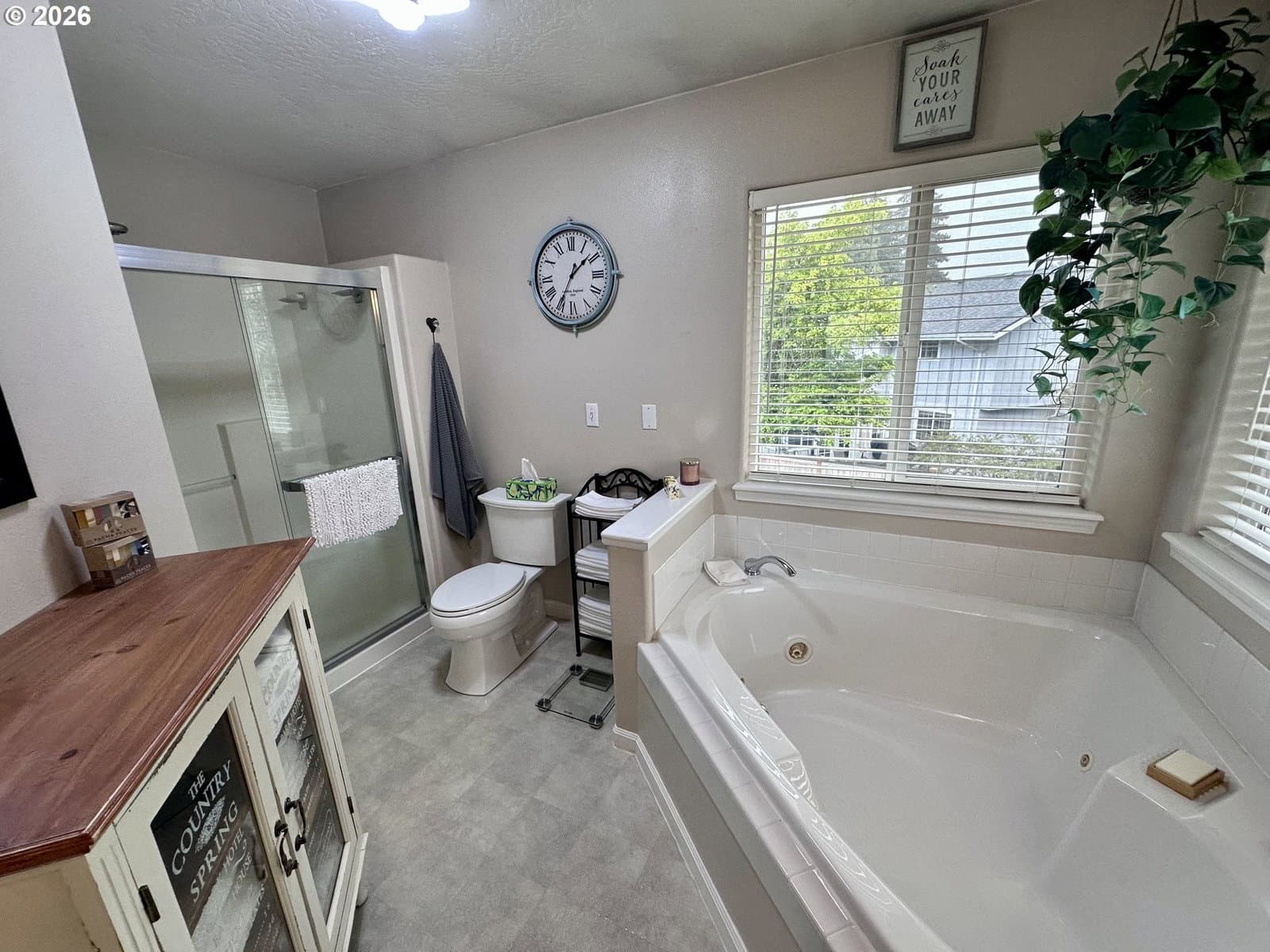 Beautifully maintained 4-bedroom, 2.5-bath custom home in the heart of Thurston. This spacious two-story residence offers over 2,200 sq ft of living space along with meaningful updates, including a new roof (2022), gas furnace and A/C (2022), and water heater (2023). The upstairs bathroom was tastefully remodeled in 2023, and all toilets have been updated. The main level features rich hardwood floors that create a warm, inviting atmosphere ideal for both everyday living and entertaining. Two gas fireplaces add comfort and character, one in the living room and another in the primary suite. A dedicated main-floor laundry room adds convenience. The kitchen is well-equipped with a gas cooktop island, built-in oven, garden window, and ample storage, offering both functionality and charm. Upstairs, the spacious primary suite serves as a true retreat with a double vanity, jetted soaking tub, separate shower, and its own fireplace. The layout offers a great balance of formal and casual living spaces, providing flexibility for a variety of lifestyles. Step outside to enjoy beautifully manicured front and back yards, a large private deck, and a gas-heated above-ground pool. Additional outdoor features include 2 storage sheds, fire pit area, and a dog kennel with direct access through a family room dog door. Situated on an oversized lot, the property also includes RV parking and an attached two-car garage with keypad entry. All of this in a quiet, desirable neighborhood.