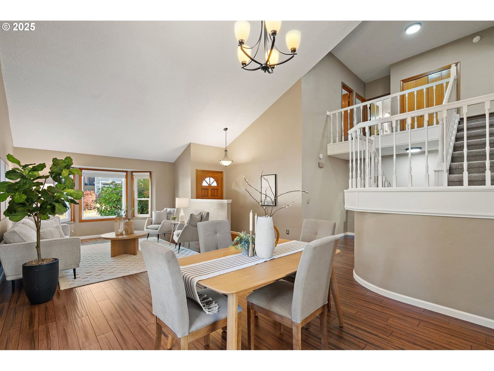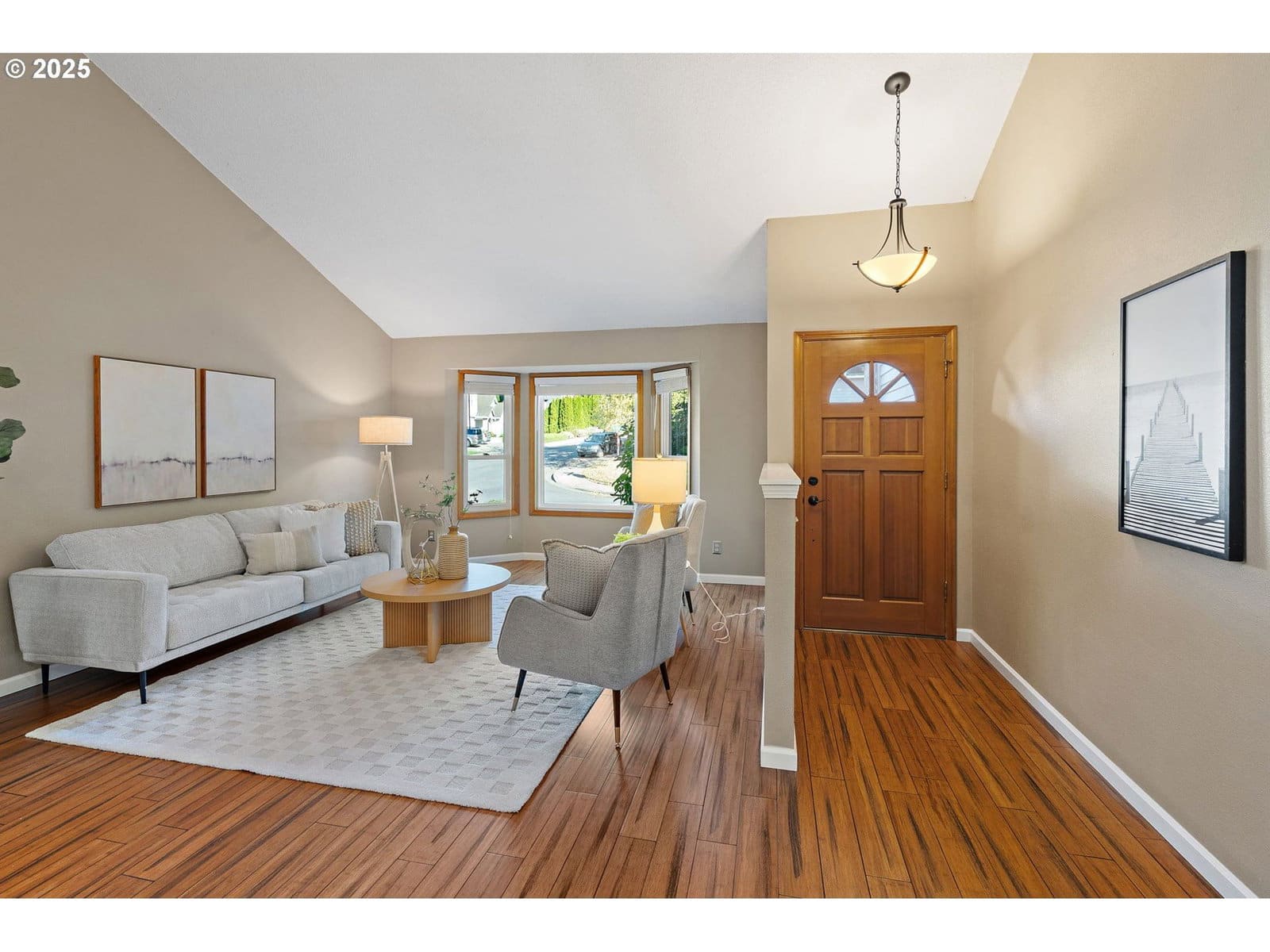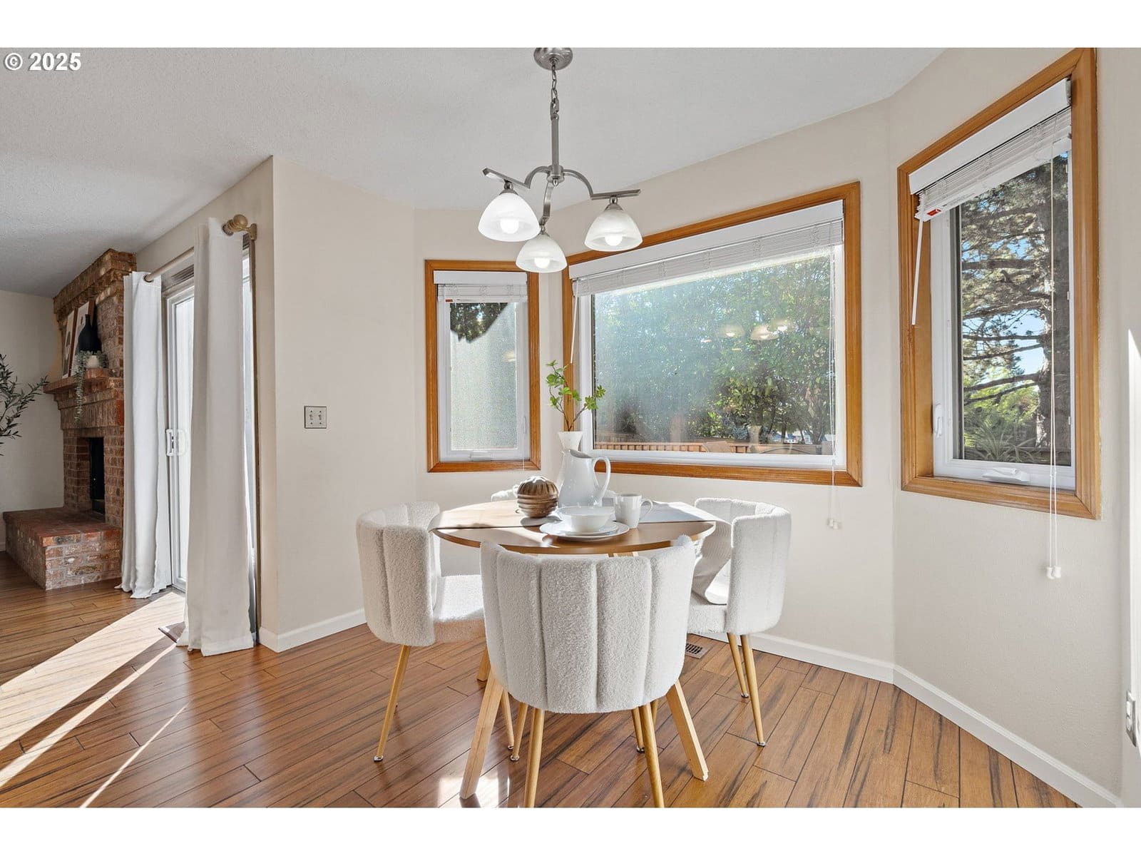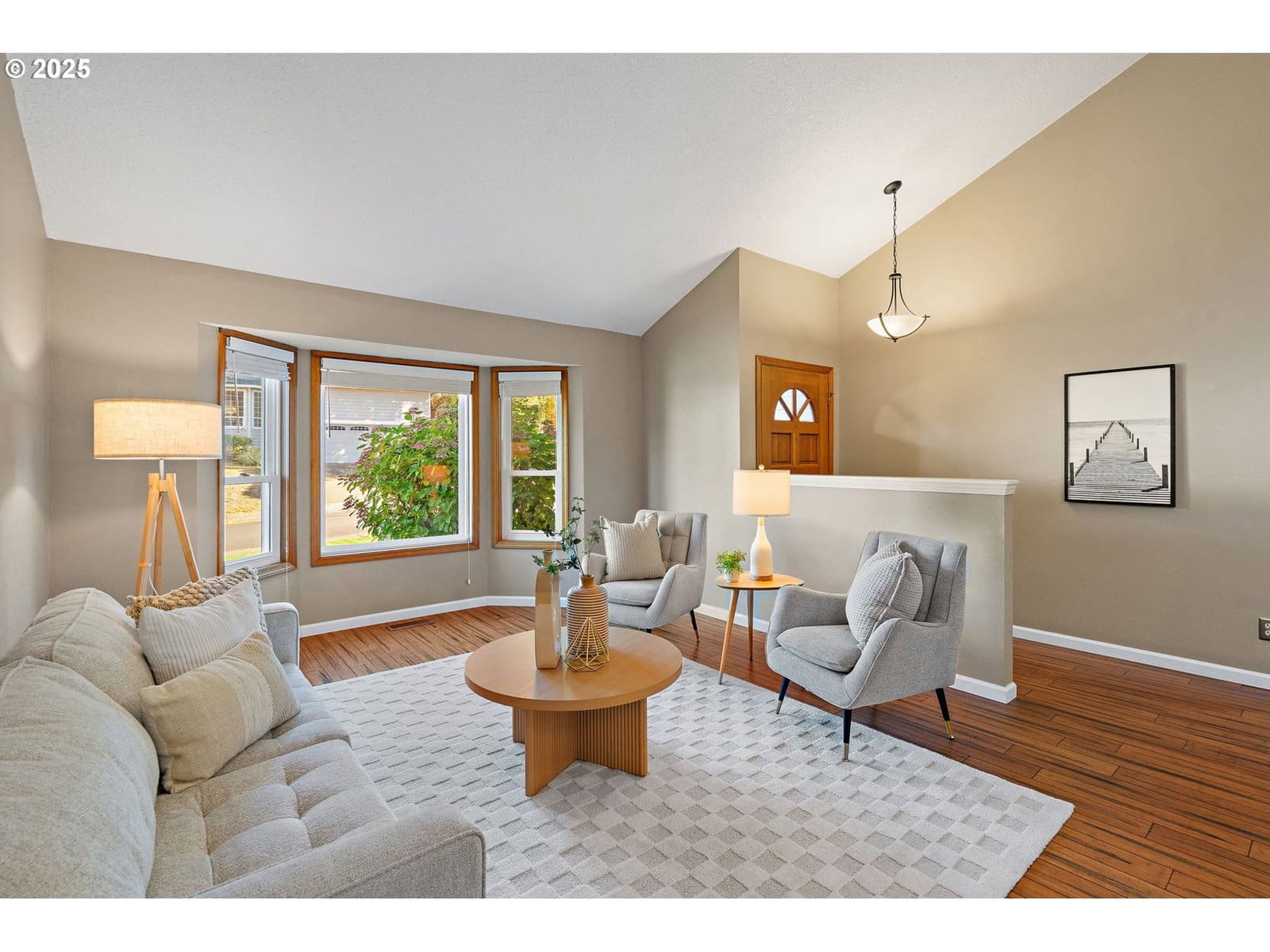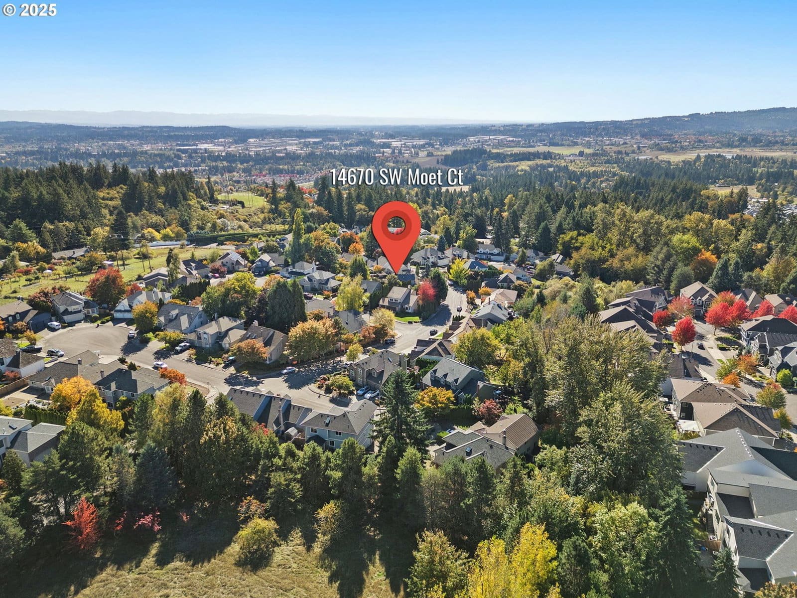 Welcome to Bull Mountain known for high end homes, and where nature is a priority. This home sits on a level corner lot and has a warm, inviting feel from the moment you walk in. Inside, you’ll find four bedrooms and three full baths, including a bedroom and full bath on the main level. Vaulted ceilings and abundant windows in the living and dining rooms give a grand airy feeling, while engineered bamboo floors extend throughout the main level and upstairs.The kitchen features an eating nook with a bay window, a built-in desk area, and pantry—all open to the family room with its cozy wood-burning fireplace with brick surround, hearth & mantle and slider leading out to the back deck.Upstairs, the primary suite has a double-door entry, corner windows, and an arched doorway to a private bath with jetted tub, dual sinks, and a walk-in closet. You’ll find two additional bedrooms upstairs, both with window seats and closet organizers.Recent updates include new double-sliding windows, furnace and AC, updated lighting, blinds, flooring, and fresh exterior paint. The home also has a tile roof and the always sought-after three-car garage.Out back, enjoy a private fenced yard with mature landscaping and both a side patio and a back deck for relaxing or entertaining.Don’t miss this wonderful home, just minutes from parks, shopping, dining, and recreation.