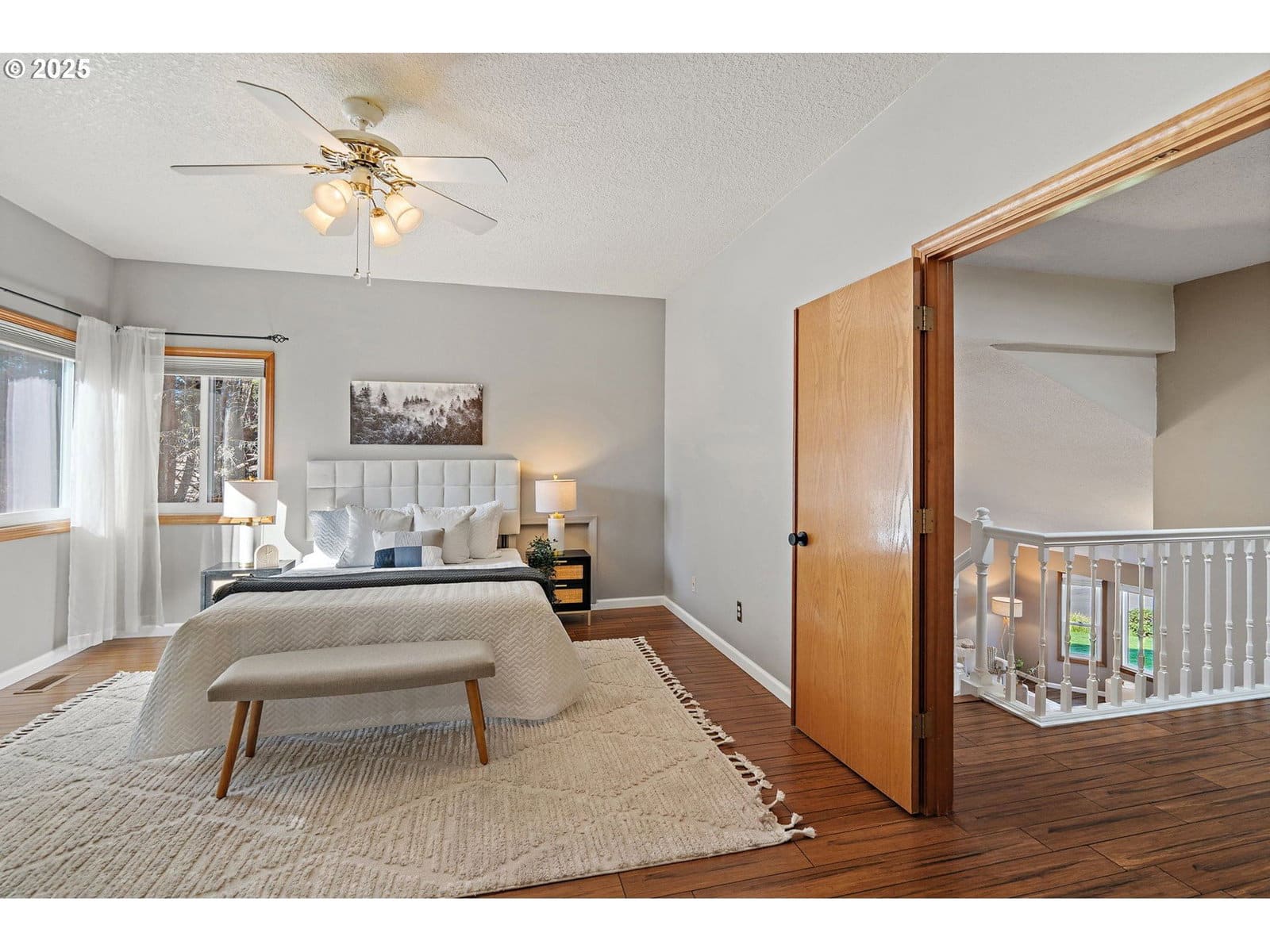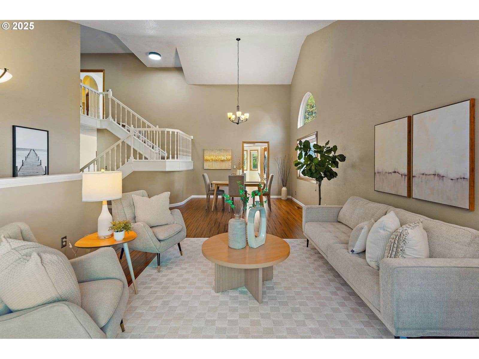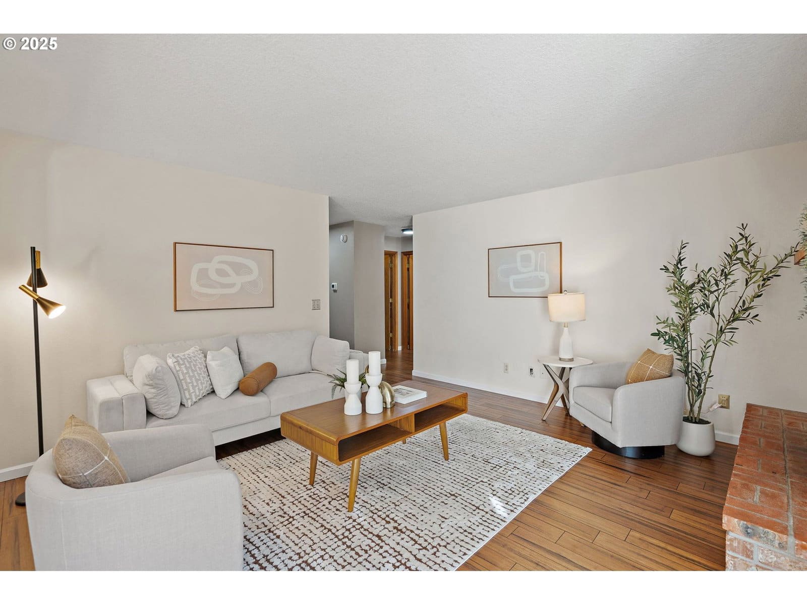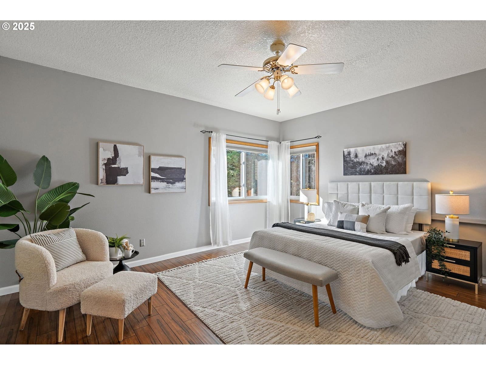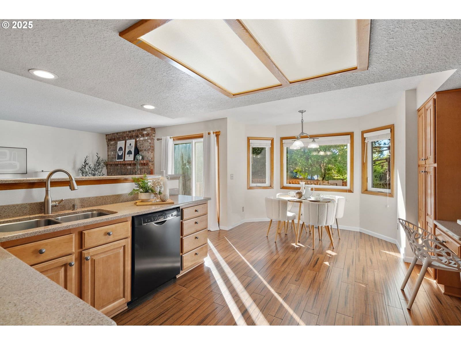 Welcome to Bull Mountain known for high end homes, and where nature is a priority. This home sits on a level corner lot and has a warm, inviting feel from the moment you walk in. Inside, you’ll find four bedrooms and three full baths, including a bedroom and full bath on the main level. Vaulted ceilings and abundant windows in the living and dining rooms give a grand airy feeling, while engineered bamboo floors extend throughout the main level and upstairs.The kitchen features an eating nook with a bay window, a built-in desk area, and pantry—all open to the family room with its cozy wood-burning fireplace with brick surround, hearth & mantle and slider leading out to the back deck.Upstairs, the primary suite has a double-door entry, corner windows, and an arched doorway to a private bath with jetted tub, dual sinks, and a walk-in closet. You’ll find two additional bedrooms upstairs, both with window seats and closet organizers.Recent updates include new double-sliding windows, furnace and AC, updated lighting, blinds, flooring, and fresh exterior paint. The home also has a tile roof and the always sought-after three-car garage.Out back, enjoy a private fenced yard with mature landscaping and both a side patio and a back deck for relaxing or entertaining.Don’t miss this wonderful home, just minutes from parks, shopping, dining, and recreation.