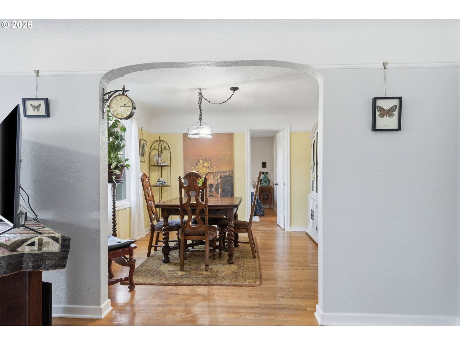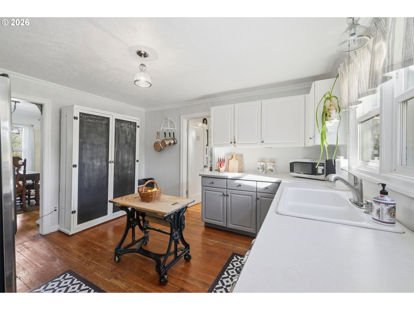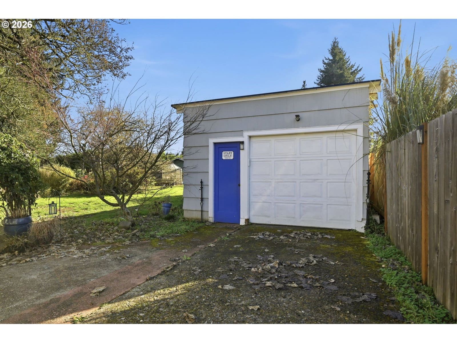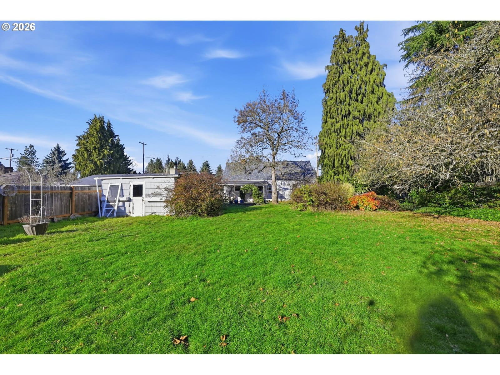 Set on an oversized 0.33-acre in-town lot, this 1948 Cape Cod offers timeless character, space to breathe, and a truly special setting. The sellers have thoughtfully preserved the home’s vintage appeal, featuring original hardwood floors throughout the main level and two main-floor bedrooms, all in excellent condition. The upper level has been converted into a spacious bedroom with a walk-in closet—perfect as a primary suite, third bedroom, or bonus room. Classic details include coved ceilings and walls, arched doorways, and a charming country kitchen with abundant cabinetry and storage and a free standing gas range to cook on. A separate, generously sized dining room adds to the home’s comfortable flow. Recent interior and exterior paint has brightened the home beautifully, while double-pane vinyl windows (installed prior to current sellers) provide improved efficiency. A newer roof was installed approximately two years ago, at which time the attached carport structure was also repaired. Original cedar shake and shingle siding adds to the authentic character. A detached garage and long driveway provide ample parking. The park-like backyard is a standout feature—lush, private, and alive with nature. Mature plantings include a Japanese maple, fig trees, hazelnut trees, kiwi, crab-apple and more, creating a peaceful haven that attracts a wide variety of birds, from blue jays to robins. A large garden area and greenhouse (included) make this an ideal property for gardeners and nature lovers alike. Additional features include a utility room with laundry, half bath, and utility sink. Conveniently located near shopping and bus lines, with the added bonus of low taxes, this home offers vintage charm, modern livability, and an exceptional size lot.