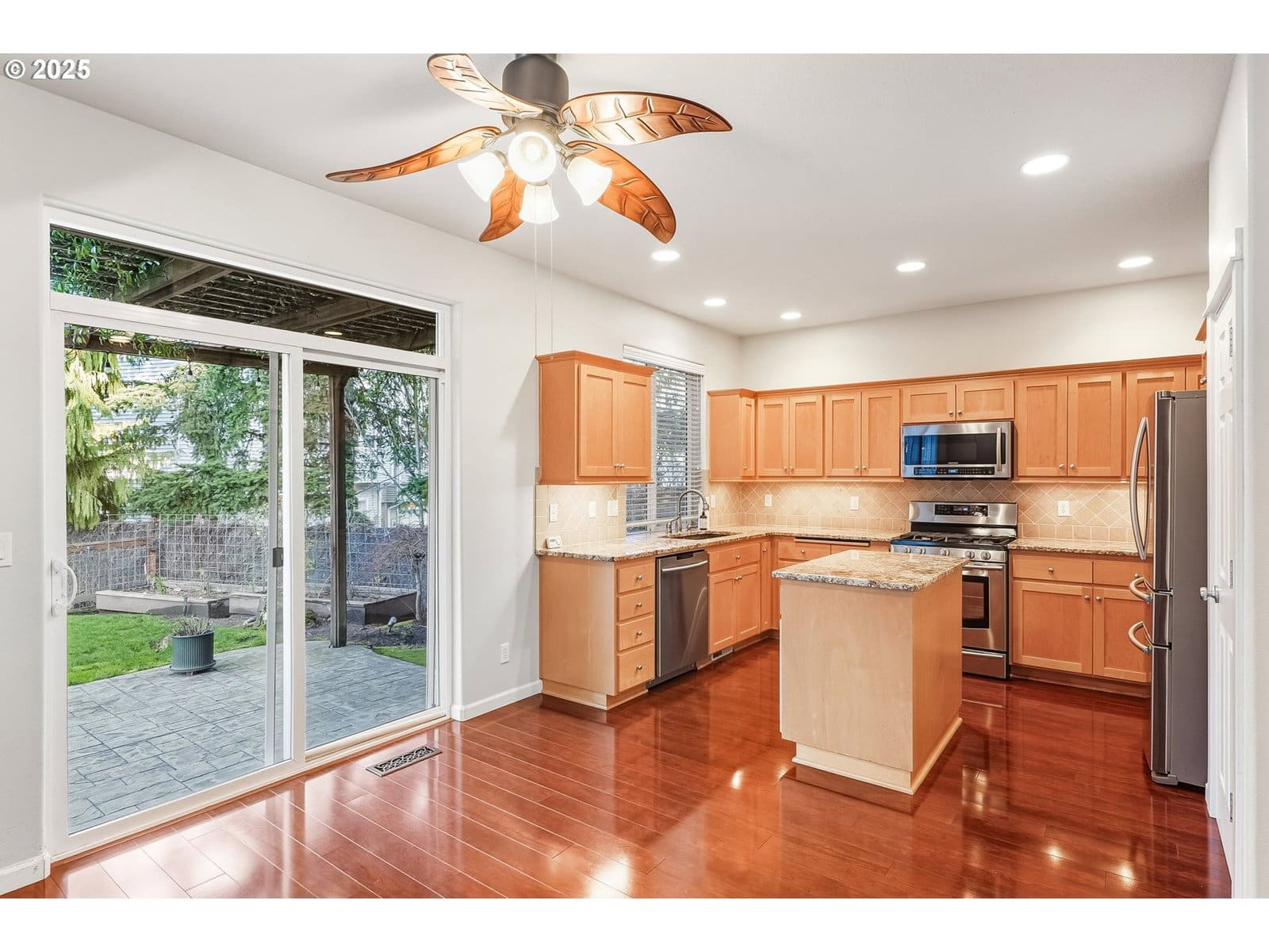 Exceptional opportunity to own a welcoming home on a desirable corner lot, offering peaceful outdoor spaces and a prime location right across from Progress Ridge with shopping and dinning. This inviting residence pairs timeless charm with thoughtful updates, including a newer roof (2020) and fresh interior and exterior paint (2024). The main living spaces are filled with natural light from large windows and feature engineered hardwood floors throughout. The family room is anchored by a gas fireplace and flows effortlessly into the dining area with sliding glass doors to the backyard patio, creating a seamless connection to the outdoors. The kitchen offers granite countertops, stainless steel appliances, a gas range, built-in microwave, pantry, and center island, well suited for both daily living and entertaining. Upstairs, the primary suite features double doors, a walk-in closet and an ensuite with double sinks, a walk-in shower, and a skylight. Three additional bedrooms and a versatile loft provide flexibility for a variety of needs. The backyard is a standout feature, designed for relaxation and enjoyment with a vine-wrapped pergola, custom paver patio, water feature with pond, garden boxes, and mature landscaping, all fully fenced for privacy. Additional highlights include RV parking, a tool shed, exterior lighting, and an in-ground sprinkler system. Ideally situated near Progress Ridge, this property offers the comfort of a quiet residential setting with quick access to shopping, dining, and major routes.