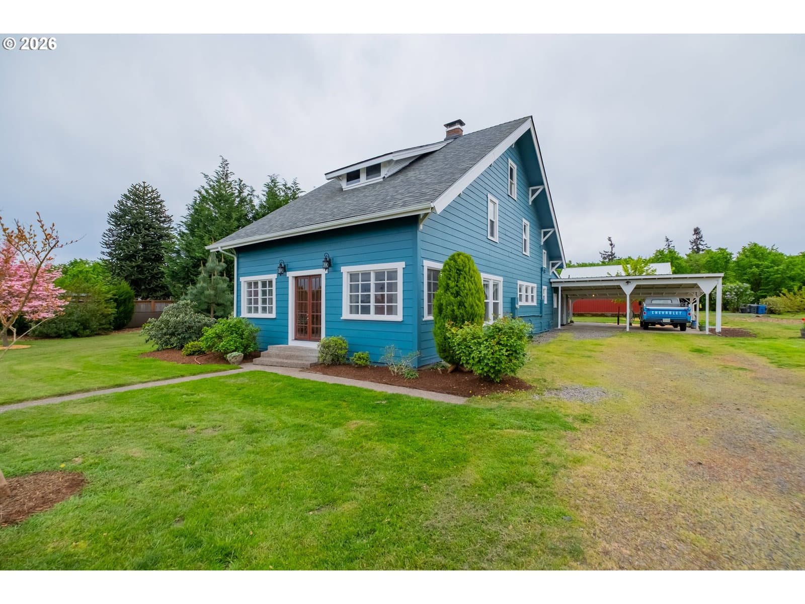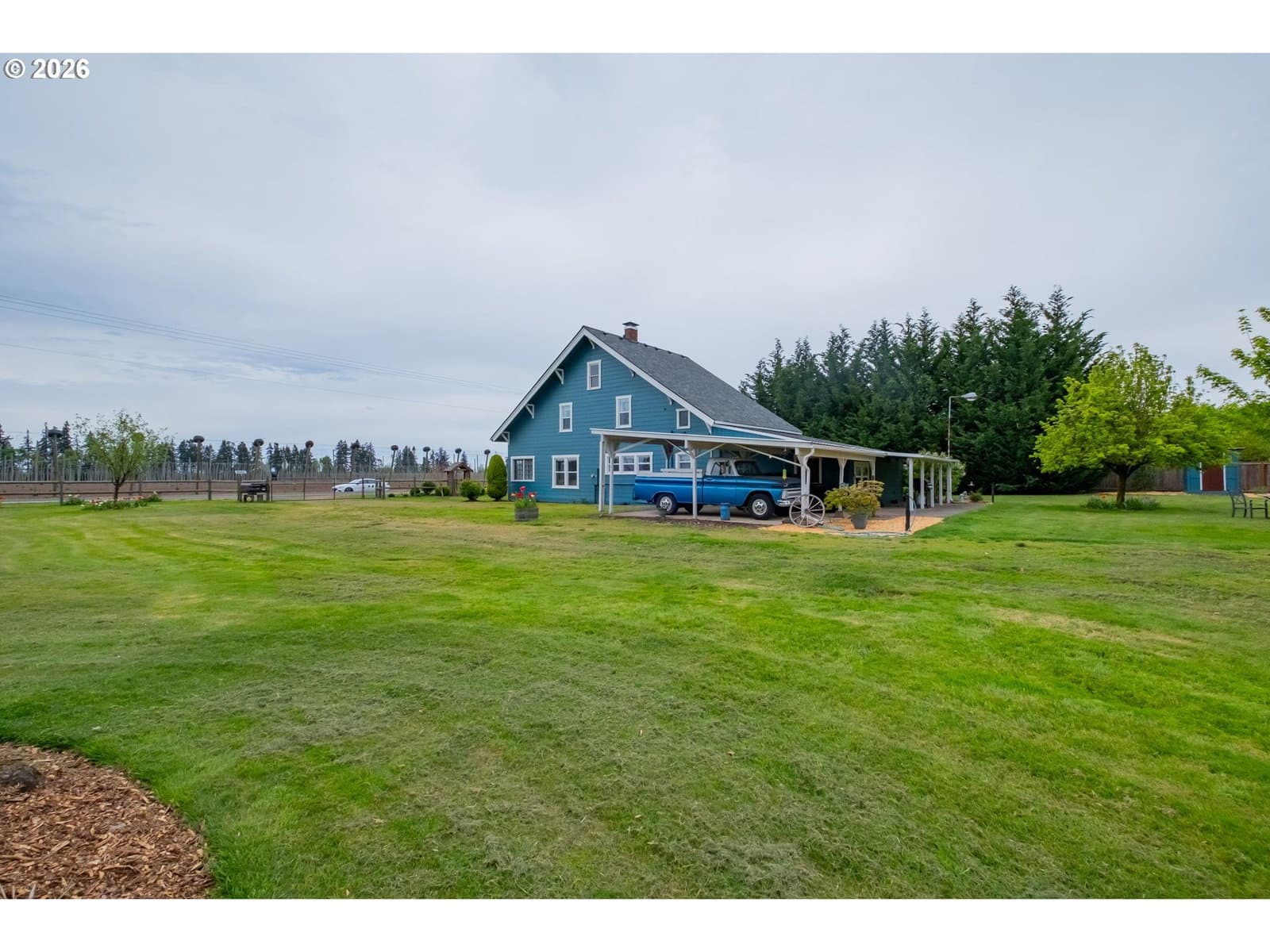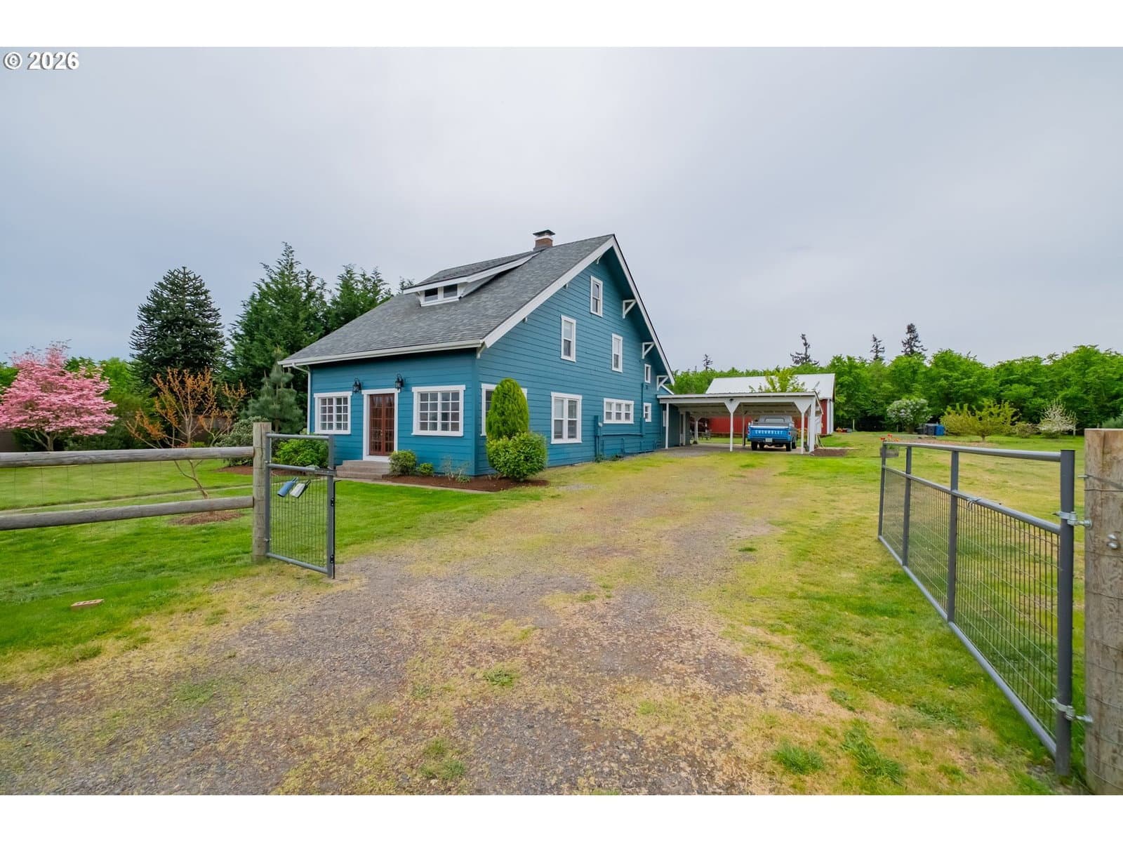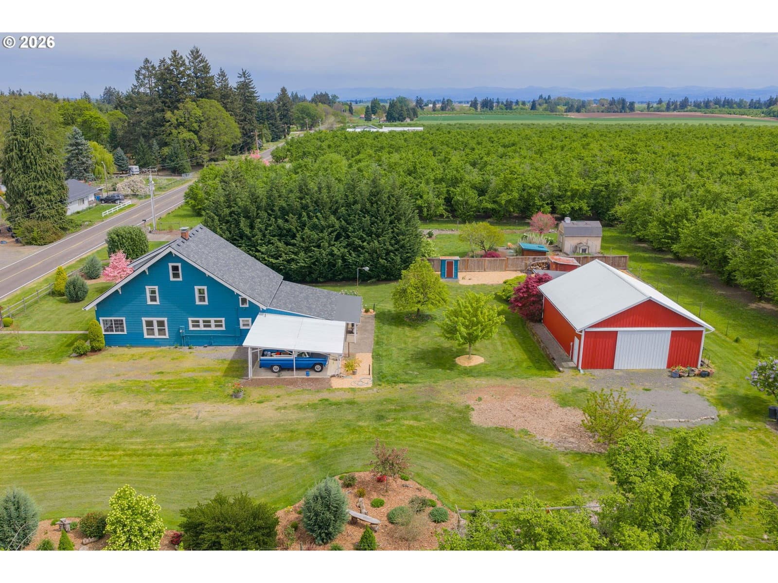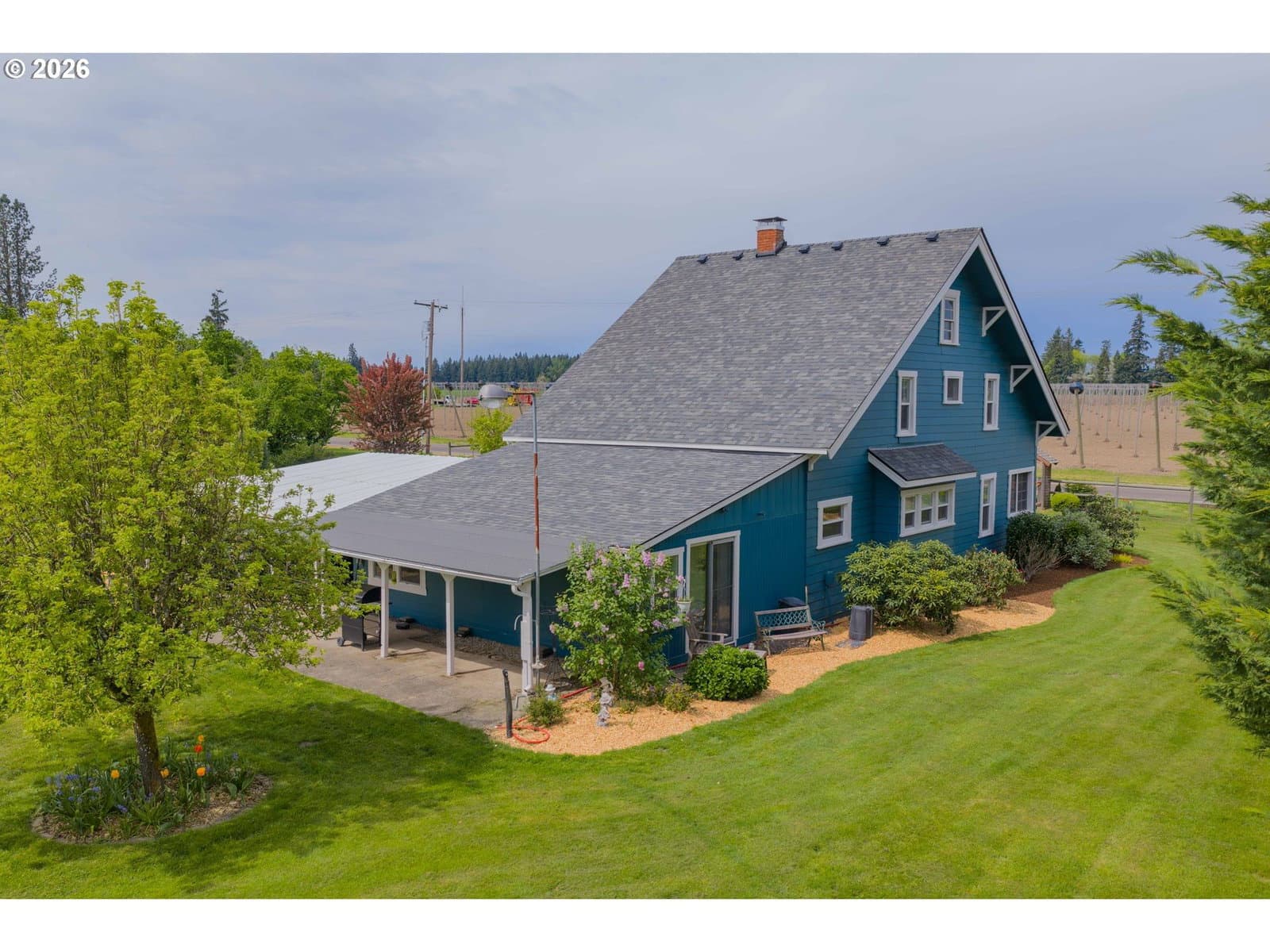 Step into a rare blend of history, comfort, and country living in this beautiful 1910 Craftsman on 0.85 acres, surrounded on three sides by orchards and farmland. With low county taxes, usable land, multiple outbuildings, and flexible living spaces, this home offers rare affordability and long term versatility in a lovely community. Thoughtfully updated while preserving its original character, this home features a new roof (March 2024), updated windows (2021), fresh interior and exterior paint, and a new stainless steel refrigerator. The kitchen features butcher block countertops [that flows] into a formal dining room with built in buffet and hutch. Original hardwood floors are preserved in many rooms, complemented by new LVP flooring in select areas. Additional spaces include a traditional wood pantry, sunroom, reading nook, flex room, and utility room. The main home rests on a poured foundation and is heated by forced air, with high speed internet available. The well system was updated in 2016 with a new pump and raised casing. Outdoors, the property features a fully fenced perimeter, solar powered gate opener (2021), ample parking, and a two car carport. The 30 x 36 barn has a 6 inch concrete floor and100 amp subpanel. While the adjacent 25 x 15 historic wood shop is equipped with 50 amp power. Here you have year round beauty with drought tolerant perennials, flowering shrubs, ornamental grasses, and seasonal blooms. A strawberry patch, large garden area, established fruit trees and berries including Bartlett pear, sweet cherry, Honeycrisp apple, marionberries, and blueberries. Located only 4 minutes to Jones Farm Produce, 10 minutes to Keizer Station, and 12 minutes to Woodburn Premium Outlets. Quick access to I5 makes commuting simple, while Wheatland Ferry and Willamette Mission State Park are nearby.