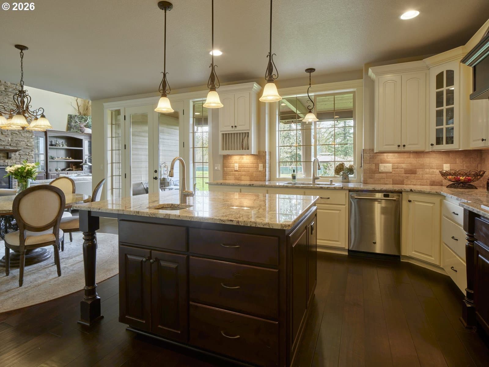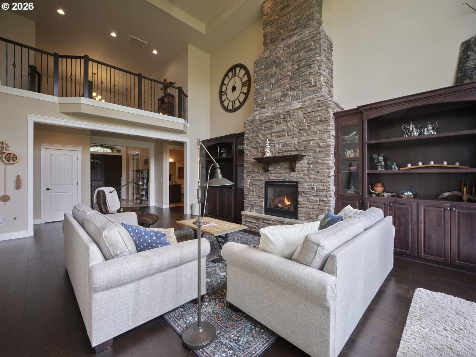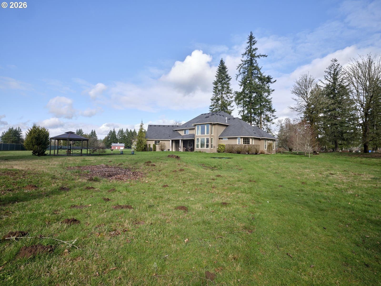 Come experience and fall in love with this exceptional French Country home- CUSTOM BUILT to perfection & nestled on 5 lovely acres! Take in breathtaking Pacific Northwest sunrises & sunsets! Here, you'll find peace, privacy, and endless possibilities! NO HOA means abundant space for outbuildings, ADU, animals, or whatever you desire! Set back from the road and adjacent to gated community makes for a tranquil setting ideal for walking & outdoor enjoyment. *The EXPANSIVE GREAT ROOM showcases soaring 20-FOOT CEILING, a dramatic west-facing wall of windows, dual ceiling fans, and impressive floor-to-ceiling stone fireplace flanked by custom built-in bookcases with elegant glass doors. *A private office features double glass French doors and built-in custom cabinetry. *The GOURMET KITCHEN is beautifully appointed with custom cabinetry, decorative oven hood, granite countertops, large island with sink, butler’s pantry, and an expansive walk-in pantry— perfect for entertaining & daily living. *The MAIN FLOOR PRIMARY SUITE is a luxurious retreat, offering a spacious bedroom, spa-inspired bath with dual vanities, jetted soaking tub, massive doorless dual-head shower, and a generous walk-in closet. High ceilings throughout (10’ in primary, 9’+ in main living areas), solid wood French entry door, and Italian travertine entry add to the home’s refined elegance. *Upstairs features a vaulted 2nd bedroom with full bath, abundant storage including a bedroom-sized storage room, and walk-in closets in all bedrooms. *A hidden custom bookcase door leads to a 415 SQ FT BONUS ROOM with LED lighting, refrigerator, direct-vent fireplace heater, and attic storage access— ideal for media, fitness, or hobby space. Oversized 1,500 sq ft garage has 4.5 bays and SHOP area- w/ LED lighting, workbench, utility sink, 220V outlets. *Dual zoned heat pump w/ back-up furnace & oversized propane tank. Gazebo with slate floor & path, Sprinklers & RV PAD. NOT ONE THING MISSING- THIS ONE TRULY HAS IT ALL!
