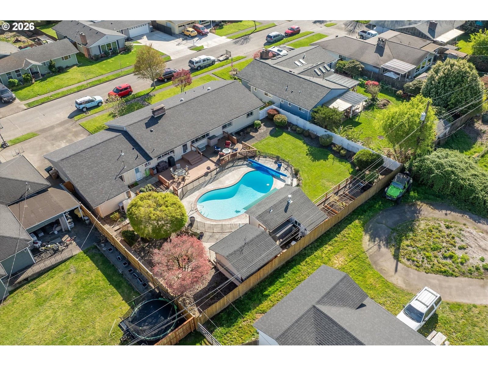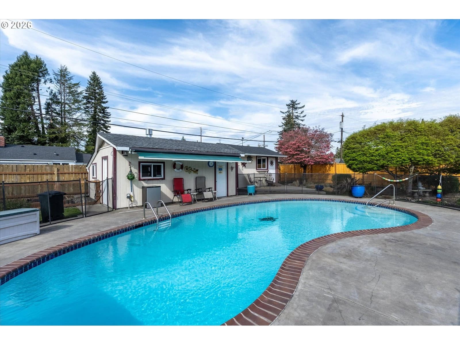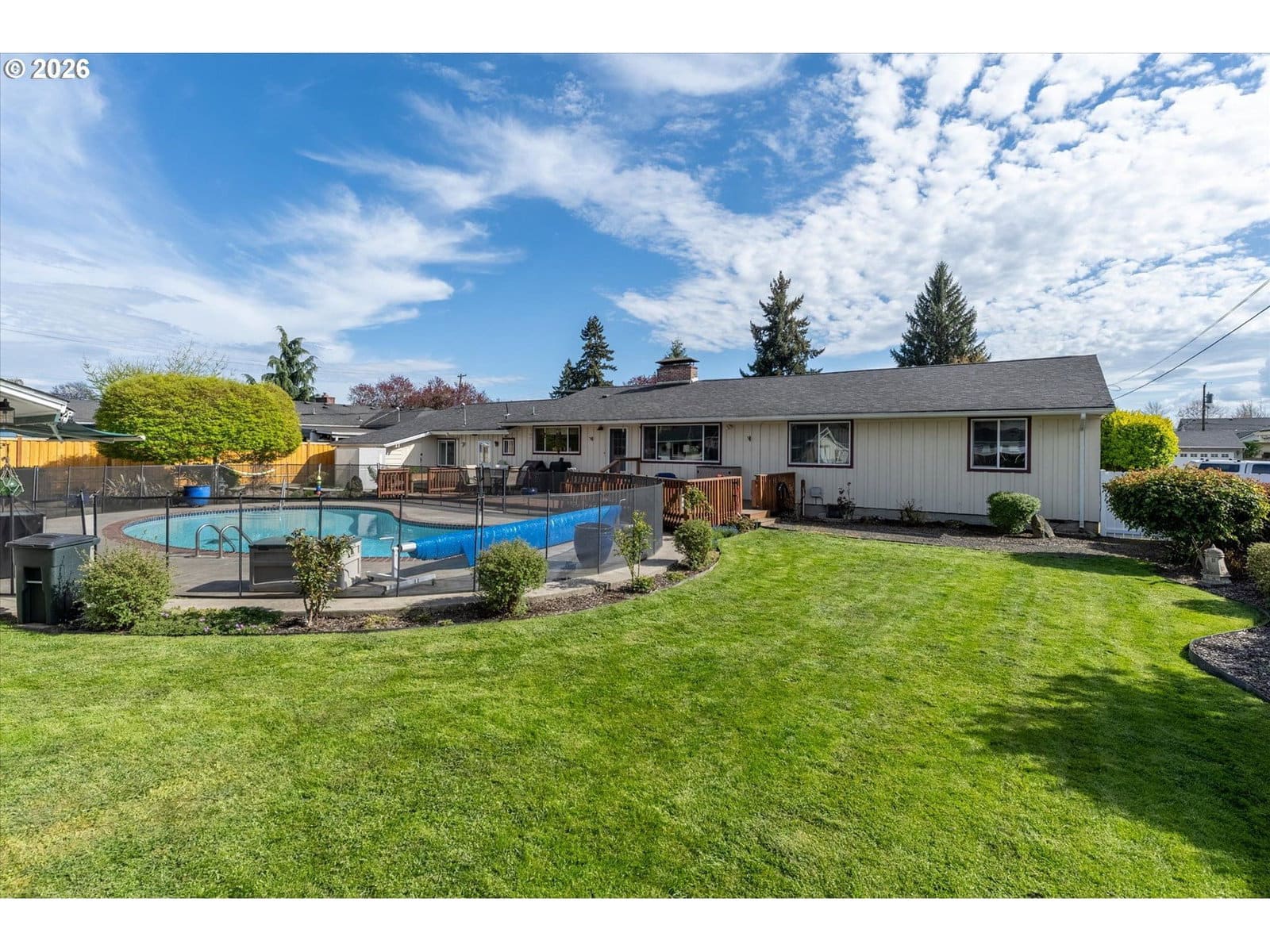 Just a short distance from Lake Sacajawea, this exceptional one level home offers nearly 2,500 square feet of comfortable, well designed living space on a beautifully landscaped 15,000 sq ft lot. Featuring 3 Bedrooms and 3 Bathrooms, the home blends warmth, function, and thoughtful updates throughout. The spacious Living Room, large enough for a piano, centers around a cozy gas fireplace and provides a welcoming space to gather or entertain. The updated Kitchen is both stylish and functional, featuring stainless steel appliances, a center cooking island, granite countertops, an indoor gas grill, and an inviting eating area that flows seamlessly into a generous formal Dining room, ideal for hosting dinners or holidays. A separate Family room offers a relaxed setting for everyday living and could easily serve as a second Primary Suite, guest quarters, or multi generational living space. Highlighted by open beam and tongue and groove wood ceilings, along with a blend of ceramic tile and bamboo flooring that adds warmth, texture, and character throughout the home, this home is very cool. The Primary Suite offers a true retreat with a spa like bath featuring a garden tub, chandelier & heated towel rack, creating a comfortable and private escape. Step outside to your private backyard oasis with a gas-heated 18x35 in-ground pool with security fence, expansive decking, sauna, garden beds, and mature landscaping including azaleas, rhododendrons, and a stunning mature Japanese Maple and Dogwood tree, all within a fully fenced setting with outdoor gas fireplace designed for both relaxation and entertaining. Additional highlights include smart lighting, forced air heating and cooling with a heat pump for year round efficiency, vinyl windows, a newer roof, updated electrical panel, and a new sewer line, providing peace of mind for years to come. Complete with an attached garage, off street parking, and versatile outbuildings, this property truly has it all.