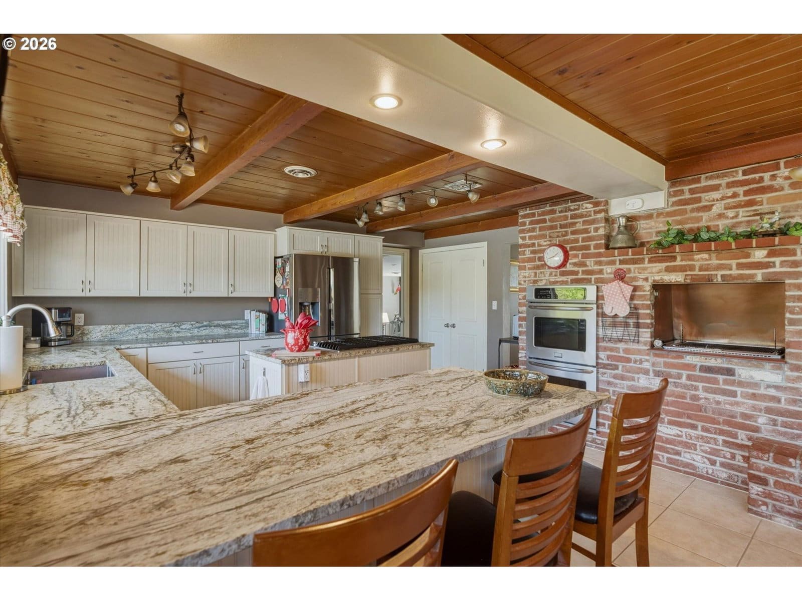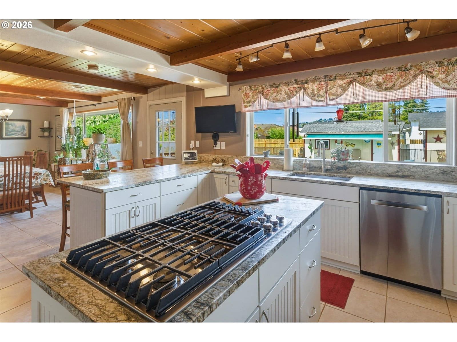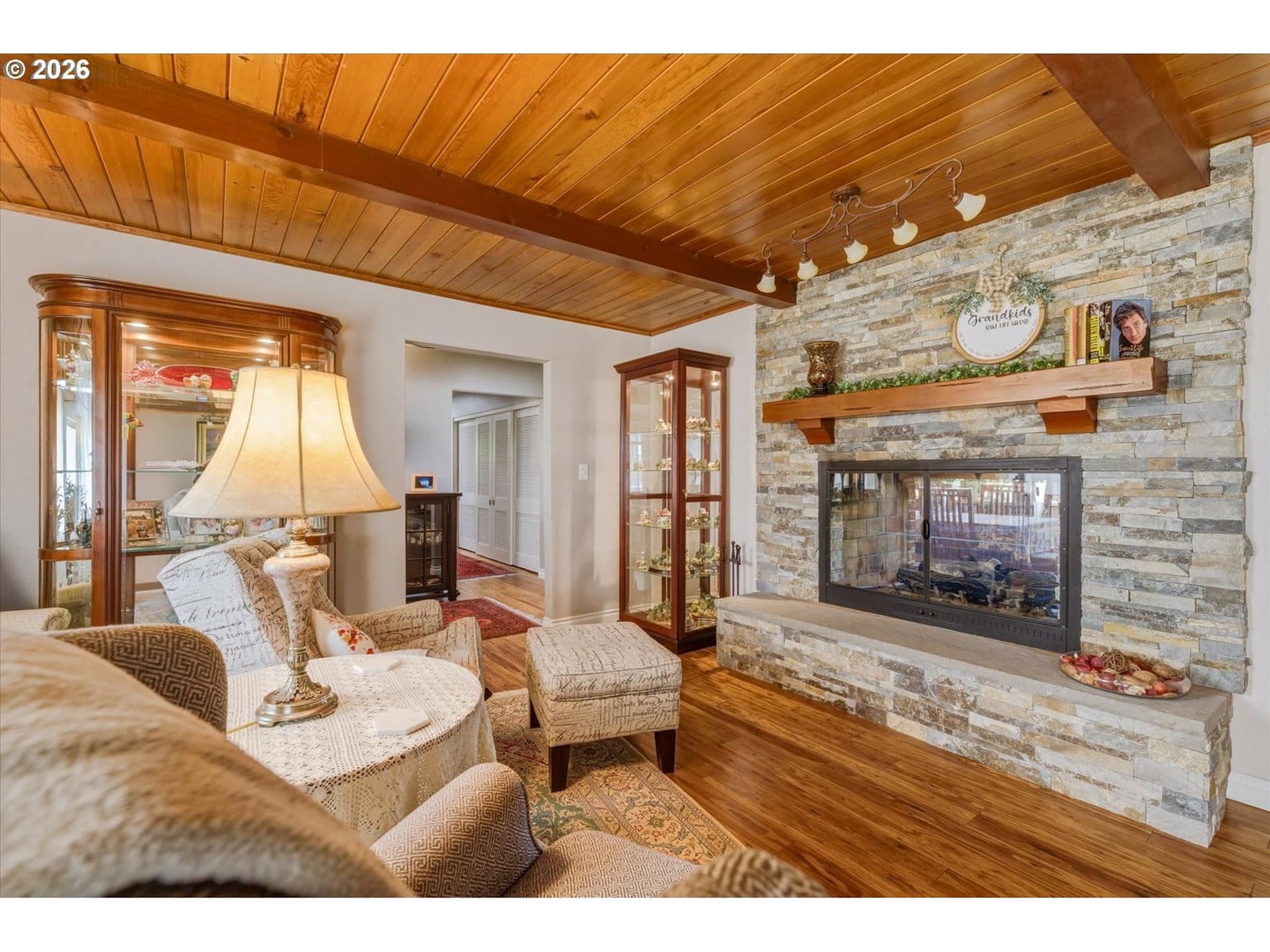 Just a short distance from Lake Sacajawea, this exceptional one level home offers nearly 2,500 square feet of comfortable, well designed living space on a beautifully landscaped 15,000 sq ft lot. Featuring 3 Bedrooms and 3 Bathrooms, the home blends warmth, function, and thoughtful updates throughout. The spacious Living Room, large enough for a piano, centers around a cozy gas fireplace and provides a welcoming space to gather or entertain. The updated Kitchen is both stylish and functional, featuring stainless steel appliances, a center cooking island, granite countertops, an indoor gas grill, and an inviting eating area that flows seamlessly into a generous formal Dining room, ideal for hosting dinners or holidays. A separate Family room offers a relaxed setting for everyday living and could easily serve as a second Primary Suite, guest quarters, or multi generational living space. Highlighted by open beam and tongue and groove wood ceilings, along with a blend of ceramic tile and bamboo flooring that adds warmth, texture, and character throughout the home, this home is very cool. The Primary Suite offers a true retreat with a spa like bath featuring a garden tub, chandelier & heated towel rack, creating a comfortable and private escape. Step outside to your private backyard oasis with a gas-heated 18x35 in-ground pool with security fence, expansive decking, sauna, garden beds, and mature landscaping including azaleas, rhododendrons, and a stunning mature Japanese Maple and Dogwood tree, all within a fully fenced setting with outdoor gas fireplace designed for both relaxation and entertaining. Additional highlights include smart lighting, forced air heating and cooling with a heat pump for year round efficiency, vinyl windows, a newer roof, updated electrical panel, and a new sewer line, providing peace of mind for years to come. Complete with an attached garage, off street parking, and versatile outbuildings, this property truly has it all.