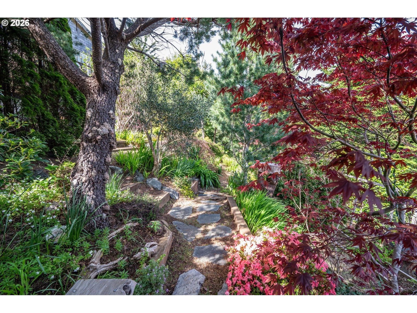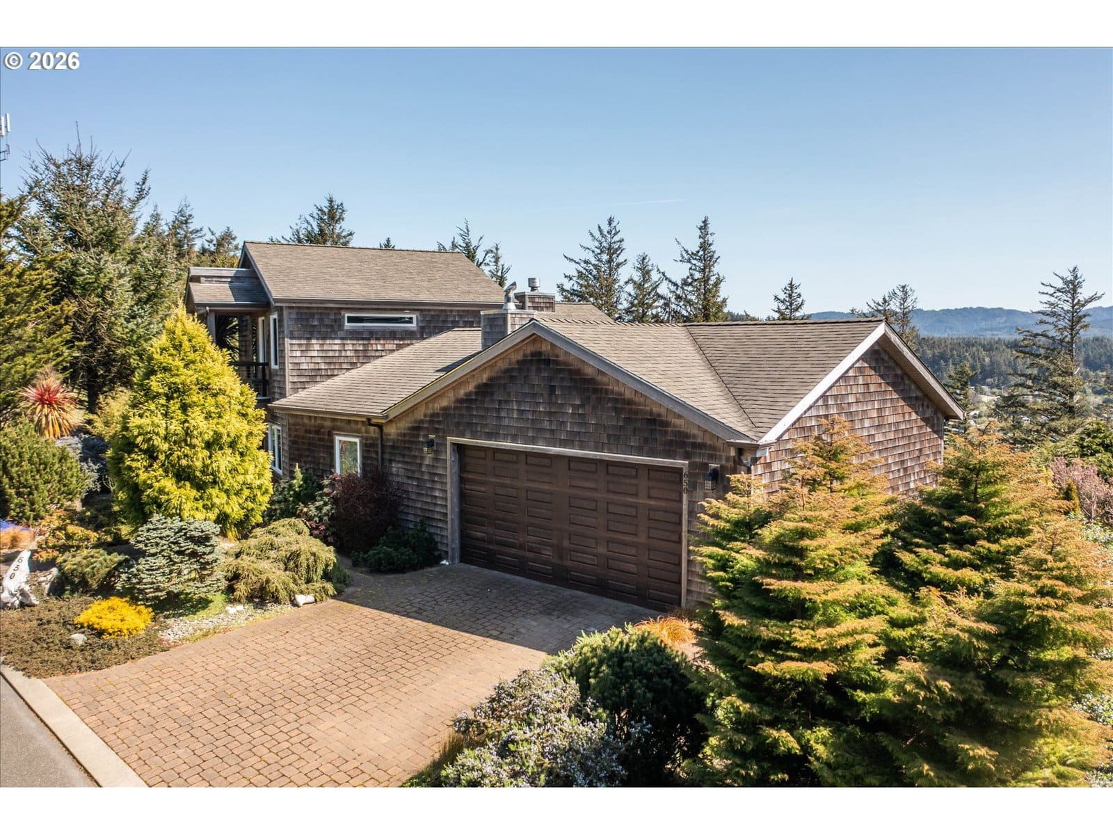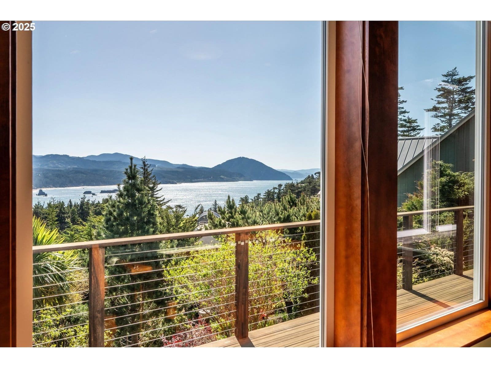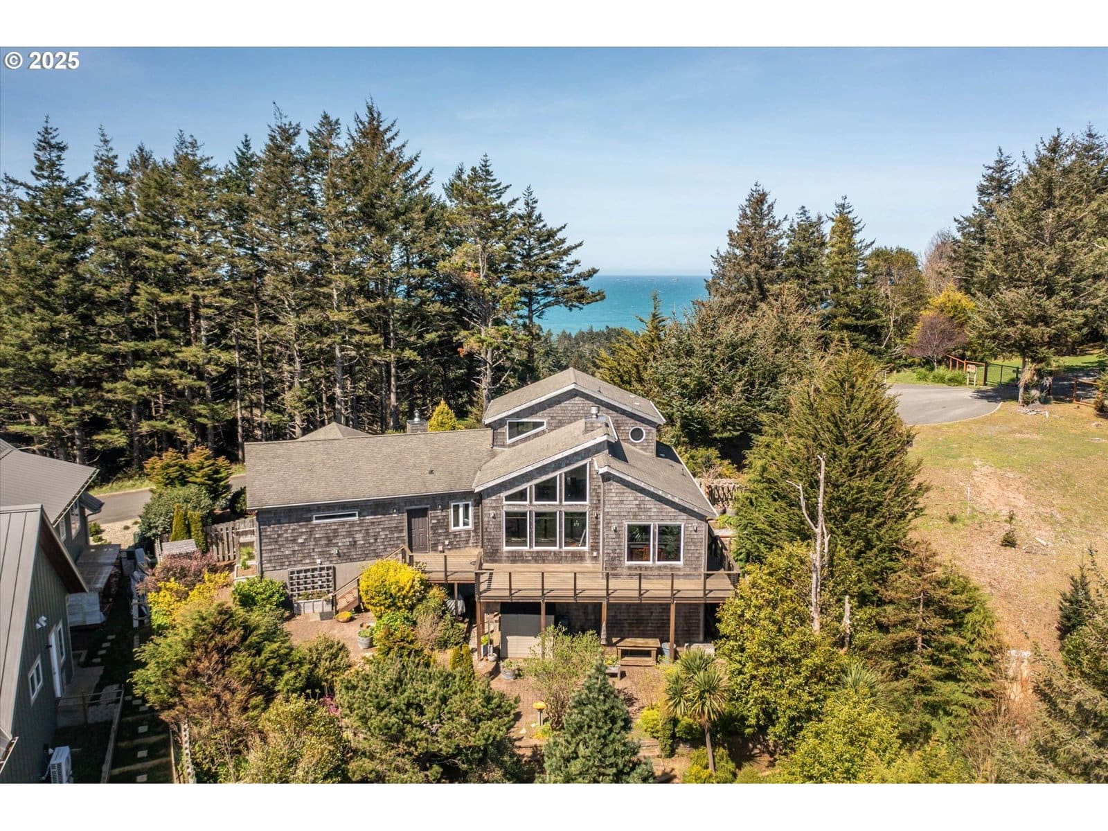 Experience the best of Oregon Coast living in this exceptional home featuring unobstructed panoramic views of both the Ocean and surrounding Mountains, just moments from Coast Guard Hill State Park. Thoughtfully designed to capture natural beauty, expansive hemlock-trimmed windows fill the home with natural light and frame breathtaking scenery from nearly every room. Inside, rich red oak hardwood floors flow throughout, complementing the warm, inviting aesthetic. The gourmet kitchen is a standout with custom cherry wood cabinetry, granite countertops, and a spacious pantry—perfect for both everyday living and entertaining. The primary suite is a true retreat, offering a private Ocean-view deck, a luxurious soaking tub, and an oversized walk-in closet. A versatile utility and craft room with a cozy woodstove adds function and charm. Step outside to a beautifully landscaped, terraced backyard featuring fencing, raised garden beds, stone pavers, and a multi-level patio—ideal for outdoor living and enjoying the Coastal climate. Additional highlights include an extra-deep two-car garage with a loft for ample storage. This property offers a rare combination of craftsmanship, comfort, and unbeatable location.