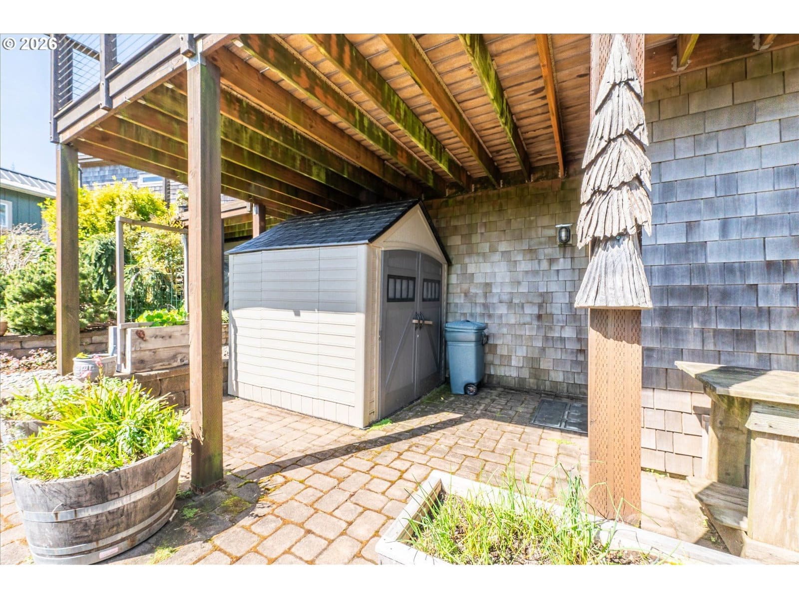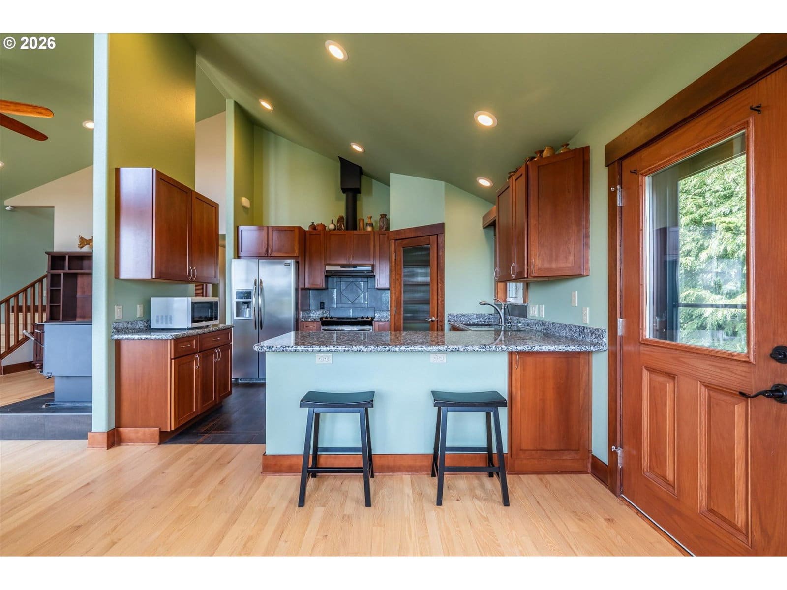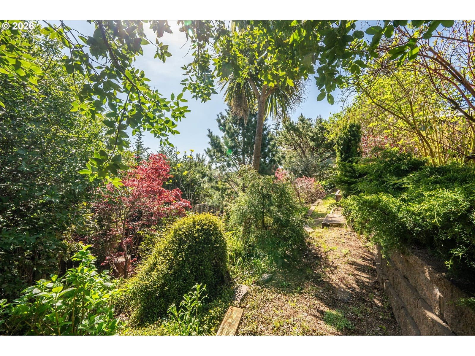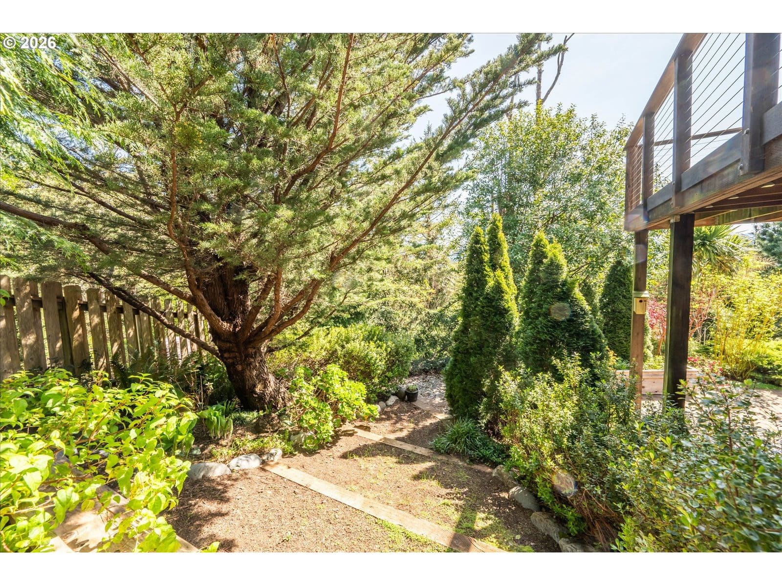 Experience the best of Oregon Coast living in this exceptional home featuring unobstructed panoramic views of both the Ocean and surrounding Mountains, just moments from Coast Guard Hill State Park. Thoughtfully designed to capture natural beauty, expansive hemlock-trimmed windows fill the home with natural light and frame breathtaking scenery from nearly every room. Inside, rich red oak hardwood floors flow throughout, complementing the warm, inviting aesthetic. The gourmet kitchen is a standout with custom cherry wood cabinetry, granite countertops, and a spacious pantry—perfect for both everyday living and entertaining. The primary suite is a true retreat, offering a private Ocean-view deck, a luxurious soaking tub, and an oversized walk-in closet. A versatile utility and craft room with a cozy woodstove adds function and charm. Step outside to a beautifully landscaped, terraced backyard featuring fencing, raised garden beds, stone pavers, and a multi-level patio—ideal for outdoor living and enjoying the Coastal climate. Additional highlights include an extra-deep two-car garage with a loft for ample storage. This property offers a rare combination of craftsmanship, comfort, and unbeatable location.