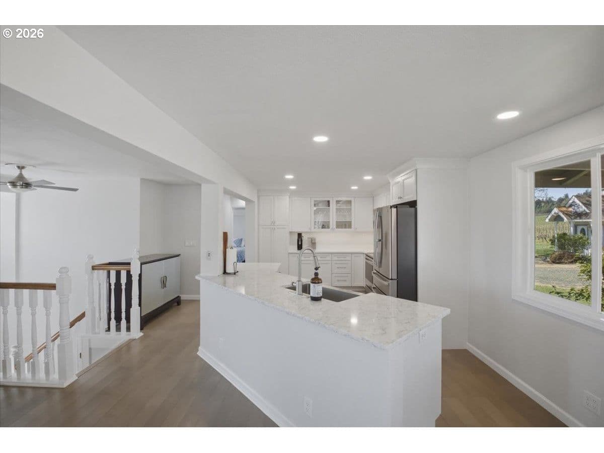 Absolutely stunning remodel on this beautiful home perched in the heart of a 30-acre vineyard, tucked at the end of a long gated private driveway. Enjoy sweeping views over mature Pinot Gris and Pinot Noir vines and the valley below. A peaceful, private setting perfect for entertaining and gatherings. This could be a great equestrian property with plenty of usable land for horses or your other critters. Ideal location with convenient access to both Eugene and Corvallis for your occasional urban needs. See Associated Documents for Important Details.